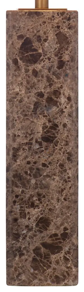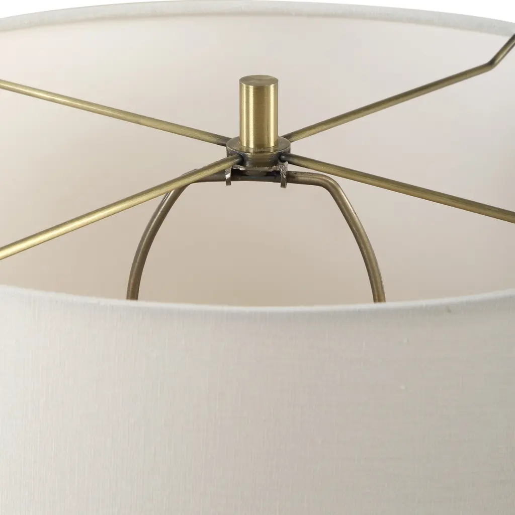 The table lamp is a symphony of natural beauty and classic design. Its base, exudes a touch of earthy elegance, whispering of natural wonders. Topped with a slightly tapered round shade the lamp casts a soft, inviting glow. It's a timeless piece that seamlessly complements any décor, adding a touch of warmth and sophistication to your home. Product Features: Earthy toned table lamp Accented with antique brass plated details Includes a tapered hardback shade Lamp uses (1) 150-watt TYPE A bulb - not included Socket type: 3-way UL listed for indoor use Dimensions: Overall dimensions: 24.5" high x 16" diameter Shade height: 10" high Top shade diameter: 15" diameter Bottom shade diameter: 16" diameter Material(s): steel/glass/fabric