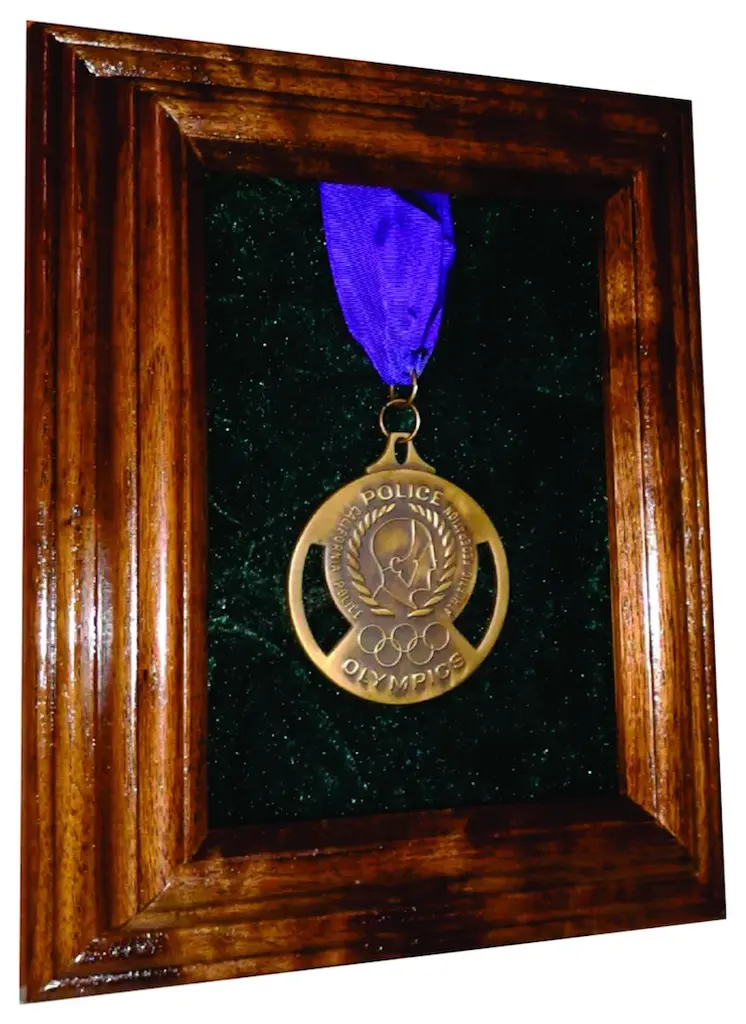 Solid Walnut Single Medal Display Case. Blue velvet backing. This Display Case is perfect to display a Purple Heart Medal, service award, engraved plates, a single picture or whatever you choose.
