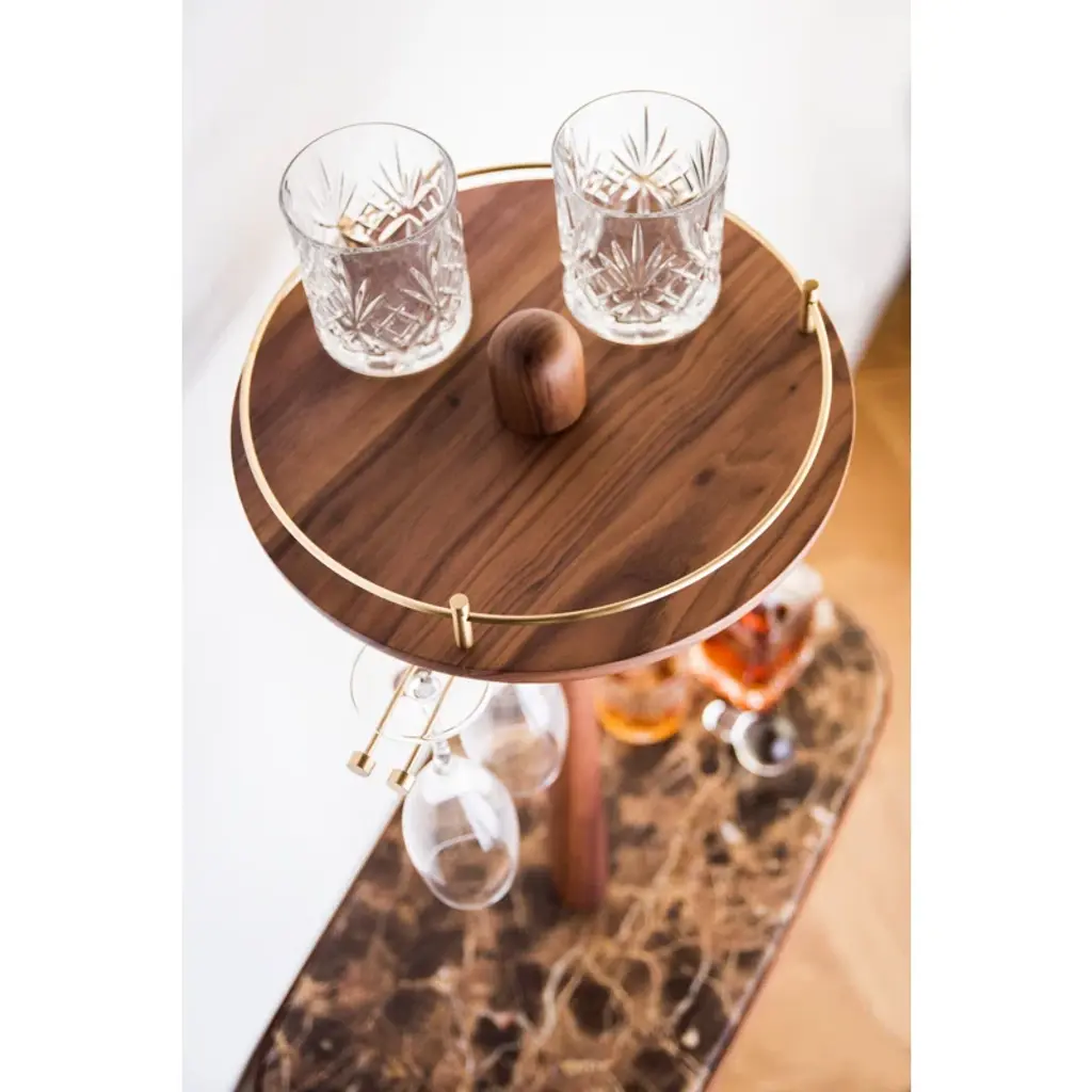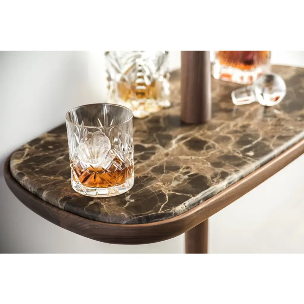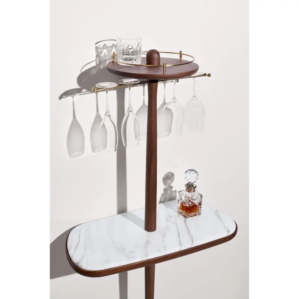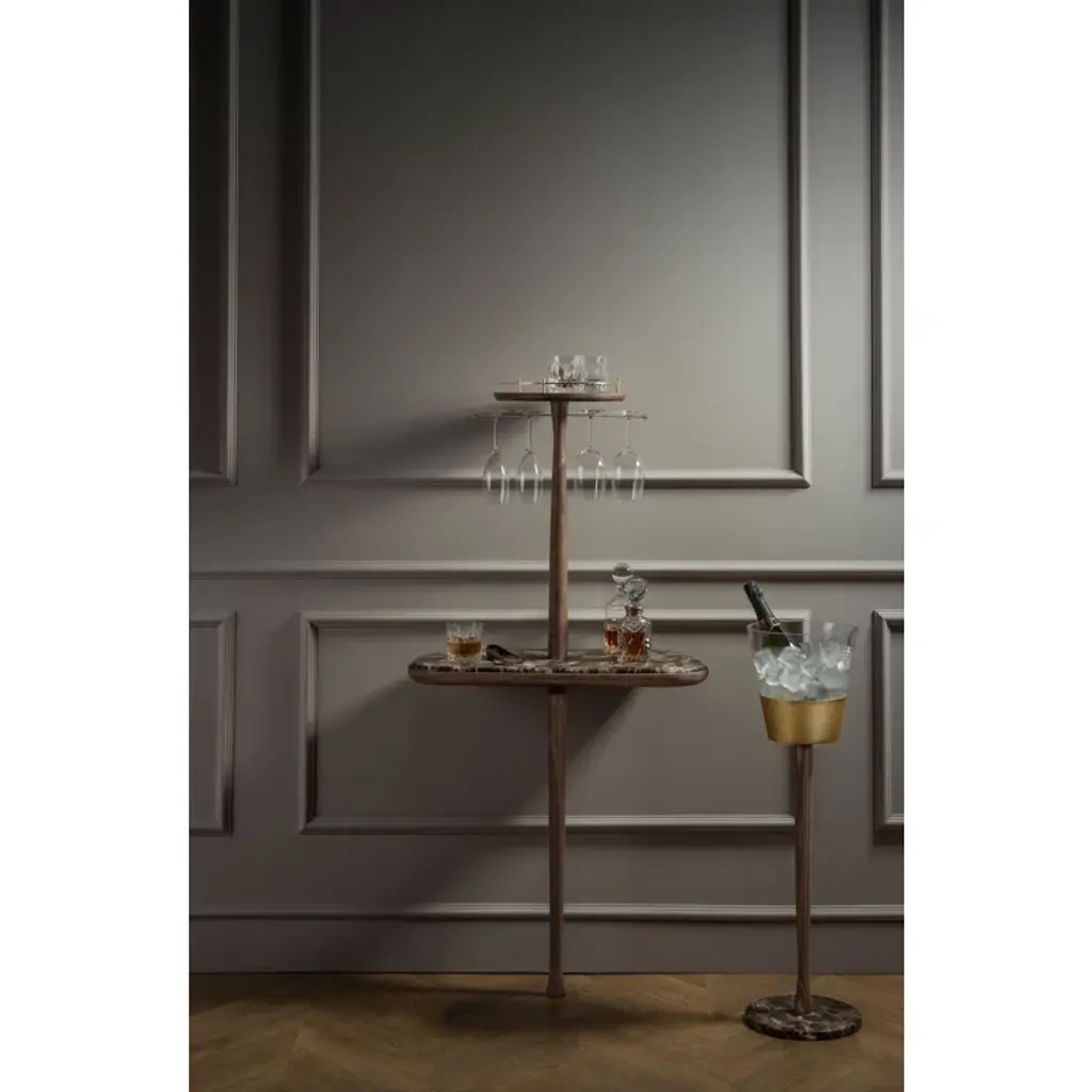 We create a space to enjoy a drink in good company. Marble top and suspended cups from the goldenrods evoke classical bar cabinets.