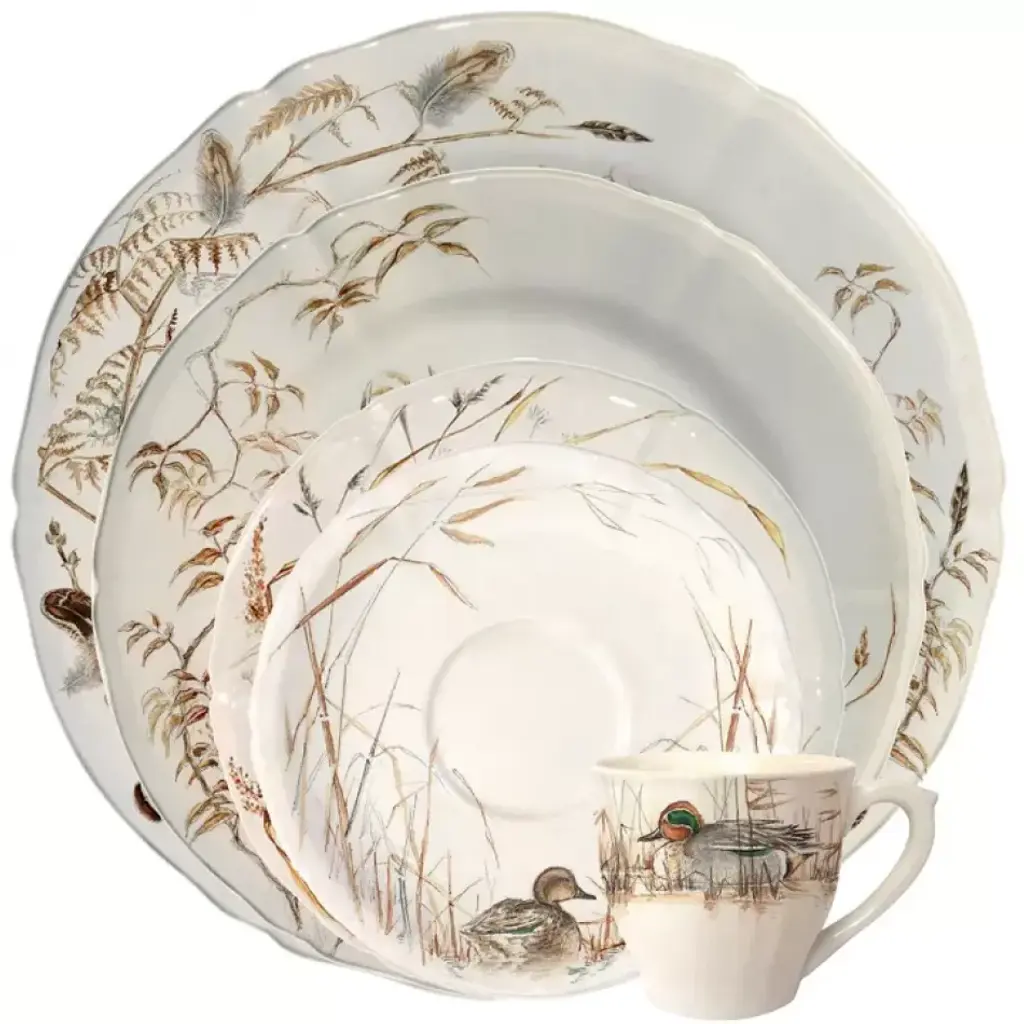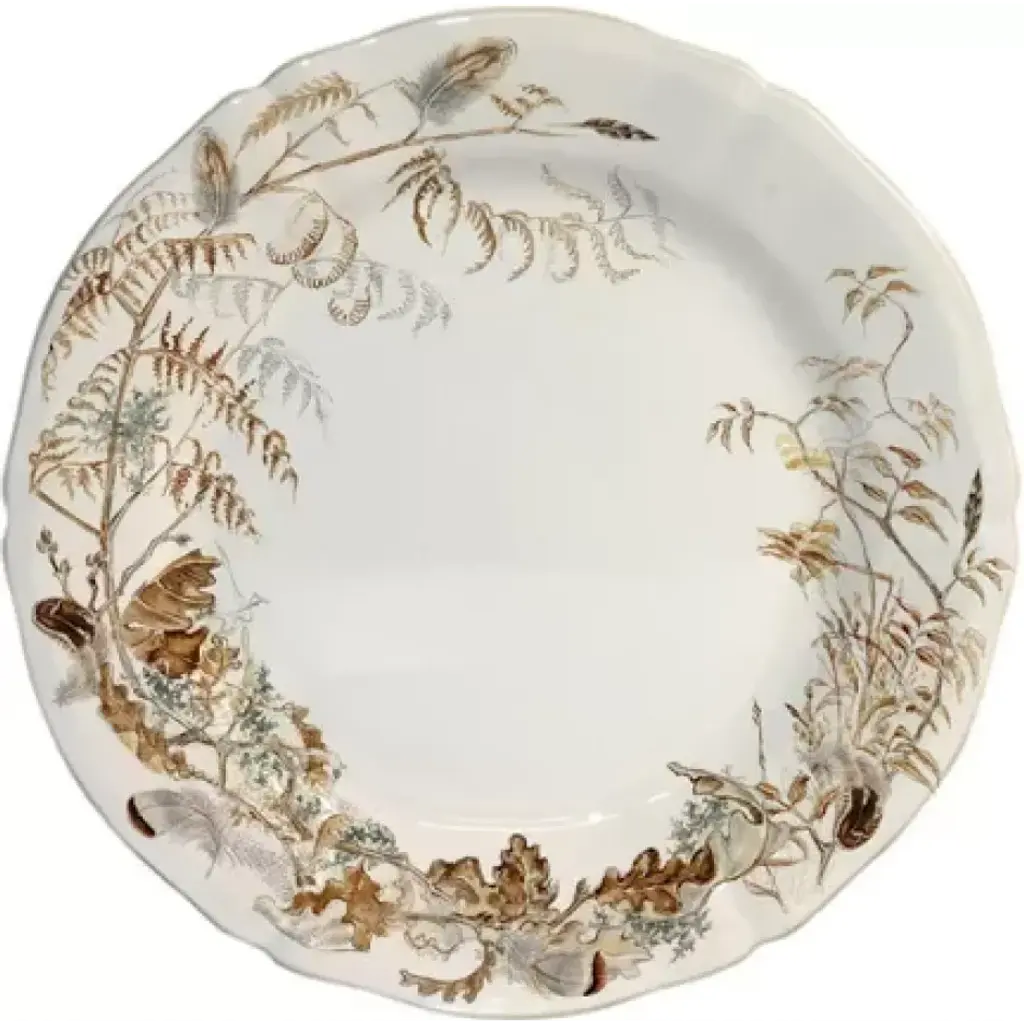 Perfect for mountainside retreats, Gien's Sologne dinnerware brings the outdoors in with wild rabbits, partridges, ferns, quail, and woodcocks. Designer Estelle Rebottaro, a professional animal painter, was inspired by the wildlife of Sologne and the hide-and-seek movements of the animals in the area. Faience earthenware made in France by Gien. Four-piece place setting includes dinner plate, dessert plate, bowl, and mug. Five-piece place setting includes dinner plate, dessert plate, canape plate, US tea cup, and saucer. Located near the Loire Valley castles, the Faïencerie de Gien has been synonymous with prestigious faience tableware and decorative objects since its founding in 1821. Gien pieces are renowned for their warm white clays decorated with traditional motifs reminiscent of the French countryside.