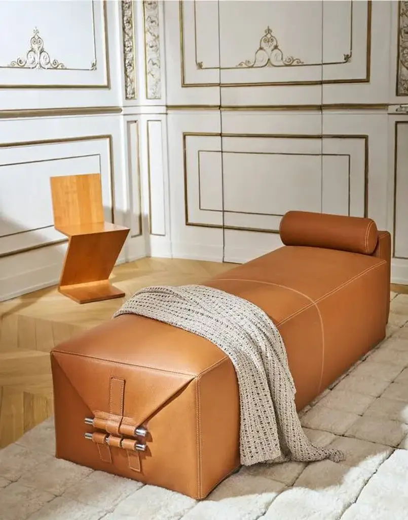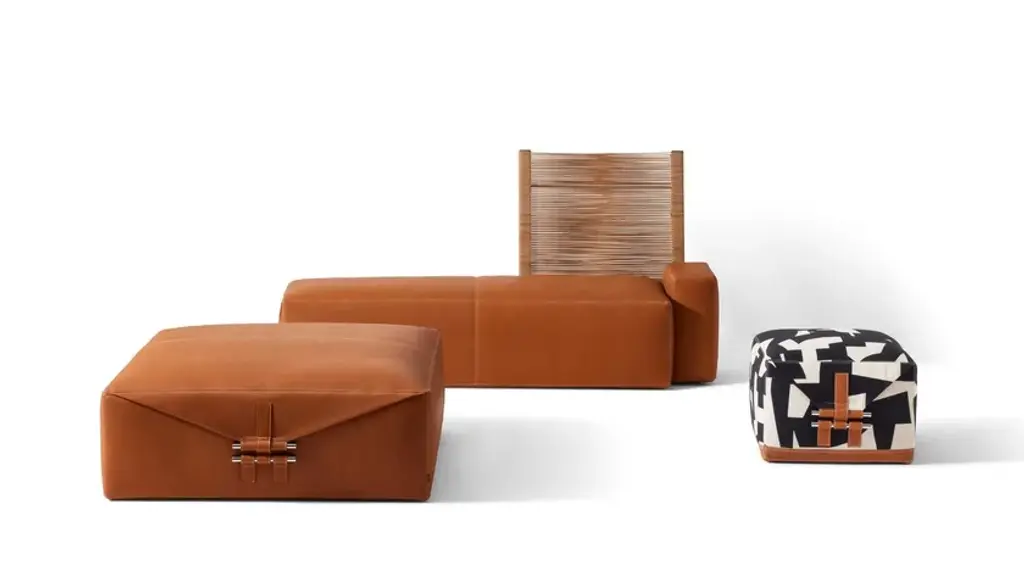 Daybed with leather or fabric seat, woven natural leather backrest, and 1 armrest on the right.Available in versions:- Bogolan Pattern fabric and leather profile- Bogolan Ecrù fabric and leather profile- Bogolan Nero fabric and leather profile- Voyage Naturale leather- Voyage Bruciato leather- Voyage Nera leather."Somewhere EL-S is a tribute by Philippe Starck to his 30-year collaboration with Cassina. The seating collection exhibits the finely tailored details typical of high fashion, transferred to the design of three ottomans – two square and one rectangular, that can also be used as daybeds with or without backrest – and an armchair, available in the same types. In its uniqueness, this creation reflects multiple influences – at times, a handbag or a suitcase and other times, a gift-wrapped package. An artisan-crafted closure, inspired by the world of saddlery, embellished with metal elements, further enhances the models. Common thread throughout, on the armchair this detail is found on the front while, on the ottomans, it is placed on two sides. The upholstery is available in two materials: a type of leather with a very thick grain in three colours, or in solid natural or black colour fabric, or fabric with an ethnic motif custom-designed by Philippe Starck. Padding for the seat and armrests is made of circular materials, like variable density polyurethane foam with a percentage of polyols derived from biological sources, encased in blown recycled PET fibre. Since there are no glued parts, the Somewhere EL-S Collection can be completely disassembled to facilitate recovery of the materials at the end of the product’s life cycle.