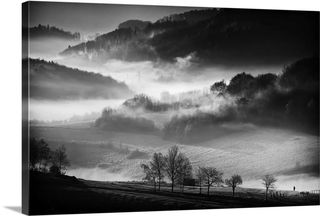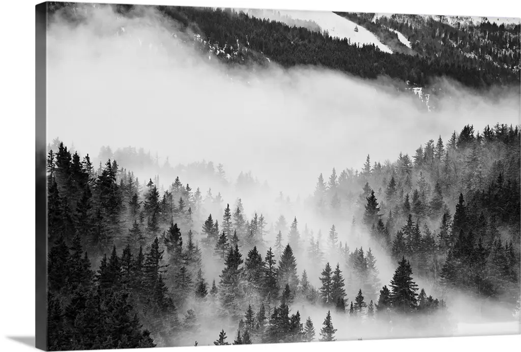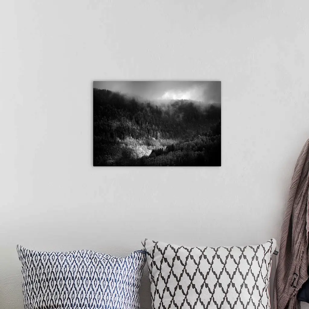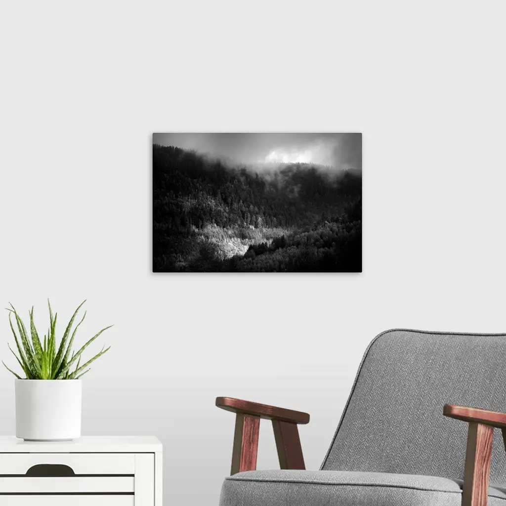 Black and white photograph of tree-filled rolling hills with low baring clouds covering the top.