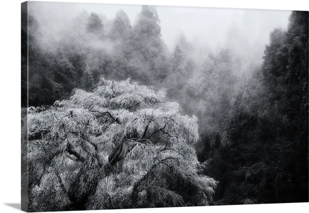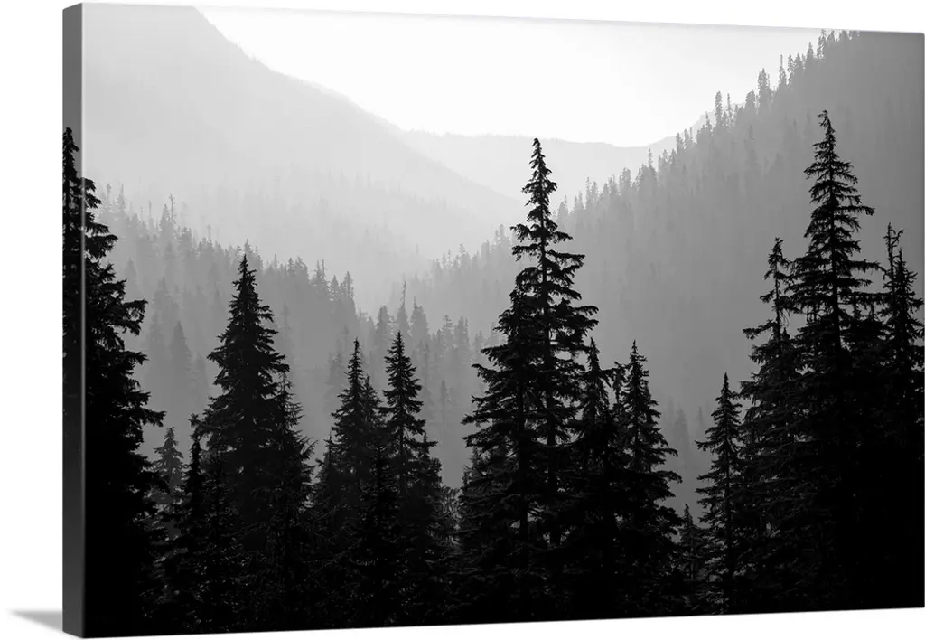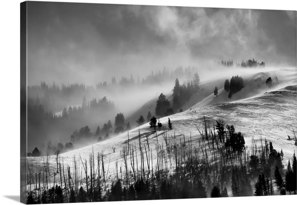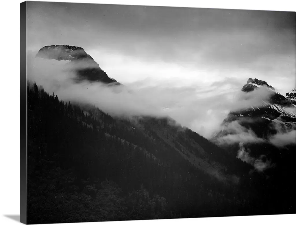 Black and white photograph of tree-filled rolling hills with low baring clouds covering the top.