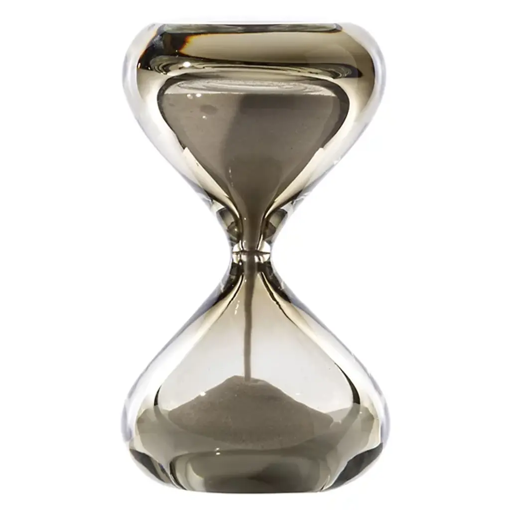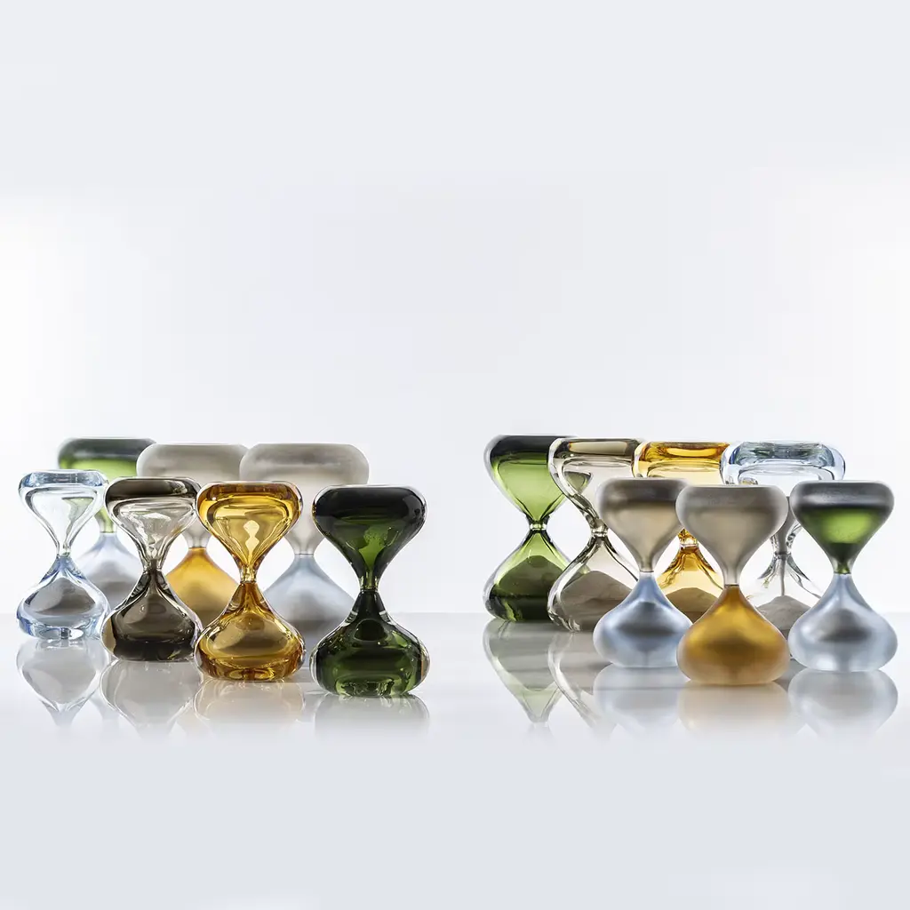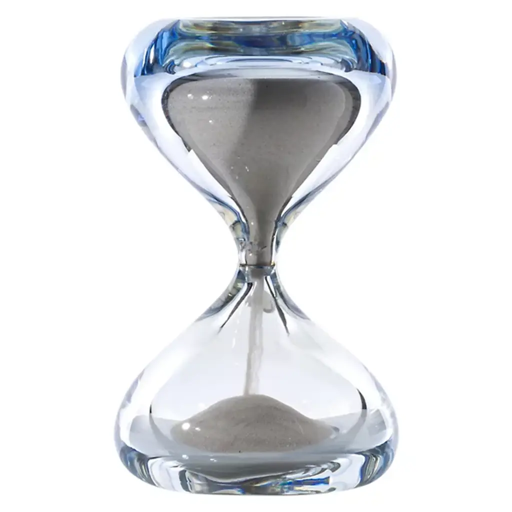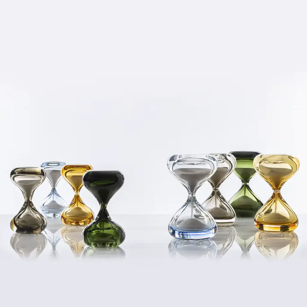 Ideal for adding a touch of timeless elegance to any space, this Venini hourglass features crystal-clear glass and soft grey sand, creating a captivating visual contrast. The sleek, smooth curves of the submerged glass form give it a minimalist, modern appeal. Perfect for a desk, bookshelf, or mantle, it functions both as a timekeeper and an artistic piece, inviting quiet reflection. This hourglass exemplifies Venini's craftsmanship, blending beauty and function effortlessly.