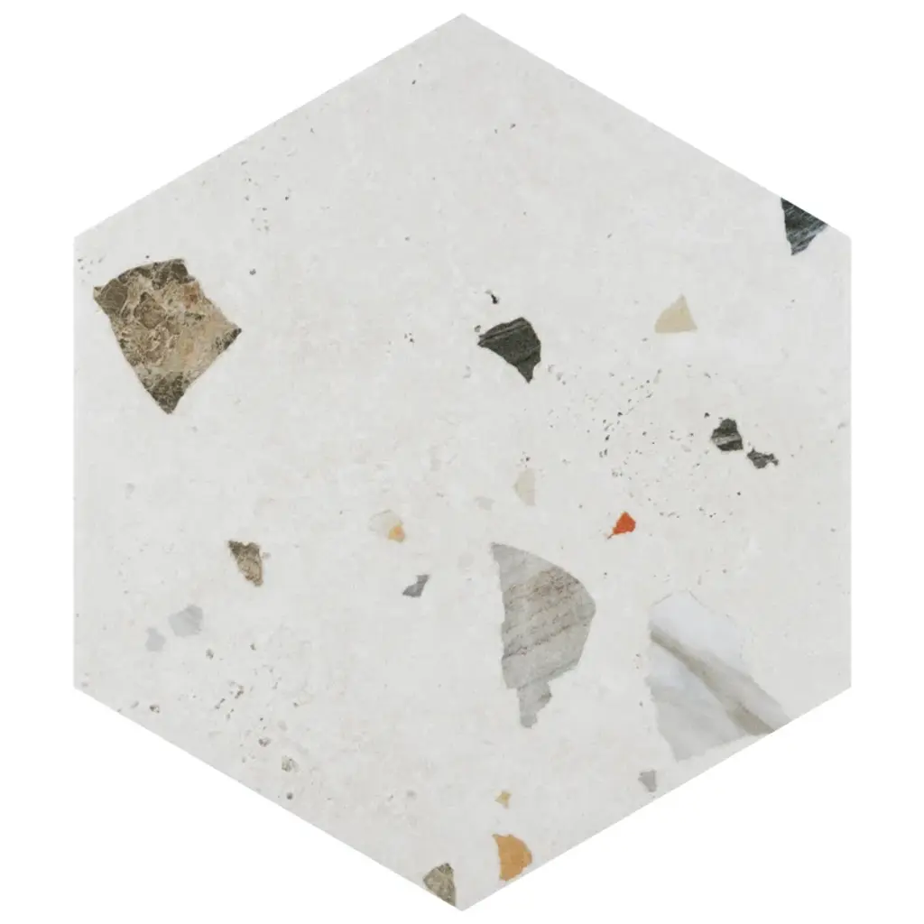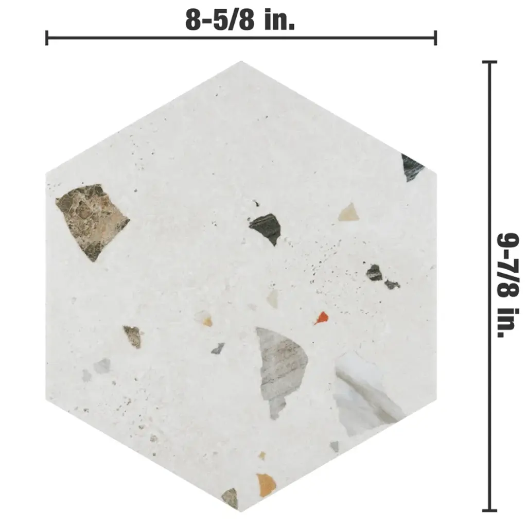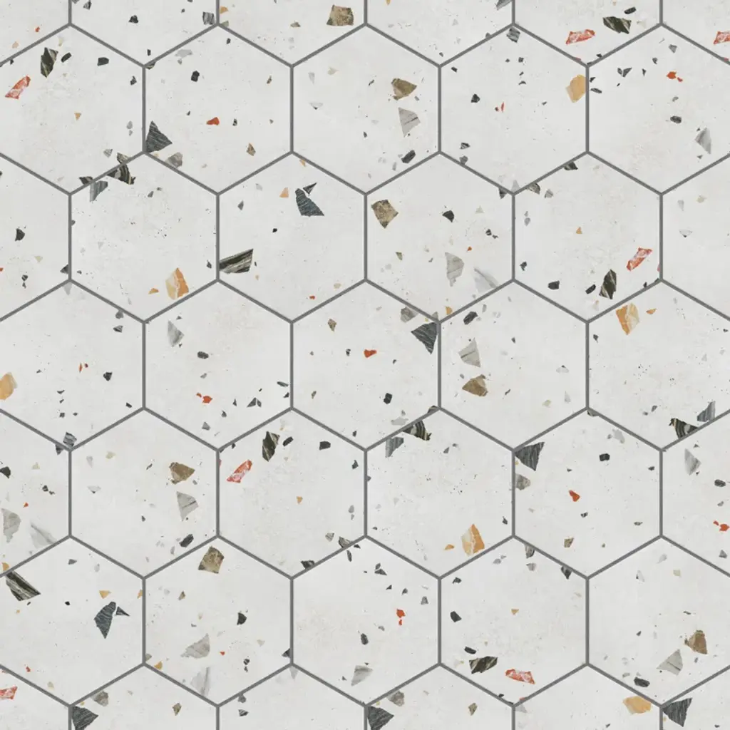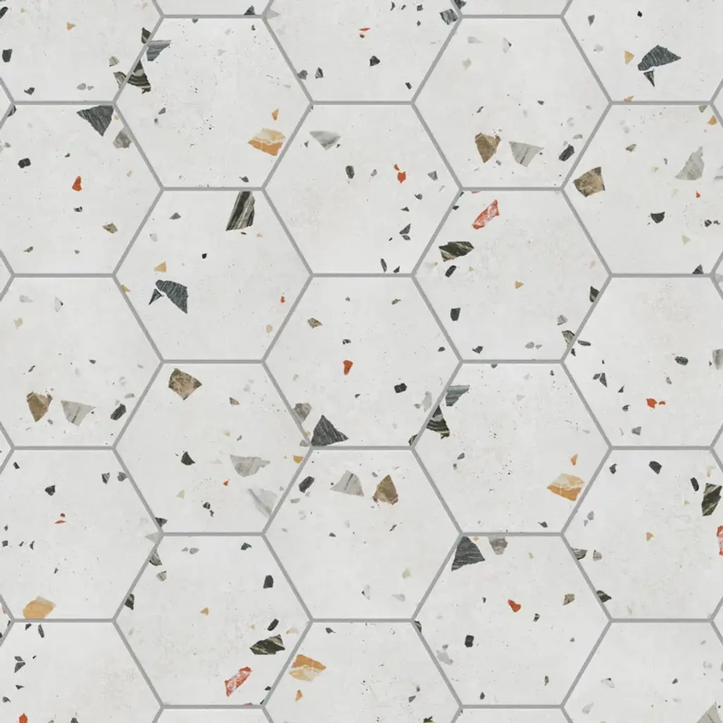 Replicating a worn concrete appearance with floating fragments of large stones, our sonar hex white porcelain floor, and wall tile lends a burst of terrazzo-look energy to any space. This hexagon tile features various sized speckled pattern variations in mixed color tones that are set on an off-white base glaze, offering dramatic contrast and dimension to the design. The slightly textured, mixed finish surface features a weathered, mottled look, replicating the beauty of the aged stone. This trending stone-look design is visually appealing and versatile and blends beautifully with a range of design styles from vintage industrial to modern-day. Its impervious, frost-resistant, and durable features make it an ideal choice for both commercial and residential indoor and outdoor installations including, kitchens, bathrooms, backsplashes, showers, hallways, entryways, patios, and fireplace facades. Tile is the better choice for your space. This tile is made from natural ingredients, making it a healthy choice as it is free from allergens, VOCs, formaldehyde, and PVC.