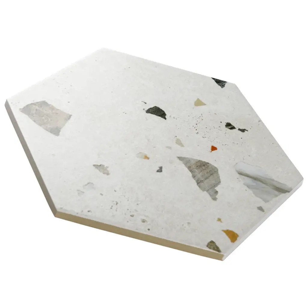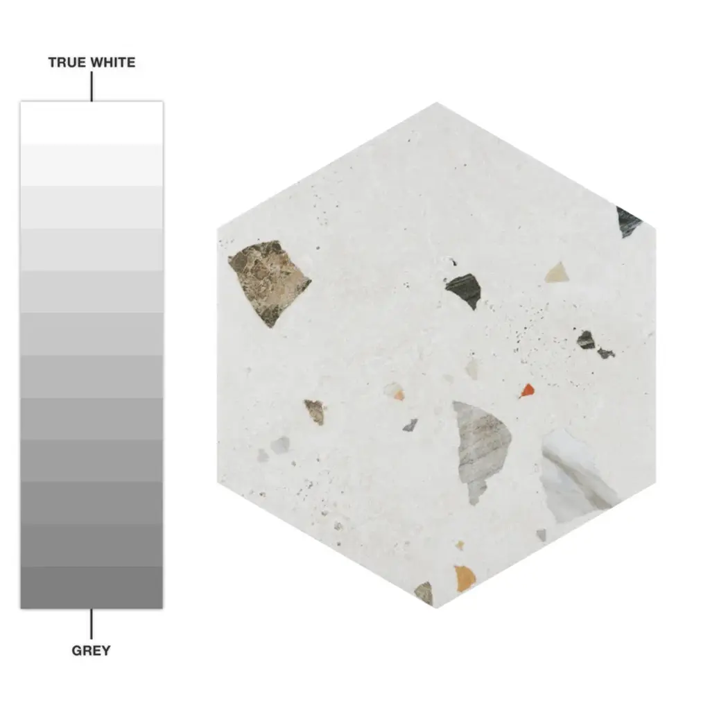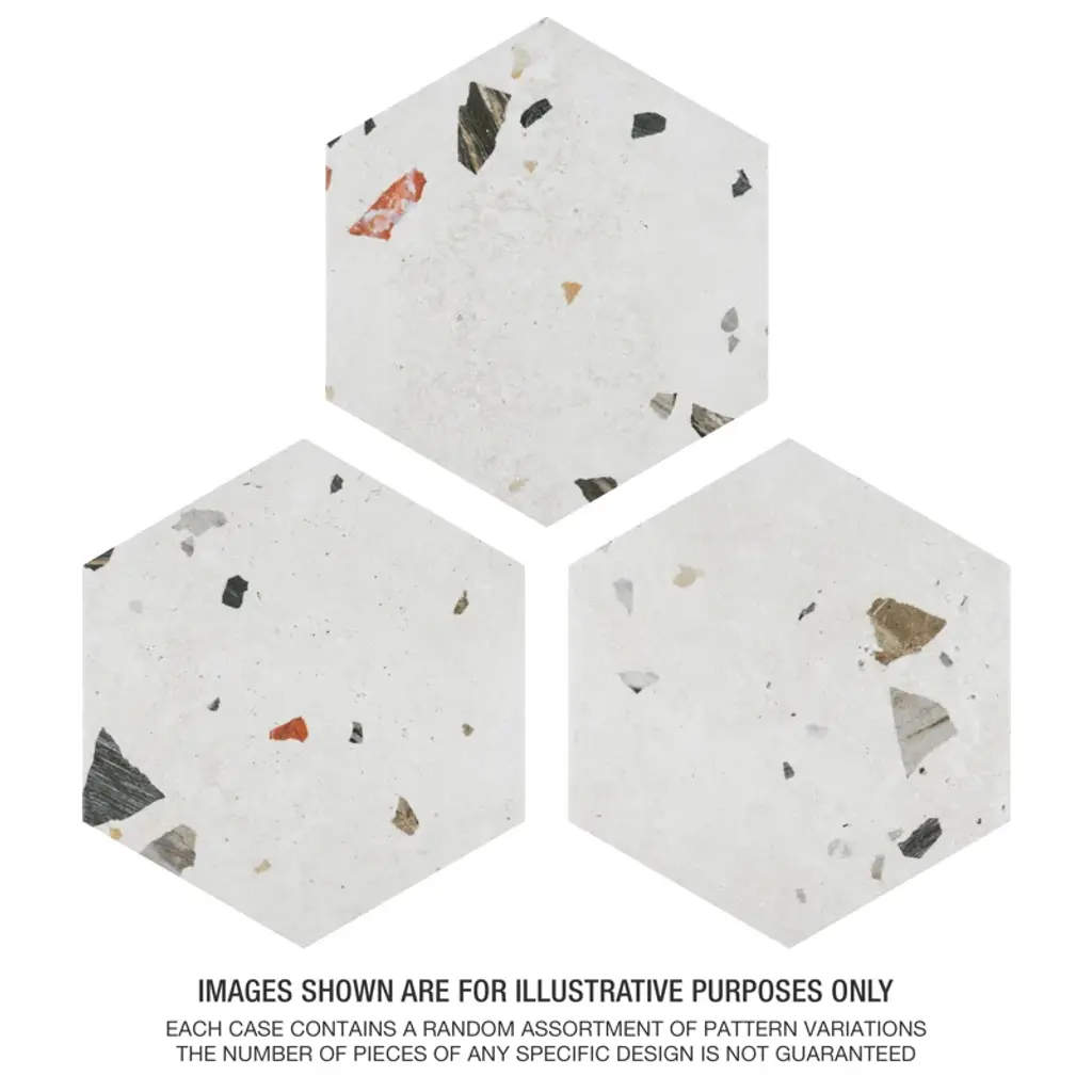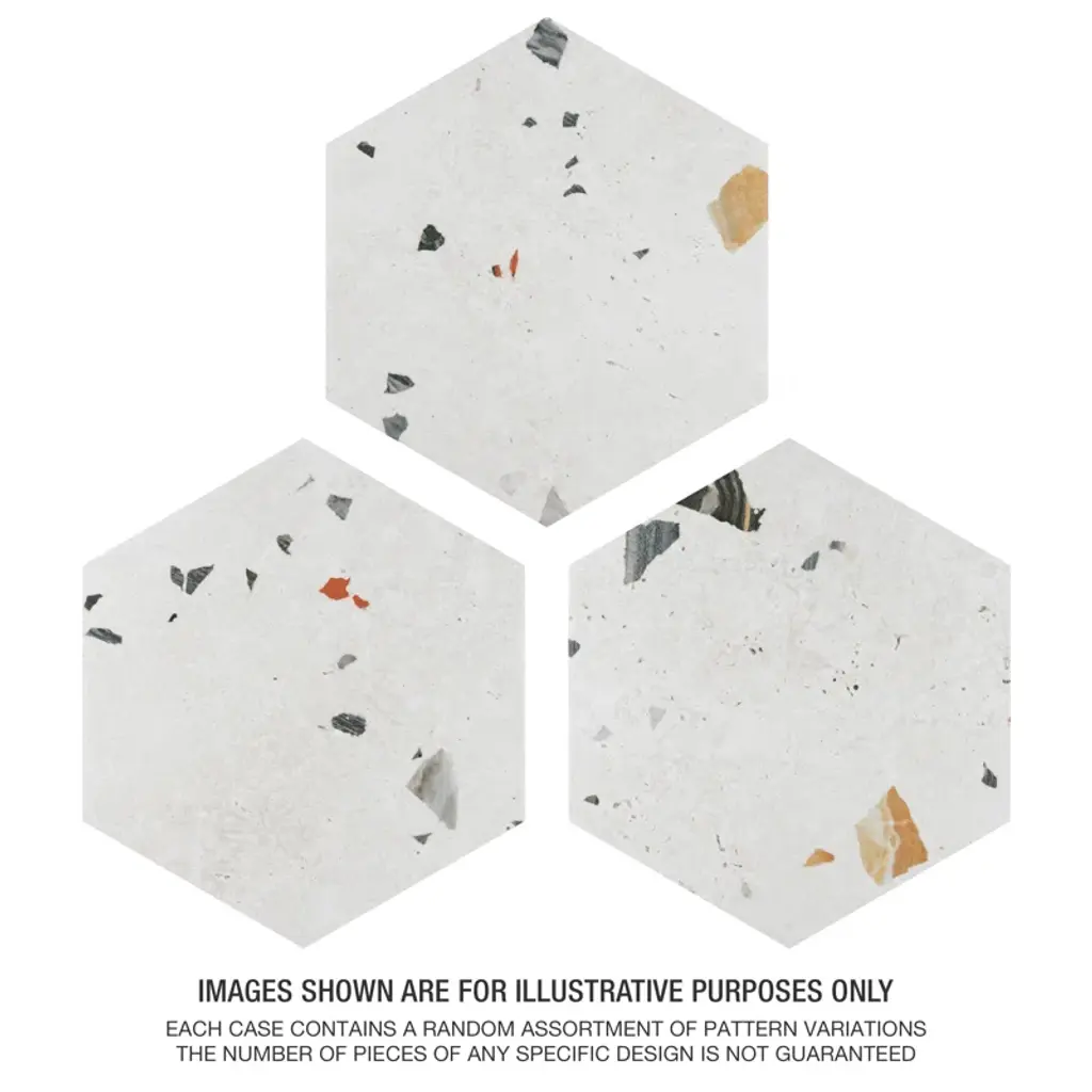 Replicating a worn concrete appearance with floating fragments of large stones, our sonar hex white porcelain floor, and wall tile lends a burst of terrazzo-look energy to any space. This hexagon tile features various sized speckled pattern variations in mixed color tones that are set on an off-white base glaze, offering dramatic contrast and dimension to the design. The slightly textured, mixed finish surface features a weathered, mottled look, replicating the beauty of the aged stone. This trending stone-look design is visually appealing and versatile and blends beautifully with a range of design styles from vintage industrial to modern-day. Its impervious, frost-resistant, and durable features make it an ideal choice for both commercial and residential indoor and outdoor installations including, kitchens, bathrooms, backsplashes, showers, hallways, entryways, patios, and fireplace facades. Tile is the better choice for your space. This tile is made from natural ingredients, making it a healthy choice as it is free from allergens, VOCs, formaldehyde, and PVC.