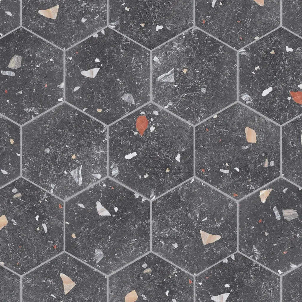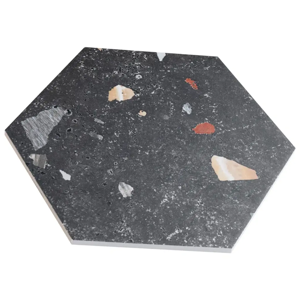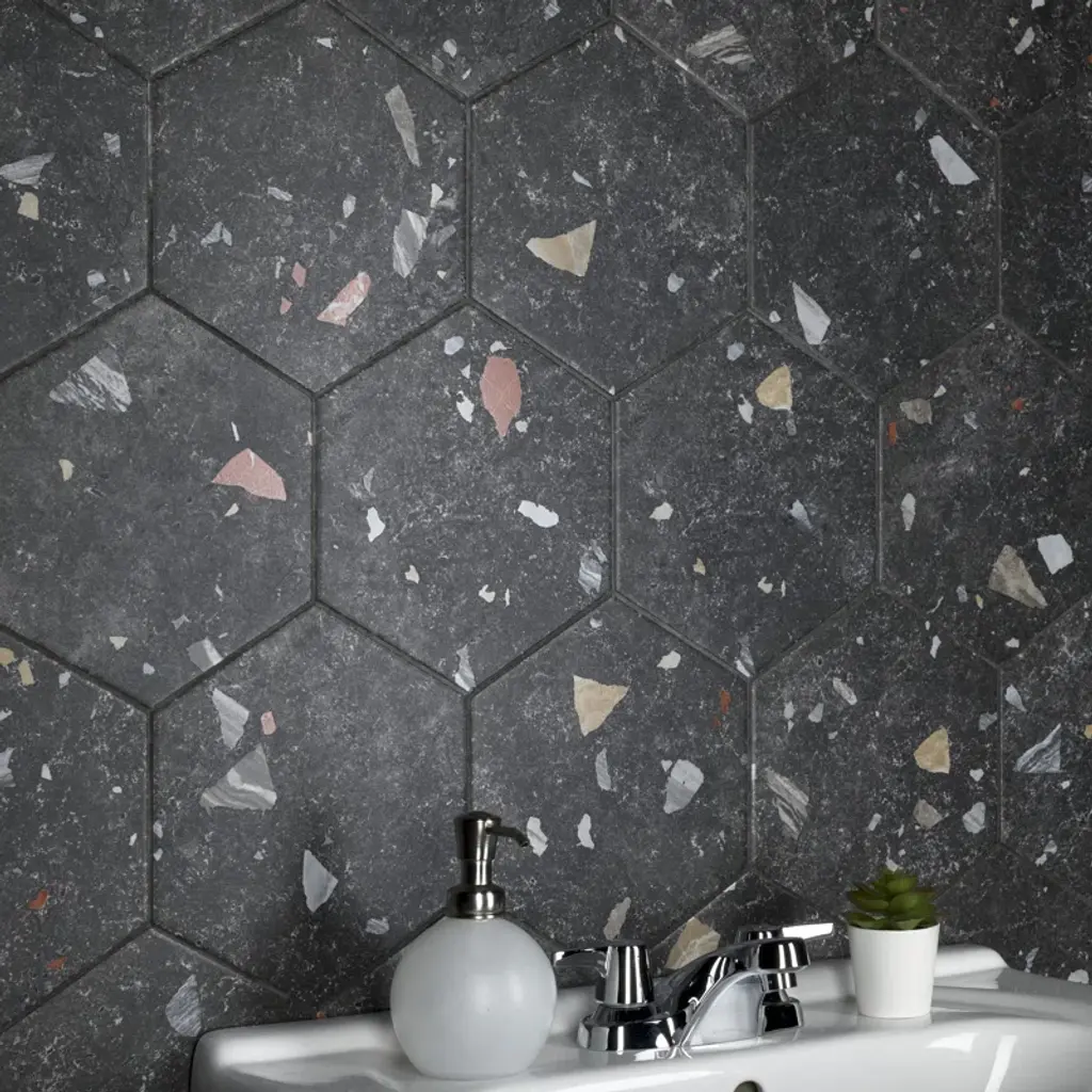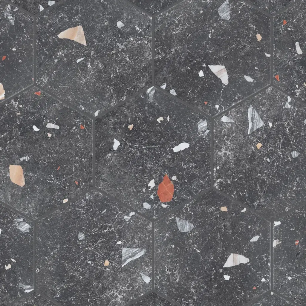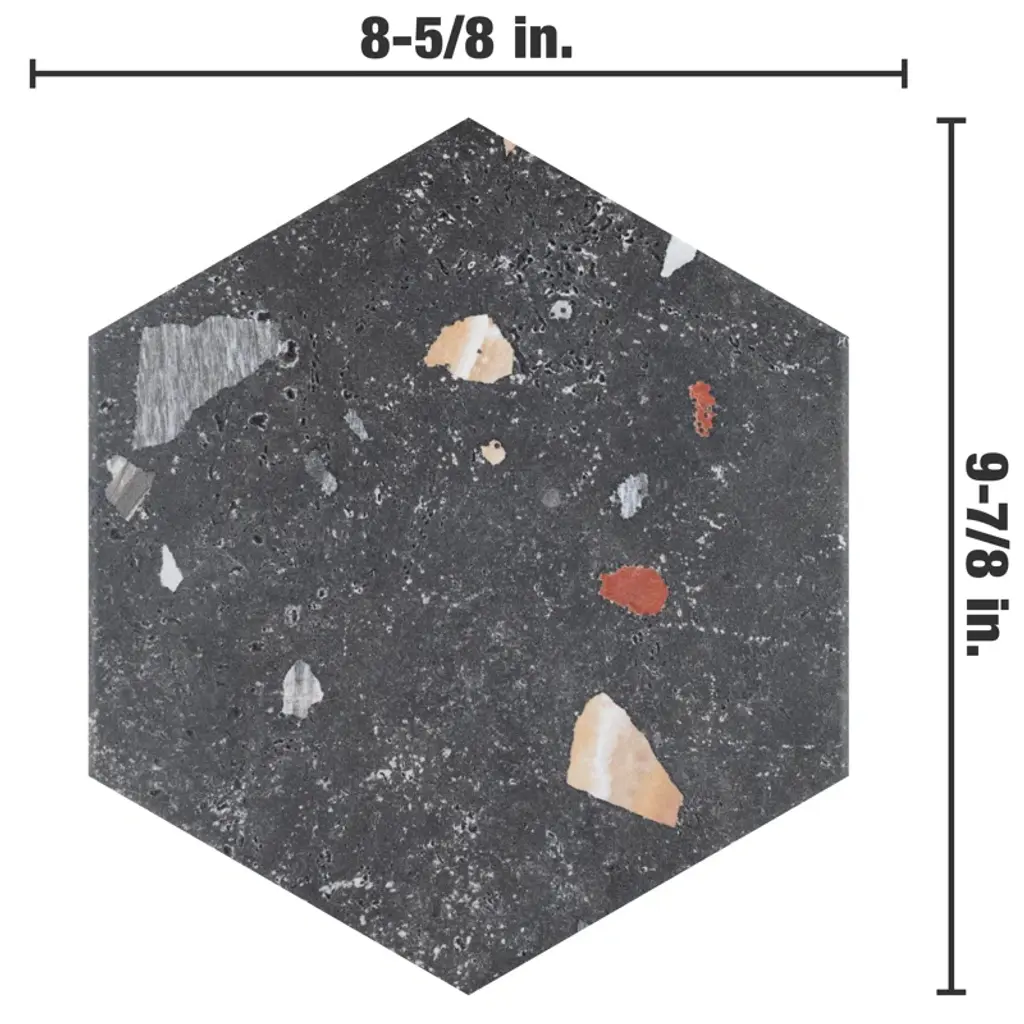Modern and vintage design elements blend to create our Sonar Hex Mix 8-5/8" x 9-7/8” Porcelain Floor and Wall Tile. This hexagon tile is a subtle statement piece created by distressed designs in a variety of earth-toned colors. With a slightly textured finish, this unique porcelain tile offers organic, rustic beauty through realistic scuffs and spots that are the marks of well-loved, worn, century-old tile. Available in thirty print variations that are randomly scattered throughout each case, the variation throughout each tile mimics an authentic aged appearance. Its impervious, frost-proof, and durable features make this an ideal tile for both commercial and residential indoor and outdoor residential installations including, kitchens, bathrooms, backsplashes, showers, hallways, entryways, patios, and fireplace facades. Tile is the better choice for your space. This tile is made from natural ingredients, making it a healthy choice as it is free from allergens, VOCs, formaldehyde, and PVC.
