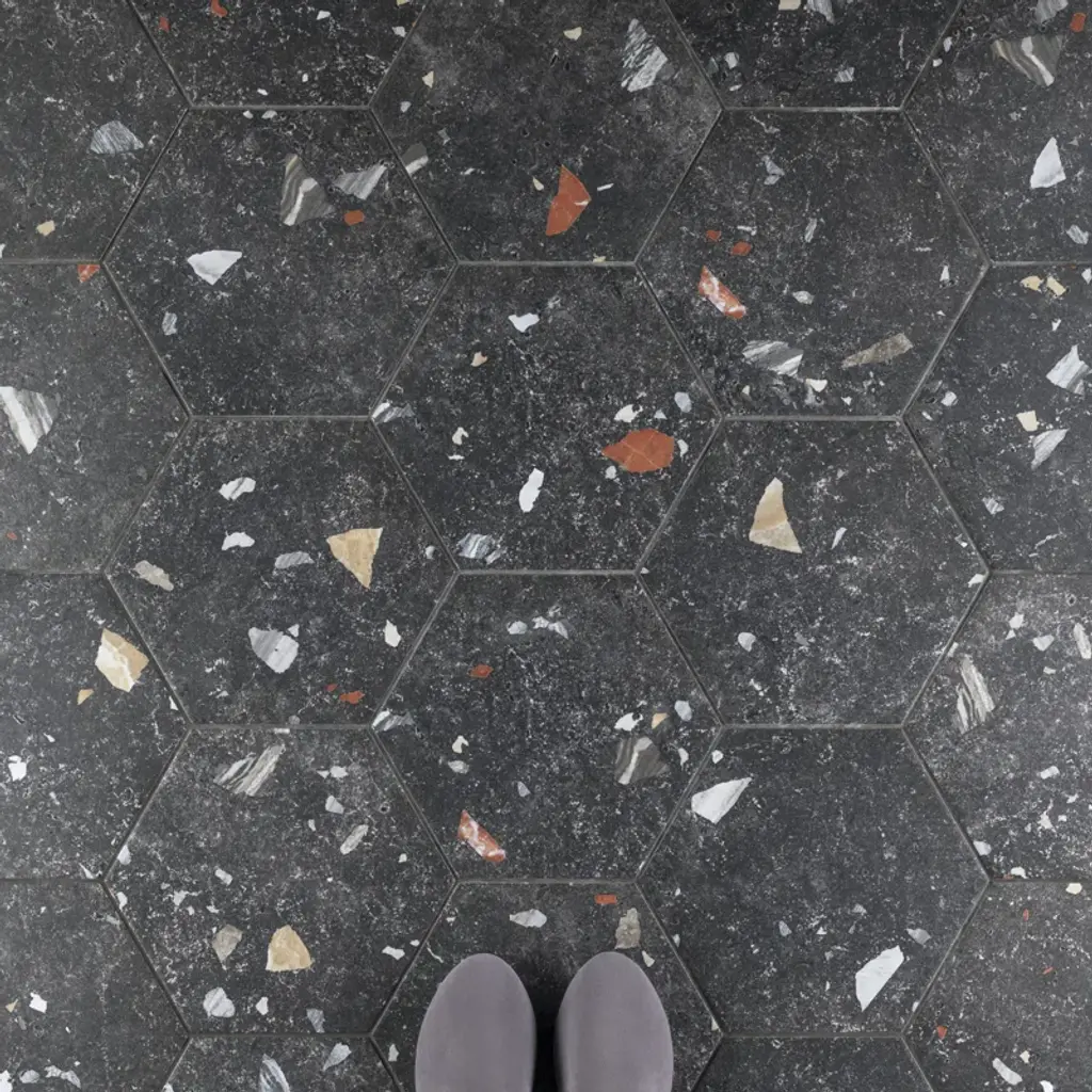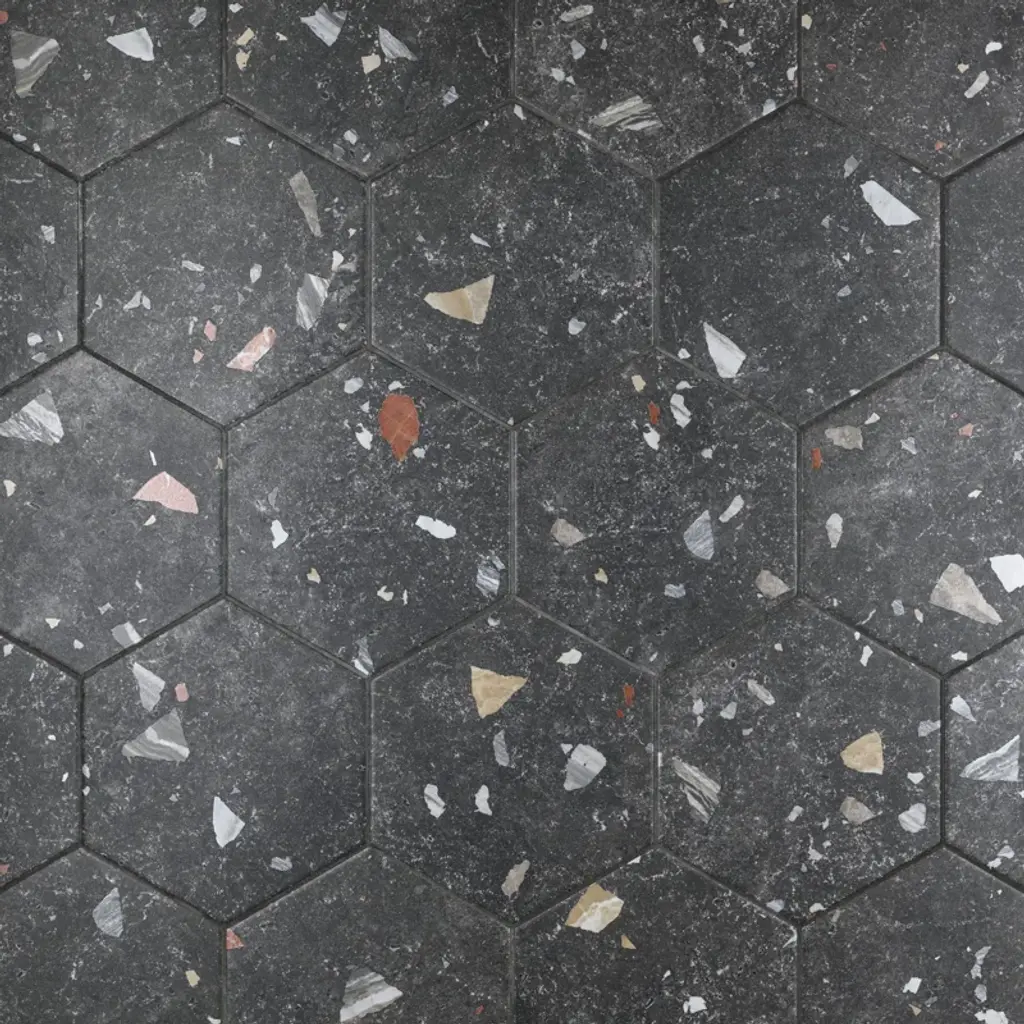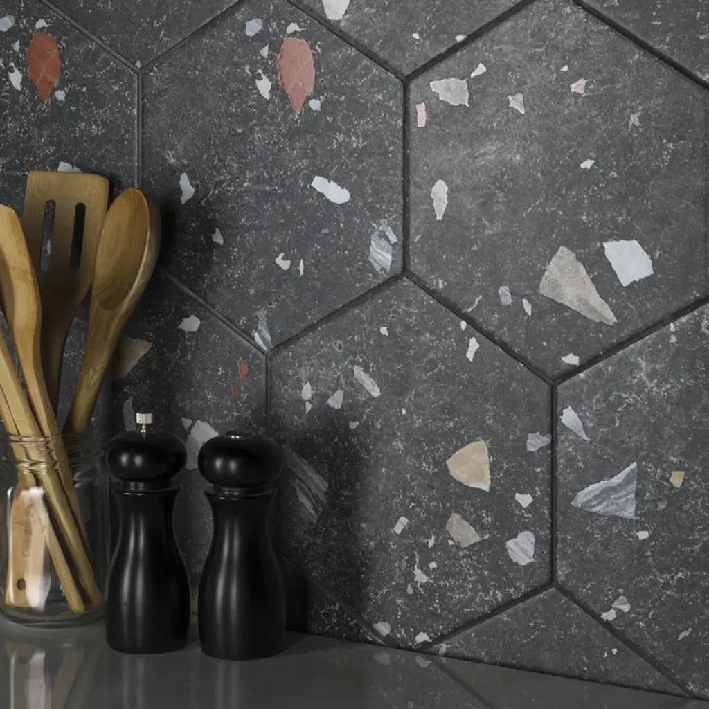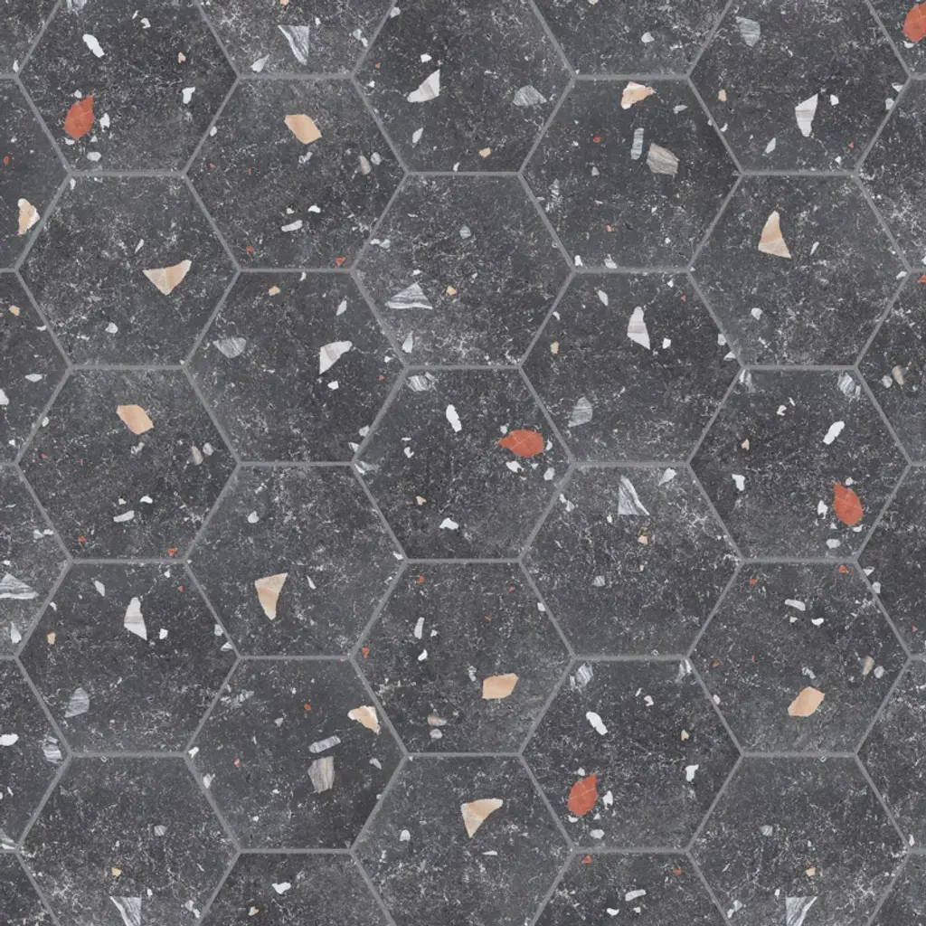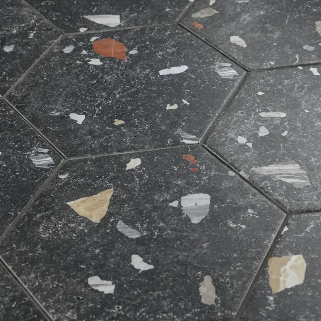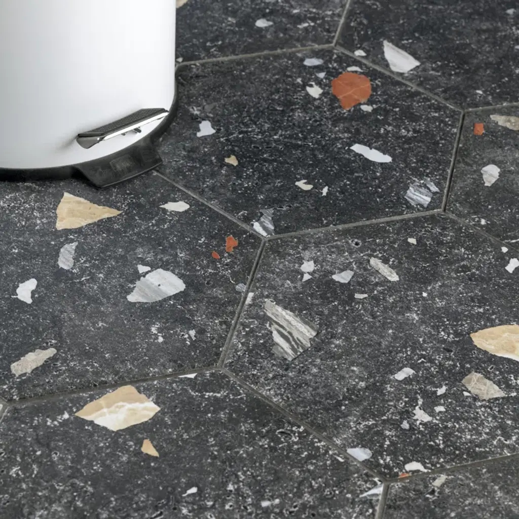 Modern and vintage design elements blend to create our Sonar Hex Mix 8-5/8" x 9-7/8” Porcelain Floor and Wall Tile. This hexagon tile is a subtle statement piece created by distressed designs in a variety of earth-toned colors. With a slightly textured finish, this unique porcelain tile offers organic, rustic beauty through realistic scuffs and spots that are the marks of well-loved, worn, century-old tile. Available in thirty print variations that are randomly scattered throughout each case, the variation throughout each tile mimics an authentic aged appearance. Its impervious, frost-proof, and durable features make this an ideal tile for both commercial and residential indoor and outdoor residential installations including, kitchens, bathrooms, backsplashes, showers, hallways, entryways, patios, and fireplace facades. Tile is the better choice for your space. This tile is made from natural ingredients, making it a healthy choice as it is free from allergens, VOCs, formaldehyde, and PVC.