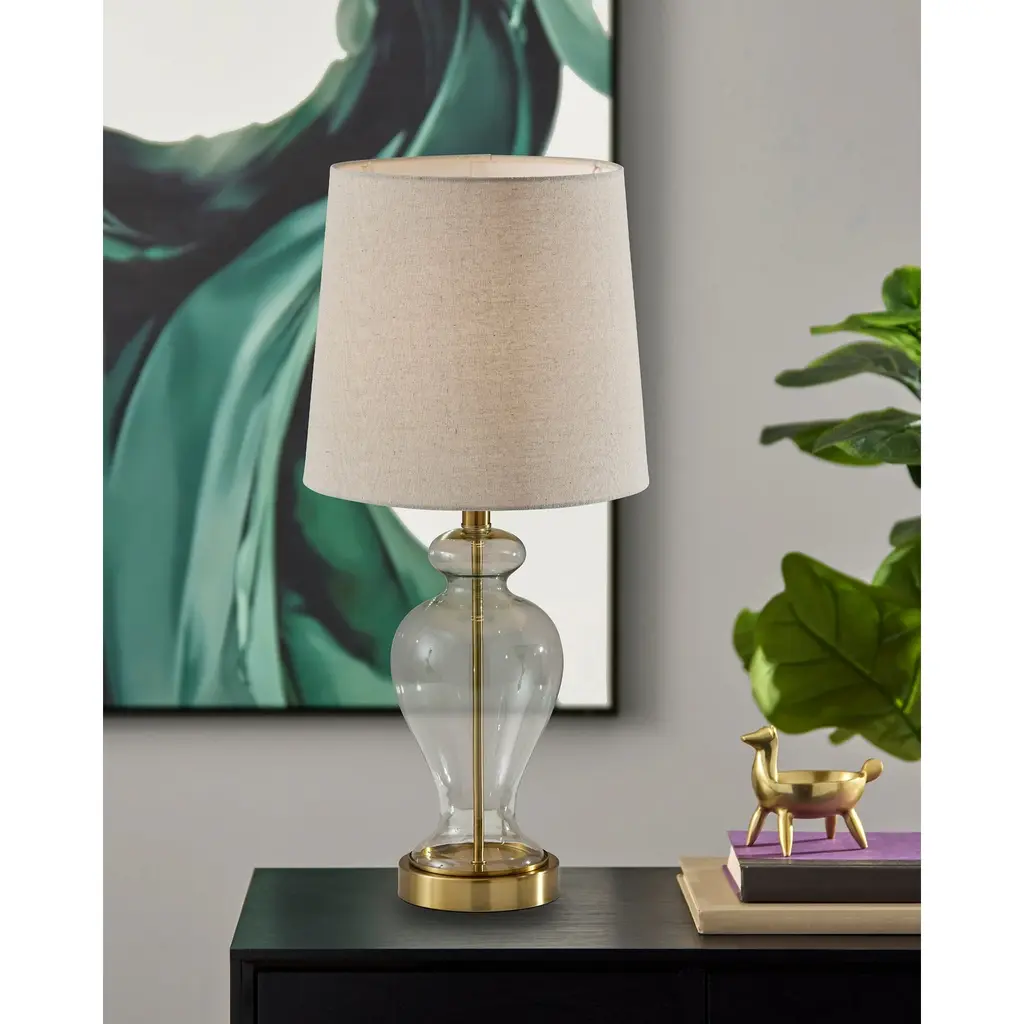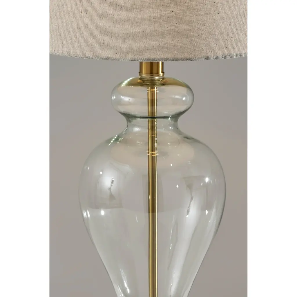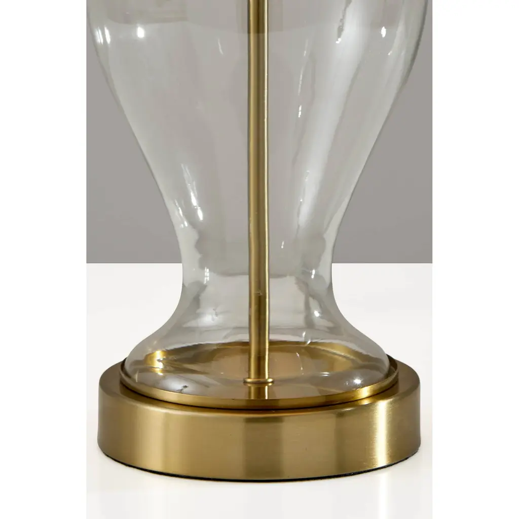 Meet the SL3985-02 Sonata Table Lamp, a stunning combination of vintage charm and contemporary design. Its clear glass base, adorned with antique brass accents, adds an air of sophistication to any room. Paired with an off-white pleated fabric shade, this lamp exudes elegance and warmth, casting a soft and inviting glow. Standing at 26 inches tall, it serves as a versatile lighting solution for side tables, nightstands, or desks. The on/off rotary switch on the socket ensures easy operation, making it a stylish and functional addition to your home decor.