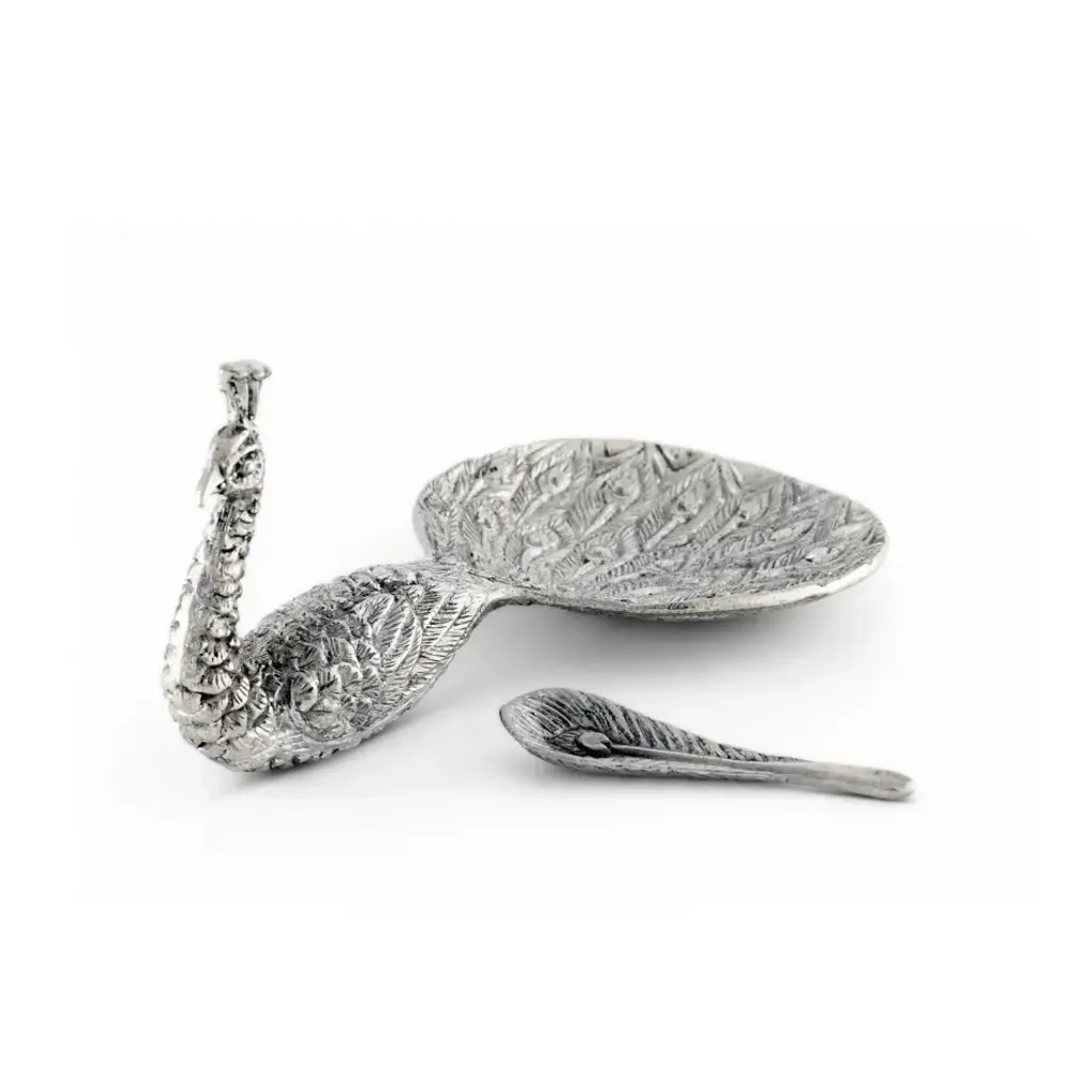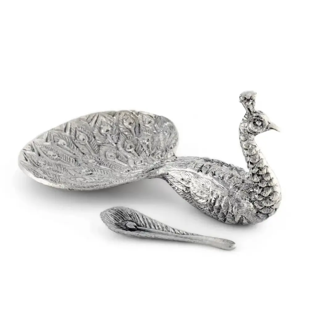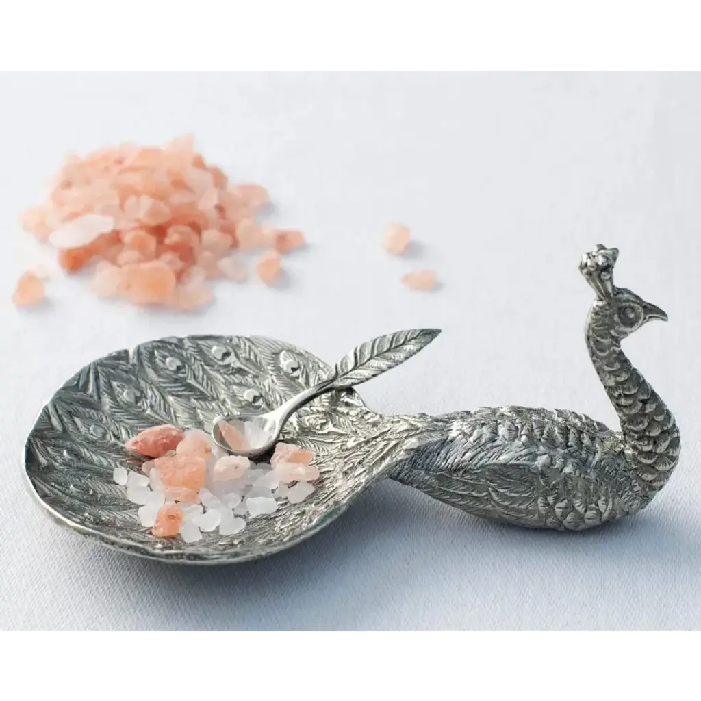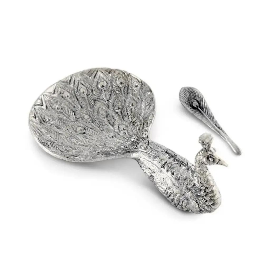 Perfect for more formal tables, our superbly detailed proud peacock is designed to serve gourmet salts from the open tail. A tiny feather spoon for serving completes the set. Our Vagabond House family believes that the tradition of salt cellars and dishes is worthy of preservation. Peacocks have long been considered a regal bird and throughout history have represented immortality, openness and acceptance, in heraldry, they represented personal pride. During medieval times, knights were known to take a solemn vow “on the peacock” Vagabond House is a family-owned American company specializing in fine pewter tableware, servingware and giftware. Largely inspired by nature, their exclusive products are designed to be unique, functional heirlooms for those who seek to express tradition and style in both family and formal entertaining.