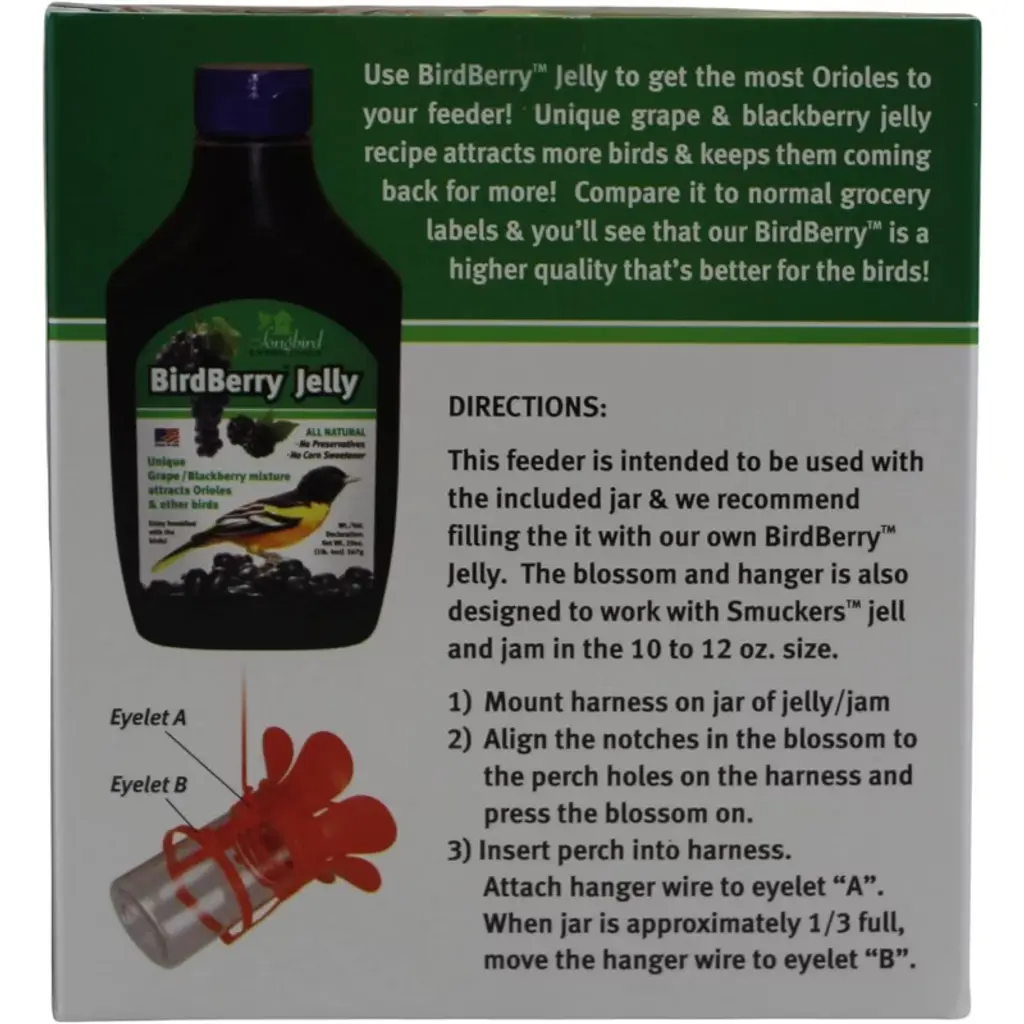 The Songbird Essentials Jelly and Jam Feeder is the Easiest Way to Set Up a Great Bird Feeder. Birds Will be Lining up to Get a Chance at This Feeder. This Feeder is in the Shape of a Bright Orange Flower Blossom to Easily Attract Birds. This Beautiful Bird Feeder Comes Complete With a Detachable Six Ounce Jar, Making it Easy To Refill. Just Simply Slide in a 10-12 Ounce Jar of Jelly or Jam and Wait for All the Beautiful Birds to Come Calling. Clean up is Also Simple. When the Jar is out of Jelly, Simply Pull it From the Feeder and Replace it with a New Jar. The Jelly Bird Feeder is a Great Way to Attract Orioles and Other Wonderful Birds to Your Garden, Backyard or Window Box.