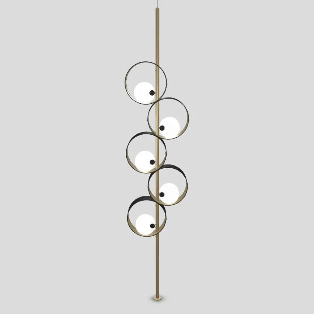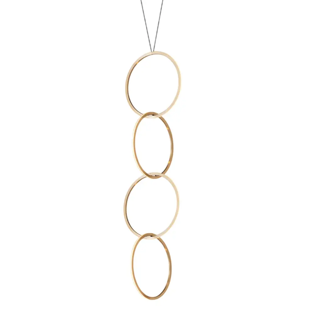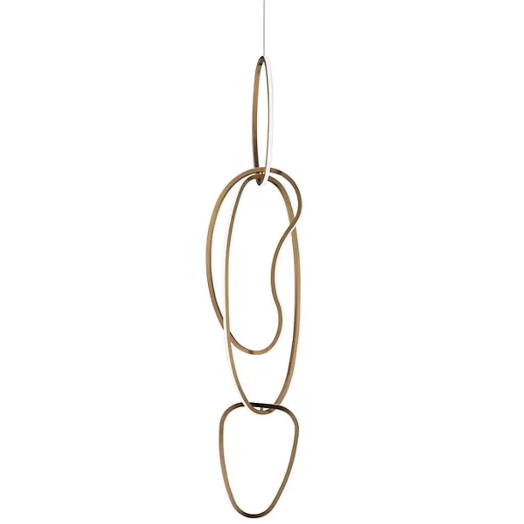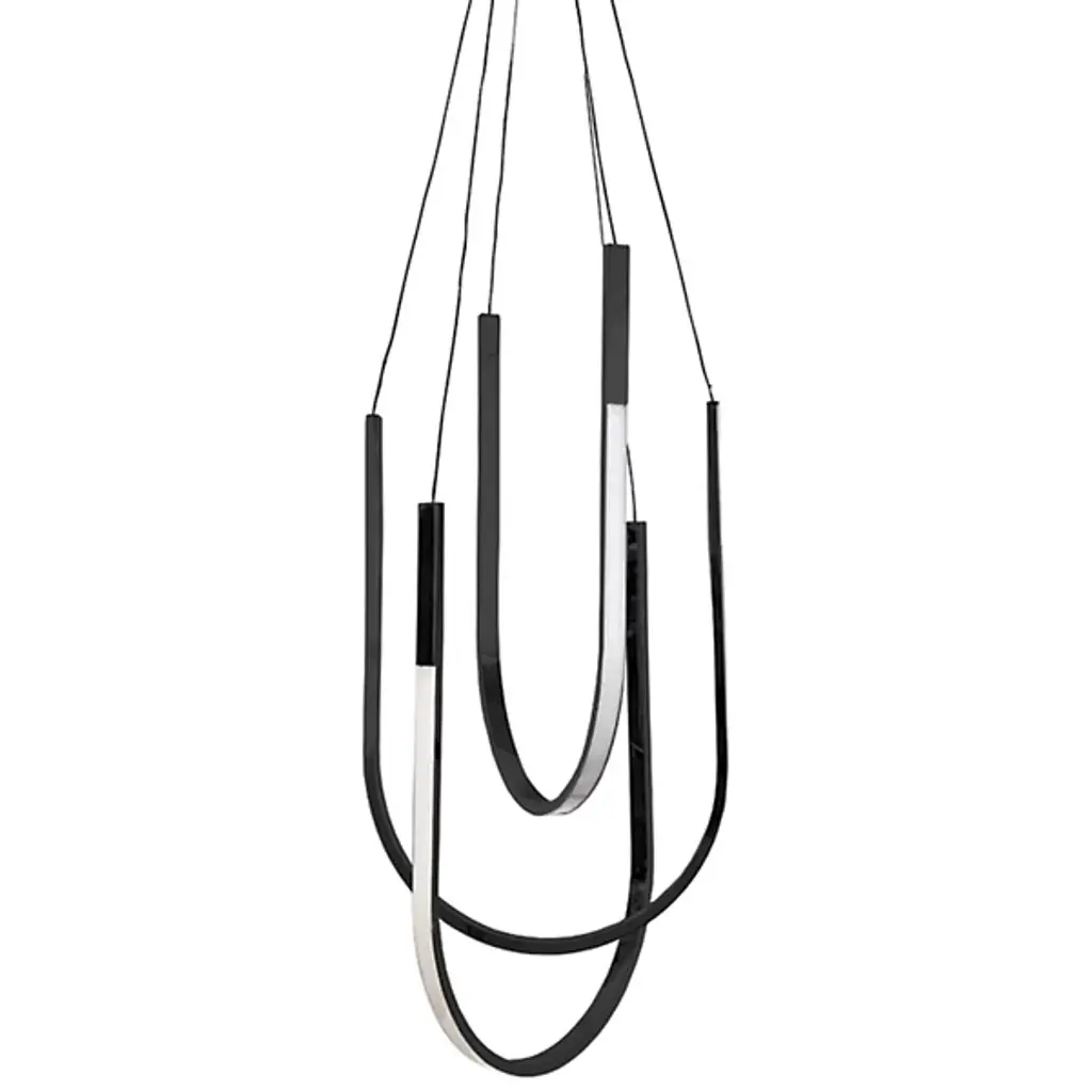 The movement of offset arcs rotate in suspension to form a modern interplay of deconstruction Features: Single driver power supply located in the canopy Constructed of metal Includes synthetic shades Sloped ceiling compatible 72" of hanging cord included Integrated 3000K LED lighting Capable of being dimmed Rated for damp locations Title 20 compliant Covered by Sonneman's 5 year limited manufacturer warranty Dimensions: Height: 56" Maximum Height: 130" Width: 24-3/4" Depth: 24-3/4" Product Weight: 8 lbs Cord Length: 72" Electrical Specifications: Wattage: 51 watts Number of Light Source(s): 3 Lumens: 3120 Color Temperature: 3000K Color Rendering Index: 90 CRI Average Hours: 50000