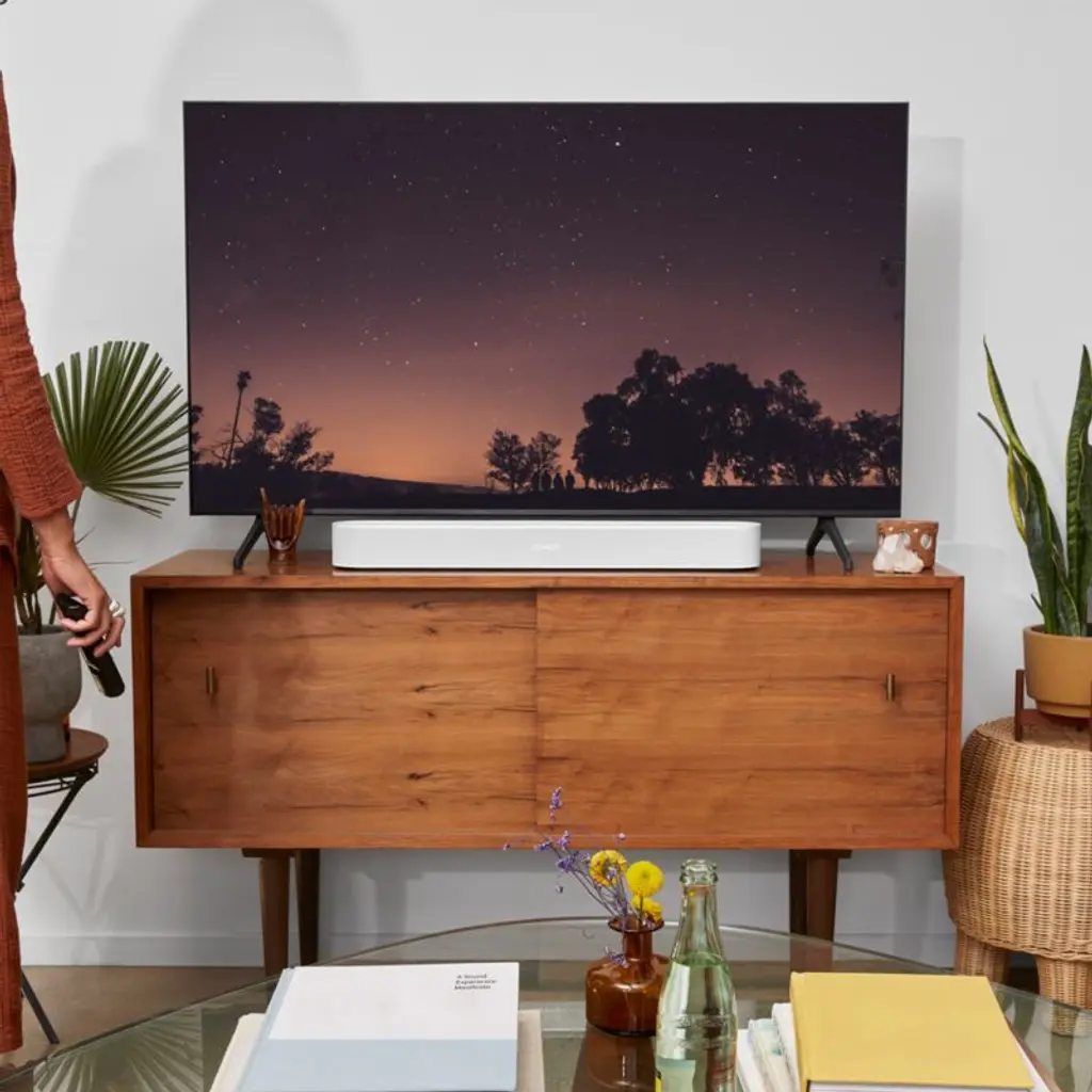 Enhance your entertainment with the powerful and precise sound of the Sonos Beam soundbar. Dolby Atmos creates an impressive surround sound experience, immersing you in shows, movies, games and music. Advanced audio processing ensures balanced sound at any volume level. Use the Sonos app to customize your audio preferences. Trueplay tuning technology adapts the sound for the unique acoustics of the room to create the best listening experience. Slim and sleek, the white soundbar fits in seamlessly with your entertainment equipment and living-room decor.