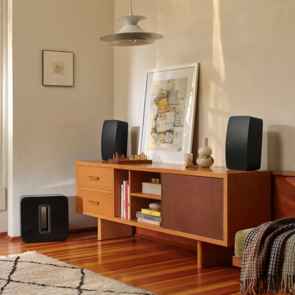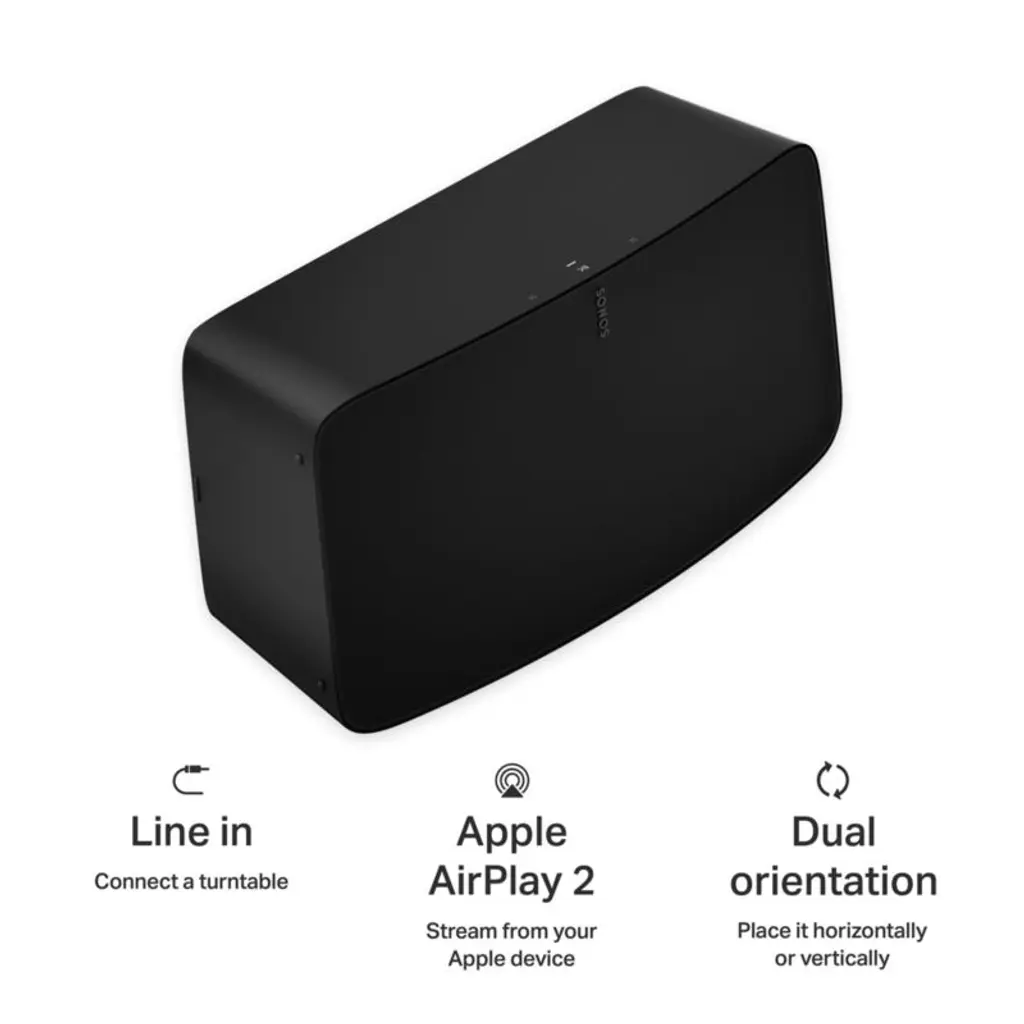 Engineered for high fidelity, Five elevates your listening experience with vivid stereo separation, clean bass and spectacularly detailed vocals. Hear every microtone and feel every drumbeat when you stream the highest-resolution formats from your favorite services. Five fills even your largest room with tight top notes, faithful vocals and striking low end. Place Five horizontally and it automatically separates the left and right channels for full stereo sound. Position it vertically on either side and the digital processing adjusts to mono. The touch controls smartly adapt for any orientation. Mix and match Sonos speakers around your home for multiroom listening. Everything works seamlessly together over WiFi.