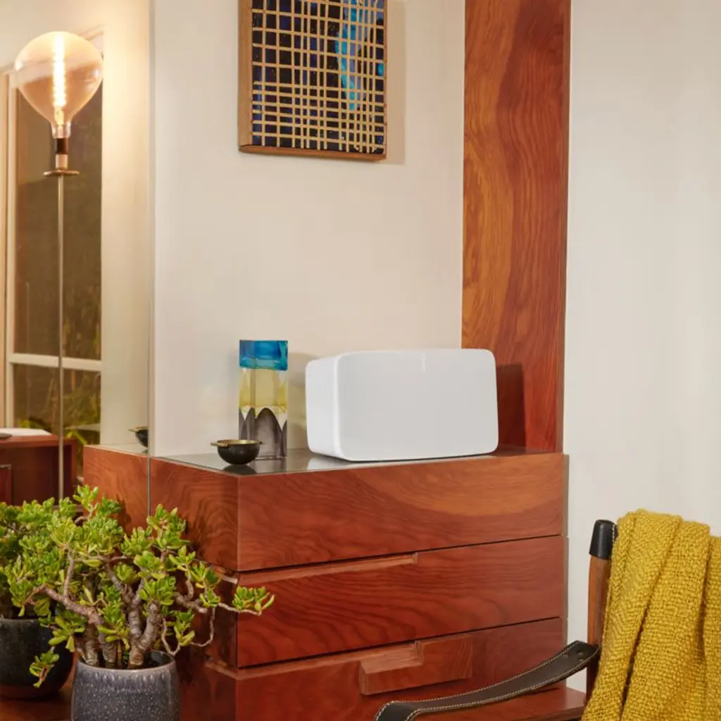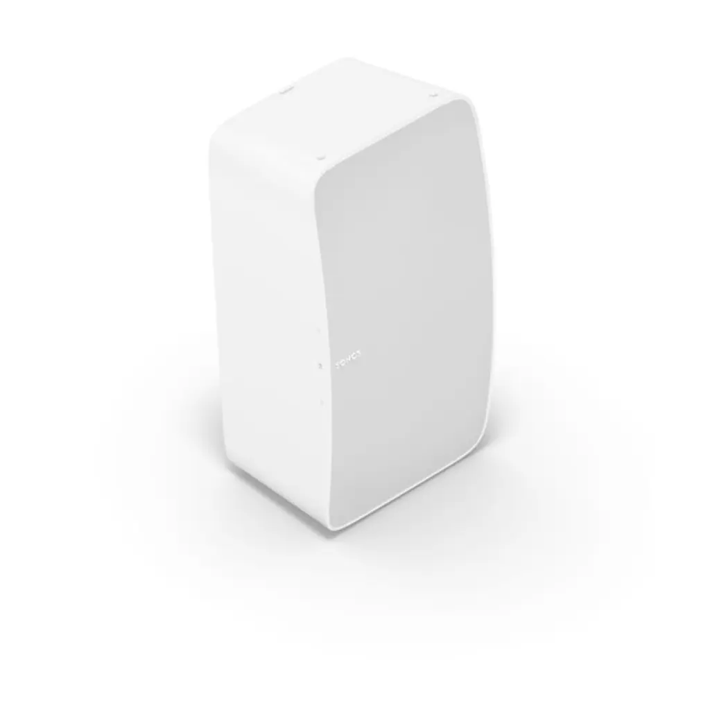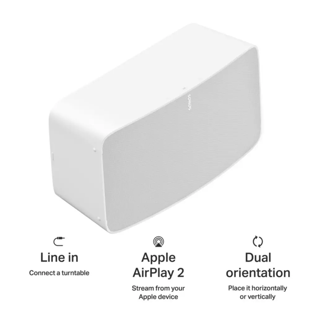 Engineered for high fidelity, Five elevates your listening experience with vivid stereo separation, clean bass and spectacularly detailed vocals. Hear every microtone and feel every drumbeat when you stream the highest-resolution formats from your favorite services. Five fills even your largest room with tight top notes, faithful vocals and striking low end. Place Five horizontally and it automatically separates the left and right channels for full stereo sound. Position it vertically on either side and the digital processing adjusts to mono. The touch controls smartly adapt for any orientation. Mix and match Sonos speakers around your home for multiroom listening. Everything works seamlessly together over WiFi.