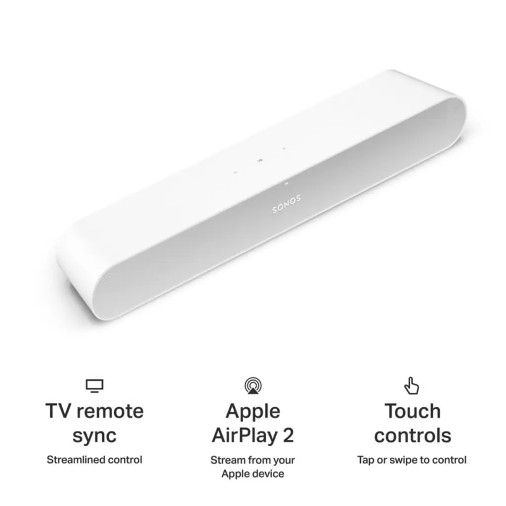 Upgrade your TV, music and gaming experiences with this impressively compact and easy-to-use soundbar. Experience precisely balanced sound, including crisp dialogue and solid bass, plus streamlined control with your TV remote, the Sonos app, Apple AirPlay 2 and more. It only takes two cables and a few minutes to set up, and the forward-facing acoustics make Ray ideal for an enclosed space like a shelf in your TV stand. Enjoy the flexibility to create the Sonos system you want over time when you add speakers for surround sound and multiroom listening.