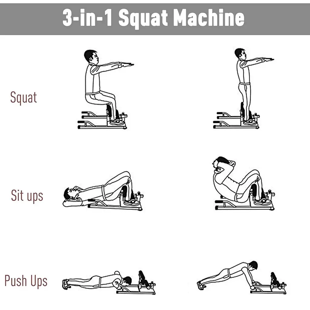 If you’ve been looking for a way to boost your leg day, it’s time to add this Sissy Squat Machine from Soozier to your home gym. This compact 3-in-1 exercise machine helps you do perfect sissy squats, sit-ups, and push-ups, so you can work your whole body in one workout. Work your quads, glutes, and hamstrings with the stable squat bars by sliding your feet under the rollers and leaning backwards with your calves against the padded calf support bar. You can lay back over the support bar for sit-ups to work your core while the foot rollers keep you safely in place, or use the dual handles at the back of the machine for elevated push-ups and planks to work your entire body. The height adjustable pads make this equipment versatile for all body types. Four suction cups keep the machine securely on the floor while you work out, and two built in wheels make this machine easy to move and store when not in use. Start building your perfect body today with this 3-in-1 squat machine!Features:- 3 in 1 exercise machine for deep sissy squats, sit-ups, and push-ups- Build abdomen and leg muscles - Constructed of heavy duty steel that can support up to 265 lbs- Comfortable foam pads and footrest to protect your legs - Fully adjustable pad heights and positions to fit your height and body type - Non-slip foot plate with 4 suction cups to keep the machine in place- 2 wheels included for easy movement- Easy assembly requiredSpecifications:-Color: Black - Material: Steel, EVA- Overall Dimension: 19.75" W x 38.25" D x 18" 22.5" H- Weight Capacity: 265 lbs. - Net Weight: 28 lbs.