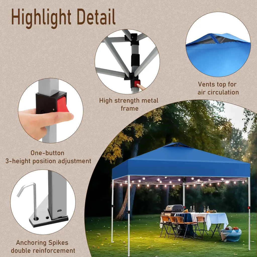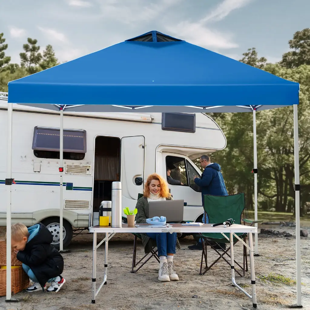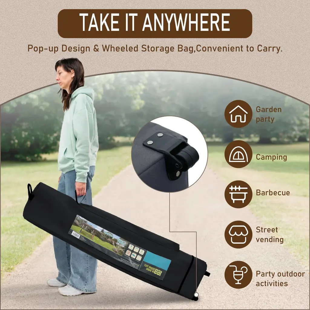Indulge in unparalleled comfort with our Pop-up Canopy Tent featuring superior top-ventilation and breathability. Effortlessly tailor your experience with three-position telescopic steel legs, complemented by UV-coated fabric that reflects 99% of harmful sunlight and offers waterproof protection.Perfect for camping, beach outings, parties, or any outdoor activity, this tent ensures easy setup with the one-person setup feature and convenient storage in the wheeled carrying bag.