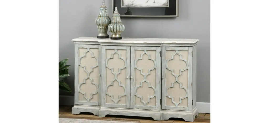 Sophie accent cabinet is a break front console in weathered sea gray with ivory accents. Open-carved doors are baked in light tan linen, enclosing three adjustable shelves.