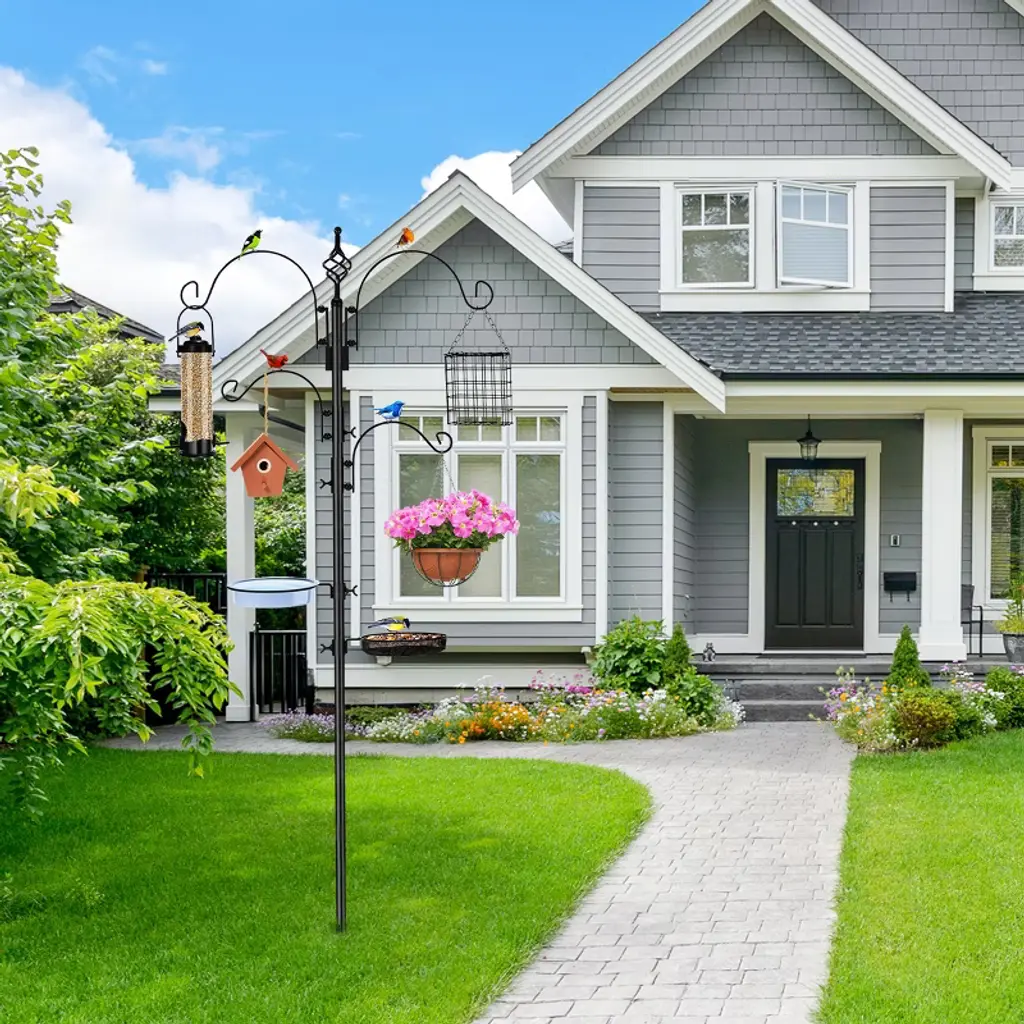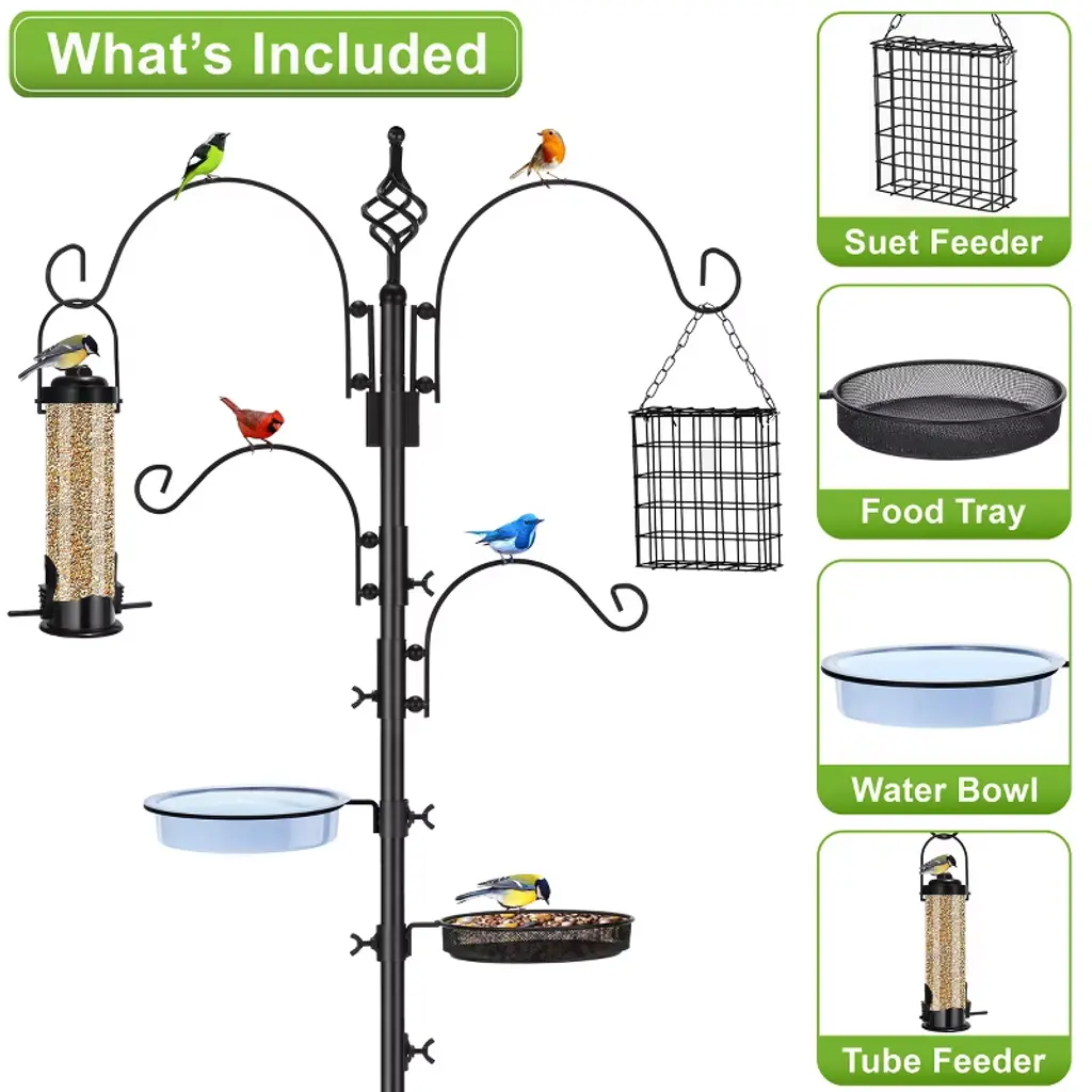 Watch birds fly into action all season long with the Sorbus Bird Feeding Bath Station! Create a high-rise haven for birds! This all-in-one station includes everything you need to attract birds and decorate your garden. It features 4 hanging hooks, 1 water dish bowl, 1 mesh tray, and 1 feeder pole to offer a complete buffet to your feathered friends. Watch as finches, cardinals, woodpeckers, and more flock to this adorable bird feeder for a tasty meal. The mesh tray holds wide variety of birdseed, peanuts, berries, sunflower seeds, fruits, and more. After the full course, birds can drink, bathe, or cool themselves from the water-filled bowl. Add it anywhere to beautifully complement your patio, garden, or backyard landscape. This bird bath feeder is the perfect way to entertain and enjoy the outside view. Enjoy the vibrant, majestic beauty of bird feeding...and bathing! Look out the window at the picturesque scene of colorful birds as you relax and unwind. For a decorative touch, add chimes, lanterns, flowers, and other decorative items to the hanging hooks. Delight children and grandparents alike by attracting birds to the backyard for an afternoon snack or cool down session. When the seeds and water are gone, kids can help refill the station with a fresh supply. Mounts in the ground with a durable single stake for stability and easy placement. With this sturdy four-arm stand you can offer a buffet of different foods. To use, simply step down to plant! The forked base prong adds stability and permits easy placement. No tools required! To assemble or adjust each component, loosen or tighten by hand. The bowl and tray easily detach for cleaning.