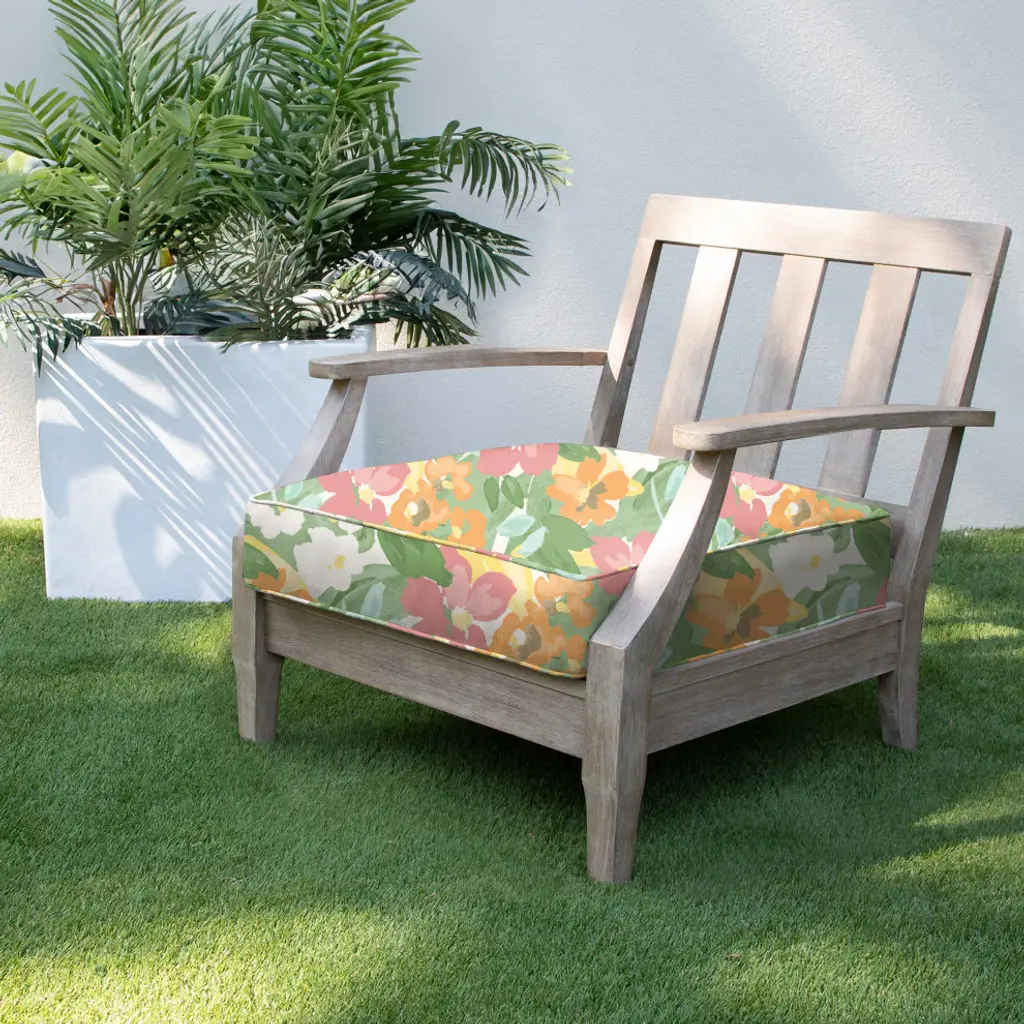 Step out on your porch or patio and start brightening it up with this beautiful new chair cushion! Featuring a stunning floral fabric in a rich, multi color hue, this cushion will instantly enhance your space and help you comfortably enjoy the outdoors! Crafted out of a performance material right here in North America, this chair cushion is made to withstand the sun, rain and even stains so that all you have to do is sit back and relax! • Ideal for casual indoor and outdoor use• Includes one (1) deep seating cushion• Cushion cover can be removed for easy cleaning• Available in a variety of sizes and colors to ensure that you find the perfect match for your furniture• Cushion only. Furniture not included.• • Made in North America•