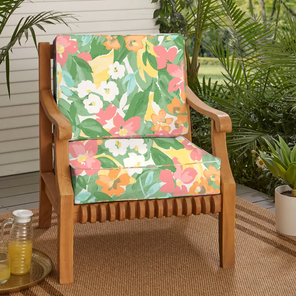 Slow down and take a breath of fresh air with the help of this luxurious chair cushion set! Featuring a gorgeous floral fabric in a rich, multi color hue, this cushion set will update your outdoor space and give you that place of relaxation you desperately need! Crafted out of a performance material right here in North America, this chair cushion set is built to withstand sun, stains, and all other outdoor elements. • Ideal for casual indoor and outdoor use• Includes one (1) back cushion, one (1) seat cushion• Cushion cover can be removed for easy cleaning. Pillow cover is not removable.• Available in a variety of sizes and colors to ensure that you find the perfect match for your furniture• Pillows and cushions only. Furniture not included.• • Made in North America•