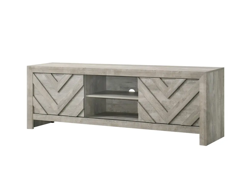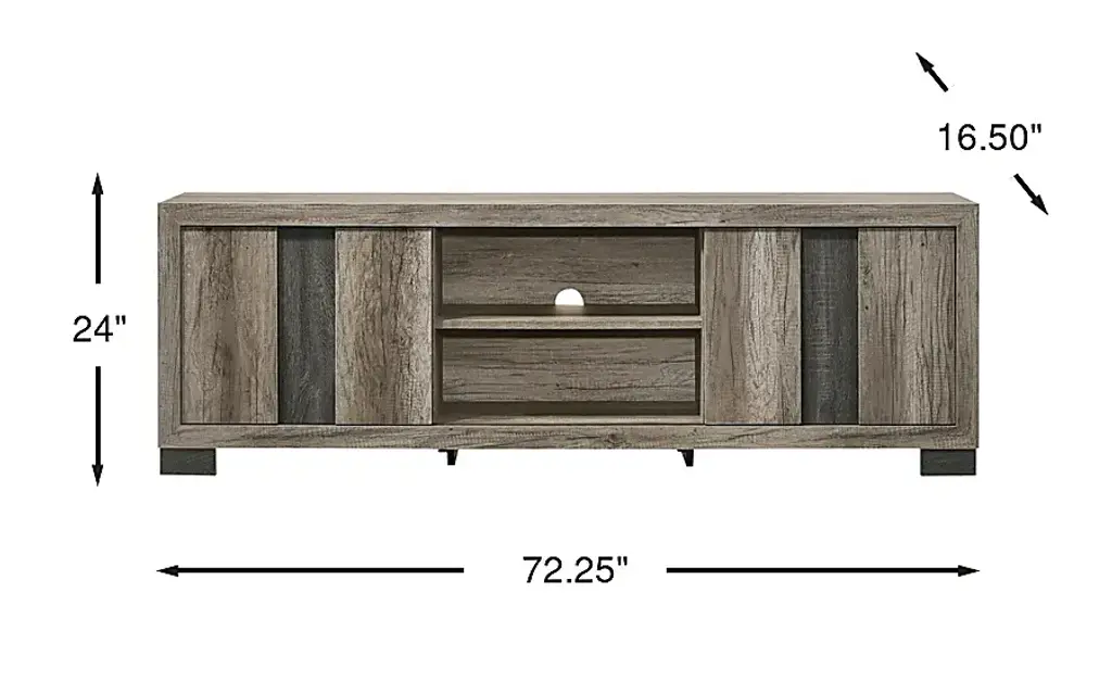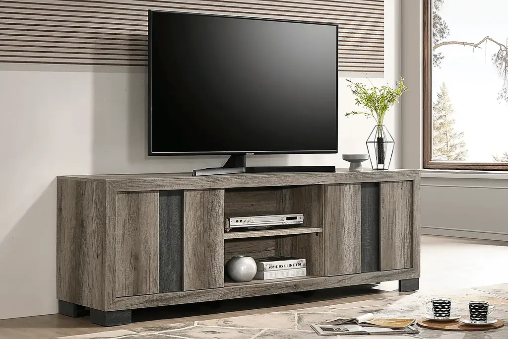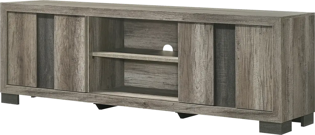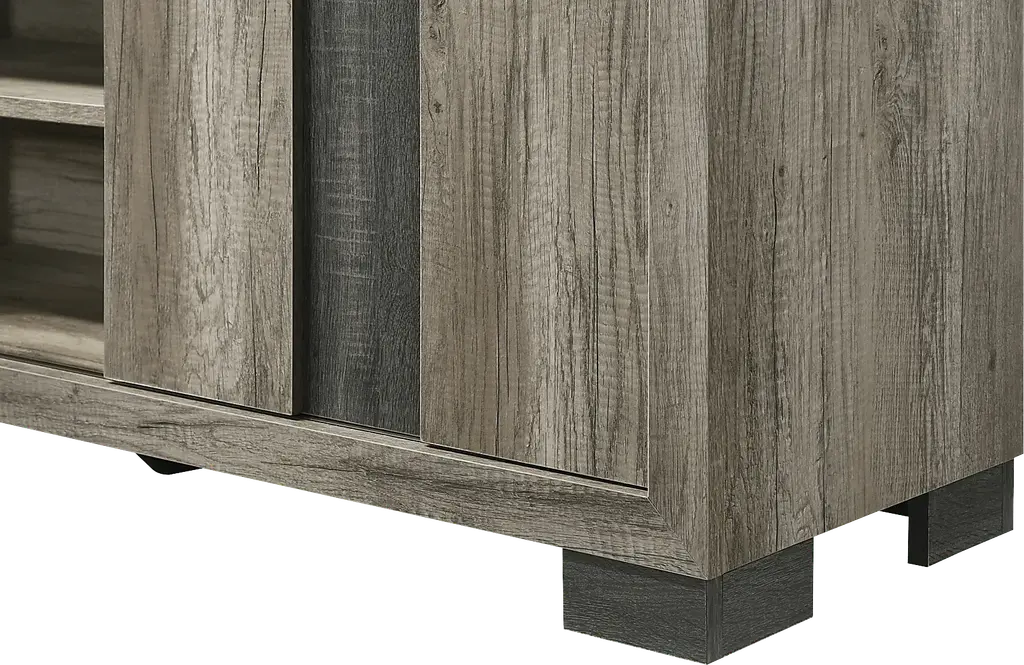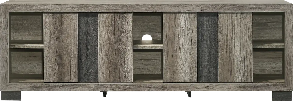 Capturing nature's quiet beauty elevated and refined, the Soundview collection brings natural charm with its rich textures and grounded tones. This contemporary console features a weathered gray finish that highlights a wood-like grain, adding an organic touch to your space. Two sliding doors with dark gray inlay panels reveal two spacious shelves for organized storage, while the center open shelves include wire management holes for a clutter-free setup. To complete the look, square block legs are finished in dark gray.