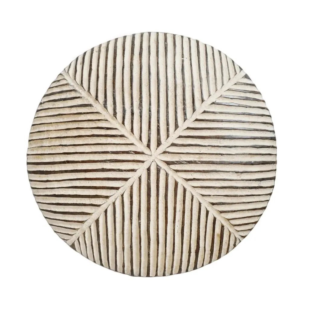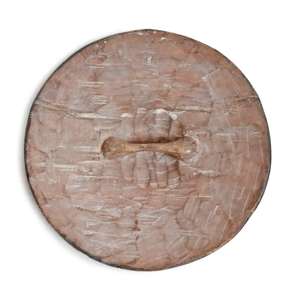 Traditional round South African Zulu shields date back to King Shaka Zulu and have been used by tribesman in battle for hundred of years. As the modern world has evolved so to has the Zulu tribesman. These shields are no longer used in battle but instead used for traditional Zulu ceremonies such as weddings in telling historic ancestry stories. These carved wood designs painted in bold black and white patterns continue to have a striking modern form displayed in groupings. Each may vary slightly due to unique hand carvings and natural imperfections/signs of age are to be expected. Comes with hook attached on back for hanging on wall. Antique white finish.