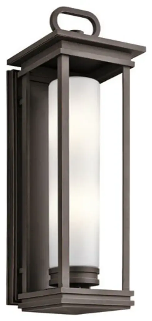 This 1 light wall fixture from the South Hope(TM) collection softens its sturdy rectangular design with Satin Etched Cased Opal Glass for an expertly understated grace and welcoming light. A Rubbed Bronze(TM) finish completes the overall look with a touch of casual style. Open and clean, this design can complement any porch or walkway.