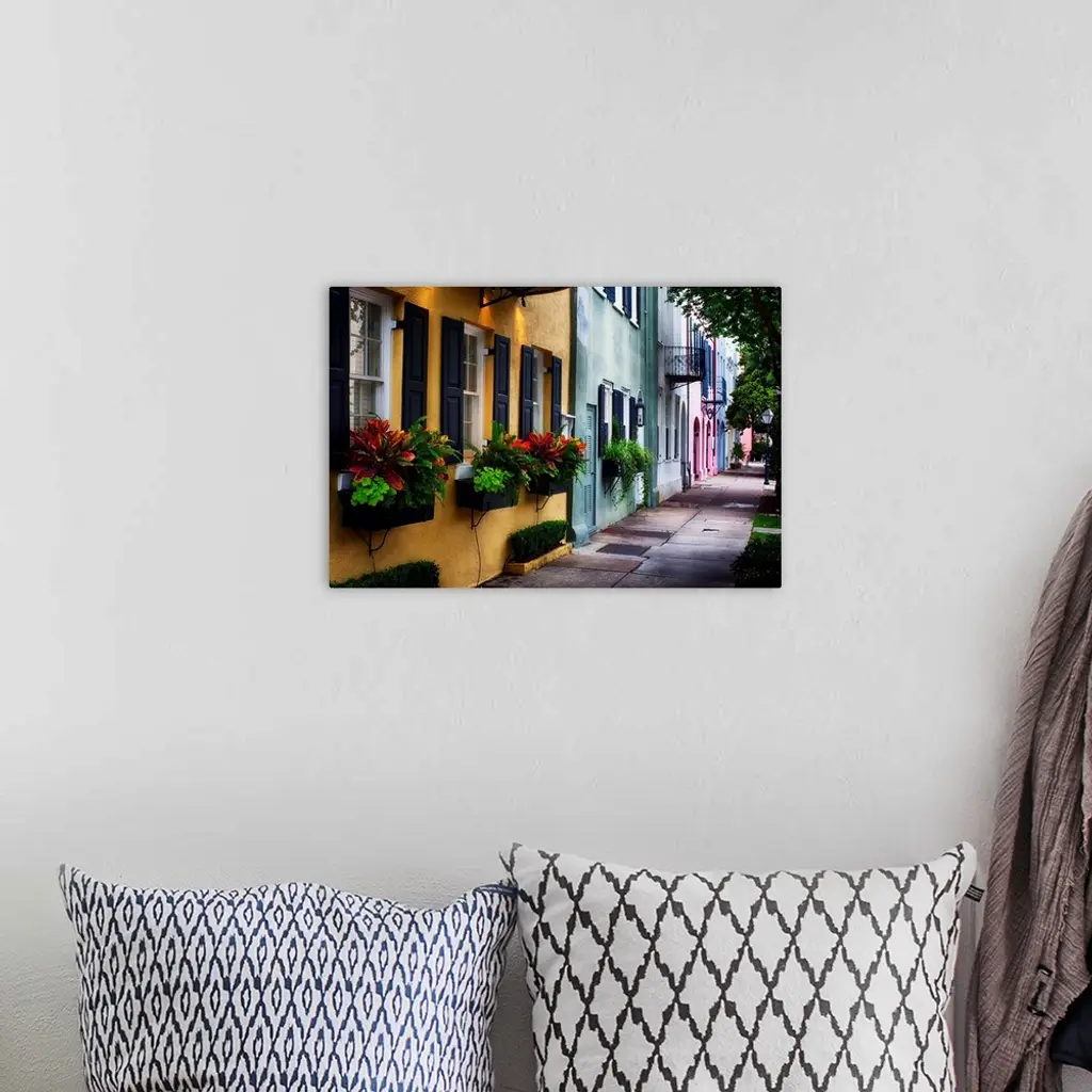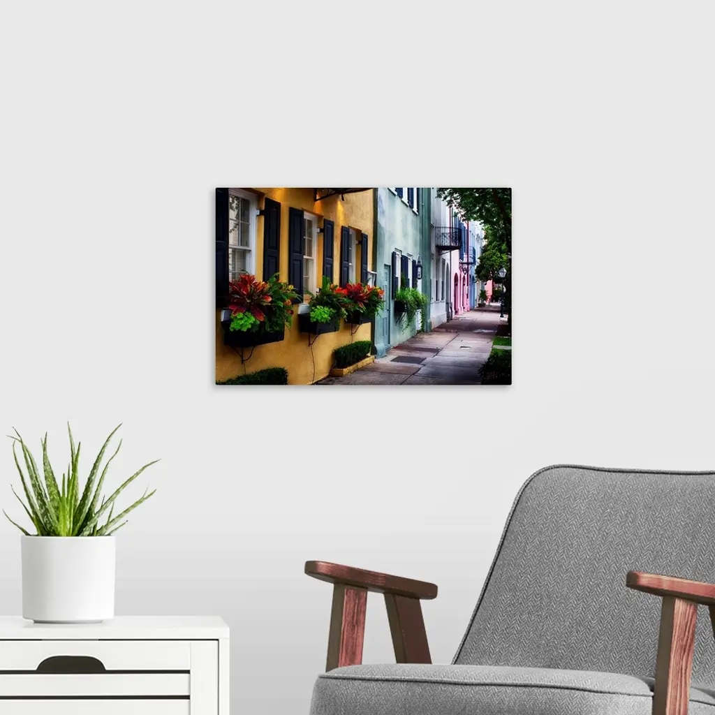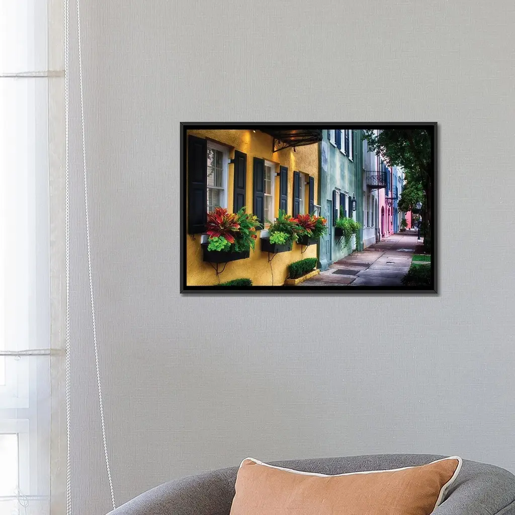Fine art photo of a shaded alley with colorful buildings in Charles, South Carolina.