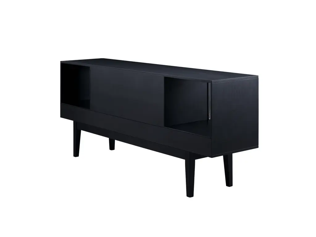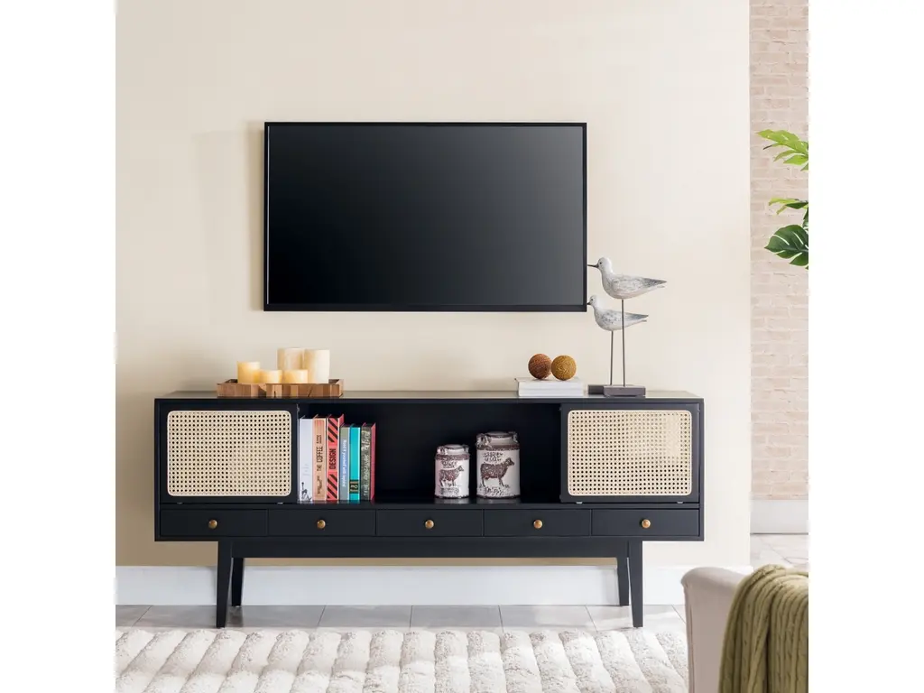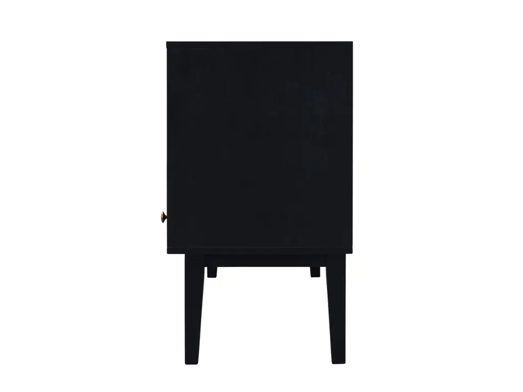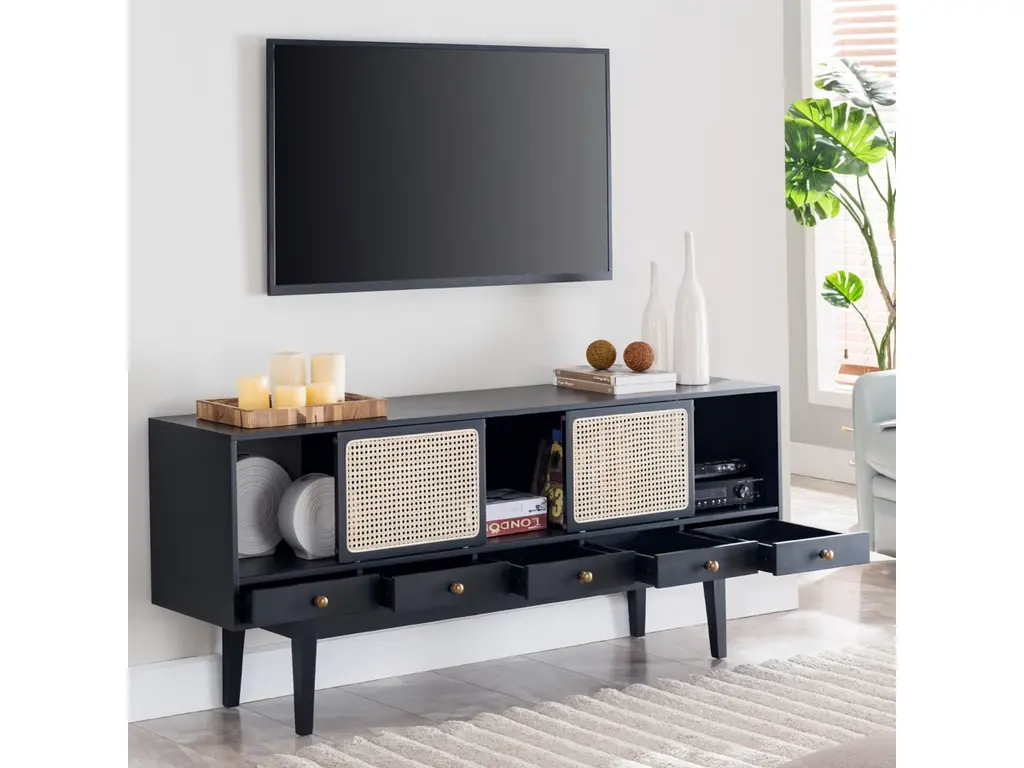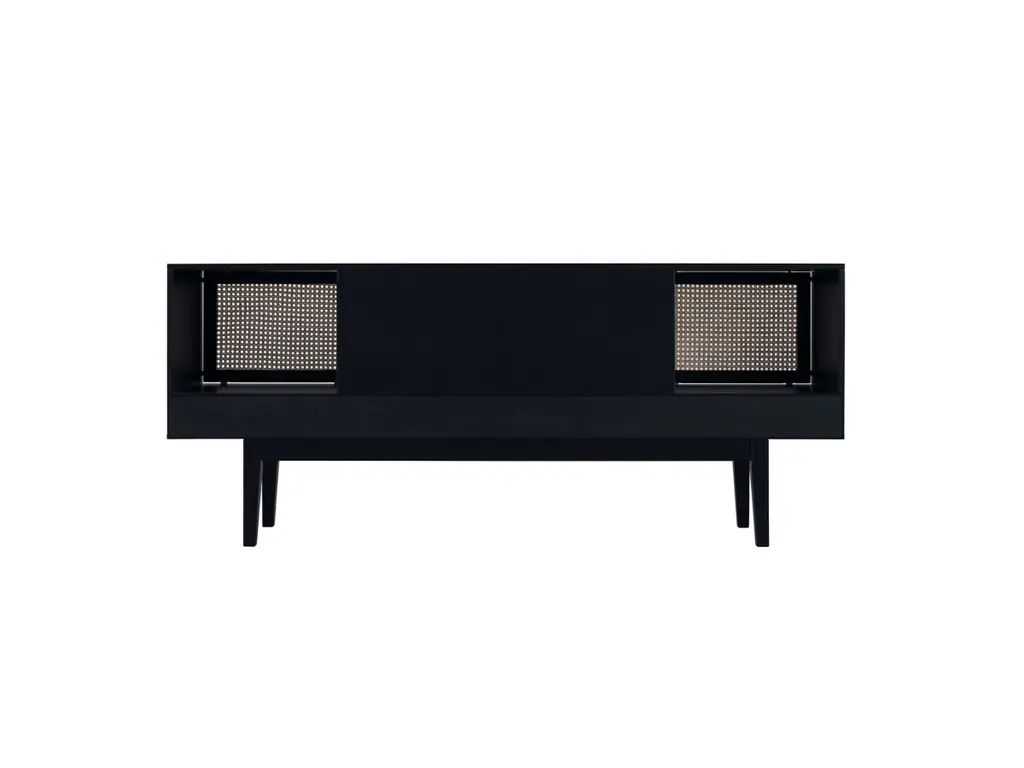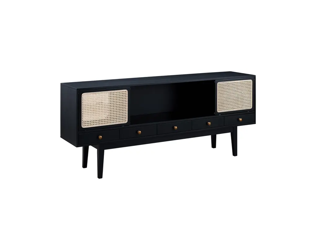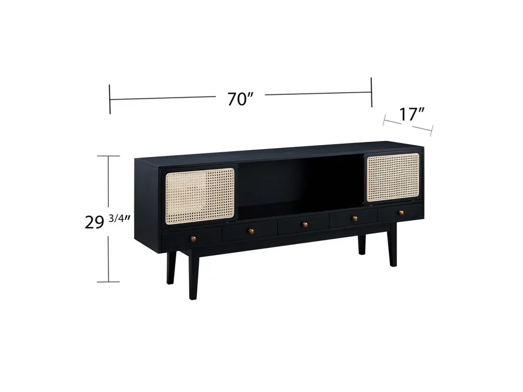 This sleek, chic low-profile TV stand/media console invites you to take it down a notch. Low and wide profile creates such an elevated, high-end aesthetic. Incorporation of cane-front sliding door fronts and tapered legs infuse that much more charm, making this console ideal for modern and mid-century inspired spaces.