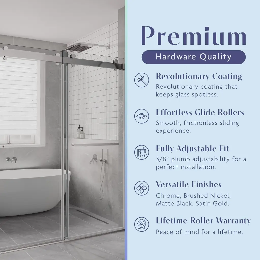 Refine your bathroom with the SP Series shower doors, which are a marvel of style and utility. With an innovative six-seal system (four vertical and two bottom), these doors lock in every drop, keeping your floors spotless after every rinse. Crafted with high-grade stainless steel, the SP Series is built for lasting durability, preventing sagging or bending, a recurring problem with heavy glass doors. Featuring a selection of widths from 48” to 72” and four sleek finishes—Chrome, Brushed Nickel, Matte Black, and Satin Gold—our shower doors add a touch of sophistication to any bathroom. Designed to meet the most stringent safety criteria, including California’s strict building codes, the SP Series is your effortless fix for quality, style, and peace of mind. Enhanced Features: