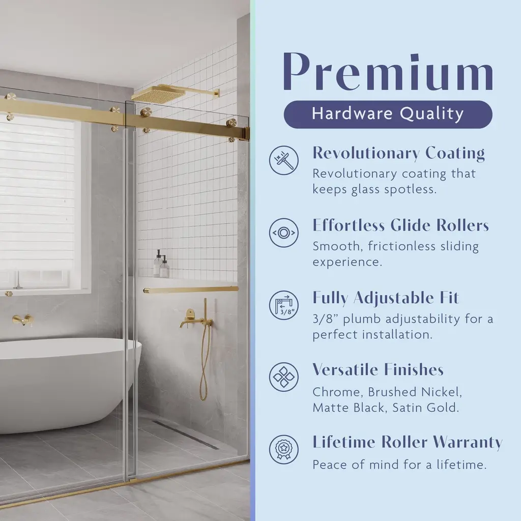 Refine your bathroom with the SP Series shower doors, which are a marvel of style and utility. With an innovative six-seal system (four vertical and two bottom), these doors lock in every drop, keeping your floors spotless after every rinse. Crafted with high-grade stainless steel, the SP Series is built for lasting durability, preventing sagging or bending, a recurring problem with heavy glass doors. Featuring a selection of widths from 48” to 72” and four sleek finishes—Chrome, Brushed Nickel, Matte Black, and Satin Gold—our shower doors add a touch of sophistication to any bathroom. Designed to meet the most stringent safety criteria, including California’s strict building codes, the SP Series is your effortless fix for quality, style, and peace of mind. Enhanced Features: