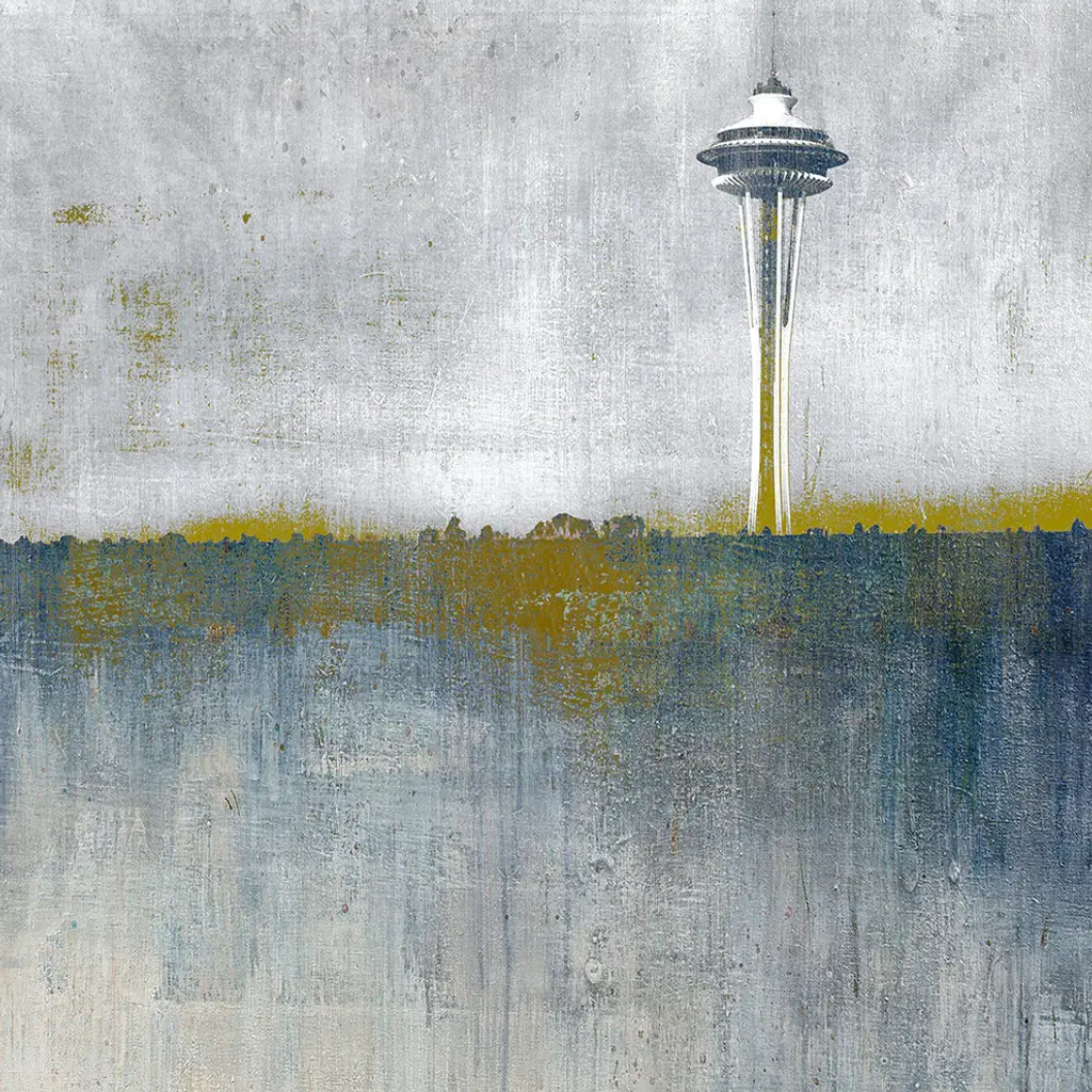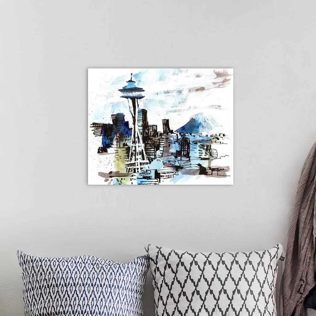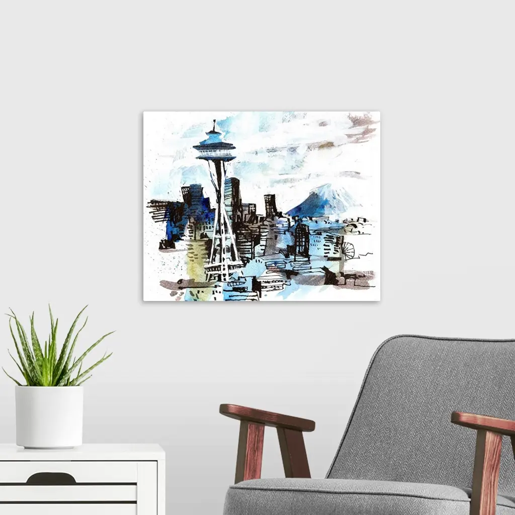 The most famous view of Seattle, seen from Kerry Park in Upper Queen Anne neighborhood, captured in a blocky style in mixed media (watercolor, ink, acrylic). Mount Rainier and the Space Needle are instantly recognizable symbols of the city.