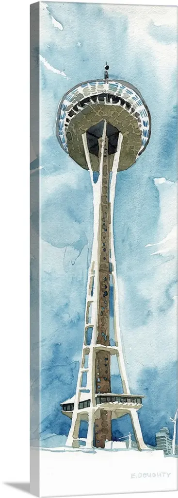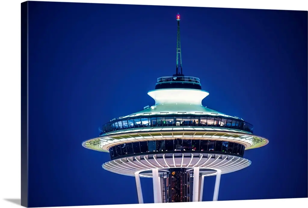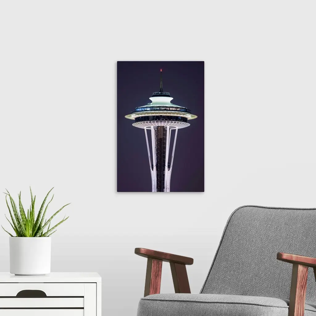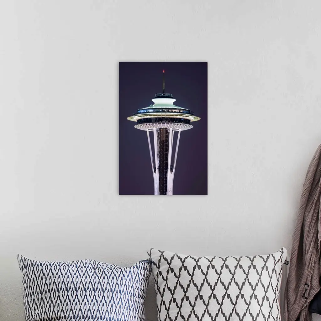 Photograph of the Seattle Space Needle lit up at night with dark purple skies in the background.