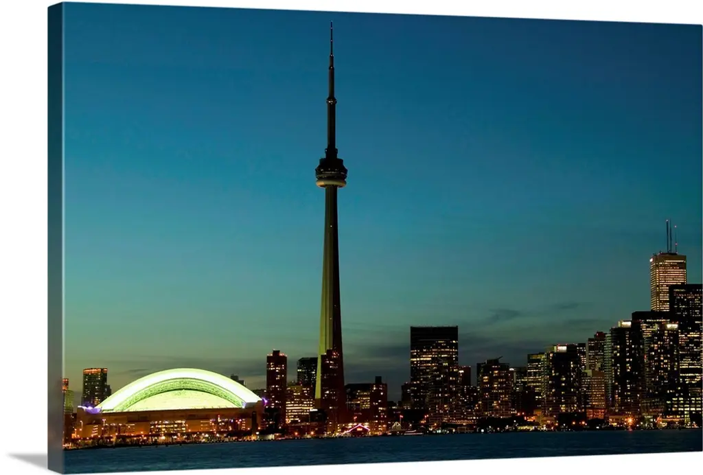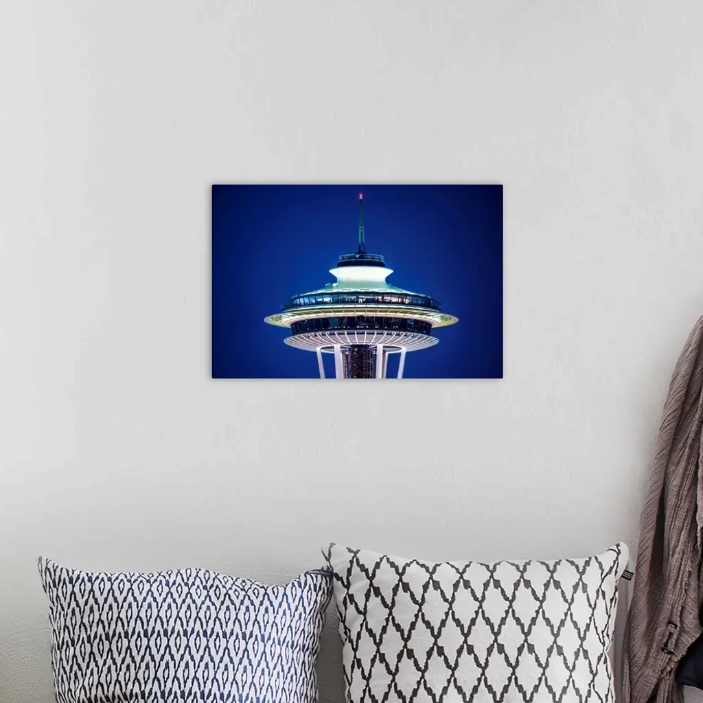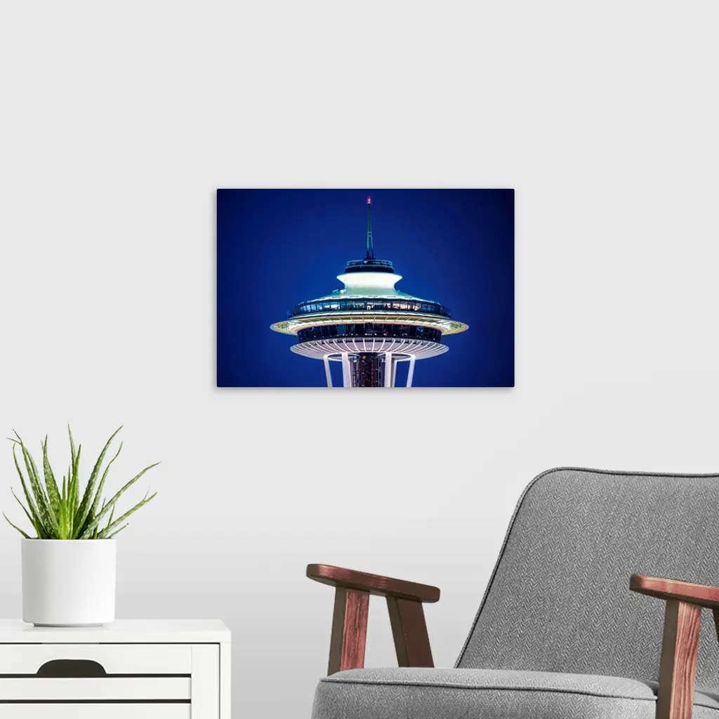 Photograph of the top of the Seattle Space Needle lit up at night on a dark purple sky.