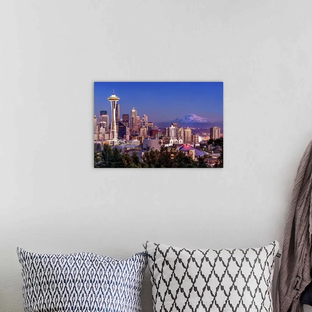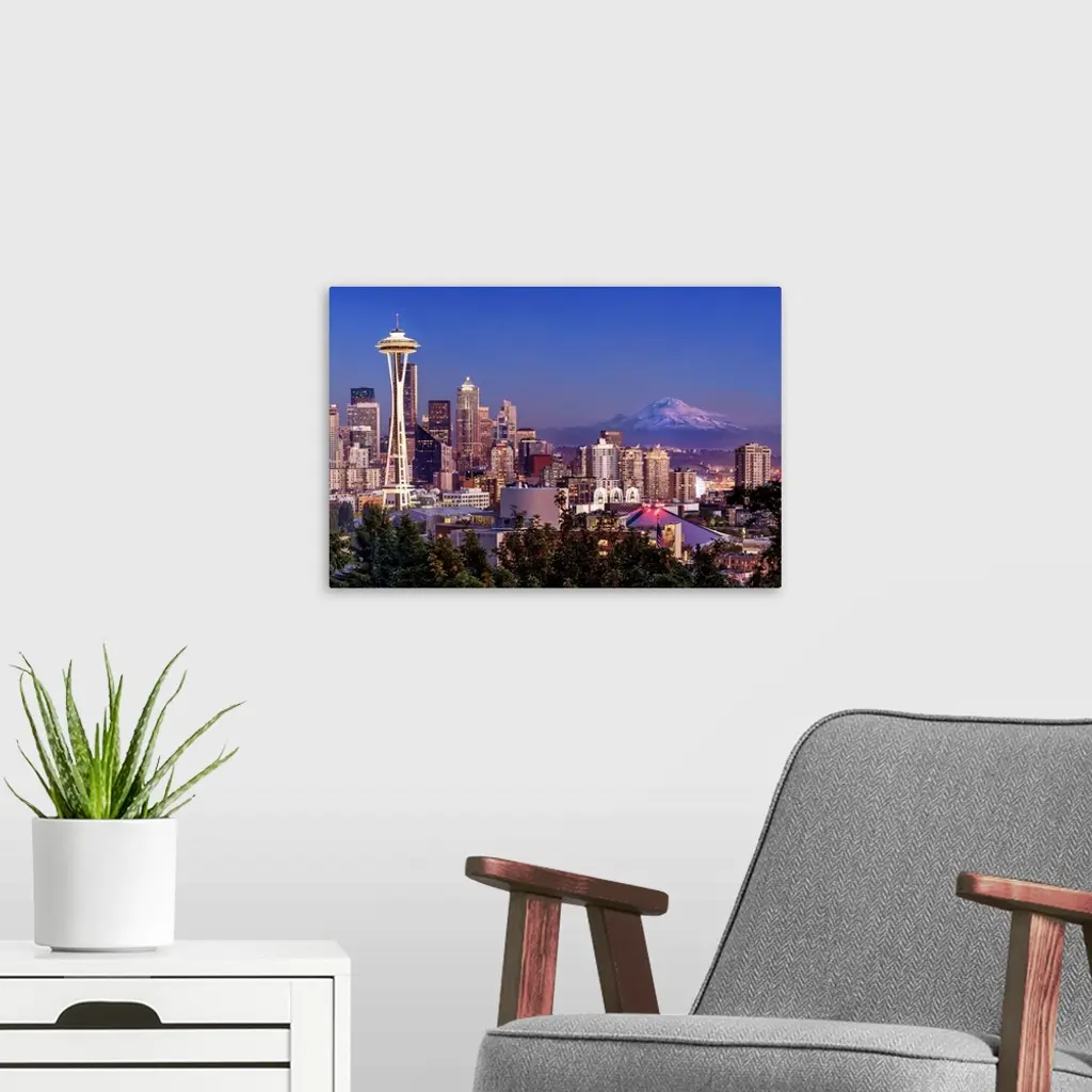 Space Needle, Skyline of Seattle Downtown, with Mount Rainier in the background Seattle, Washington State, USA
