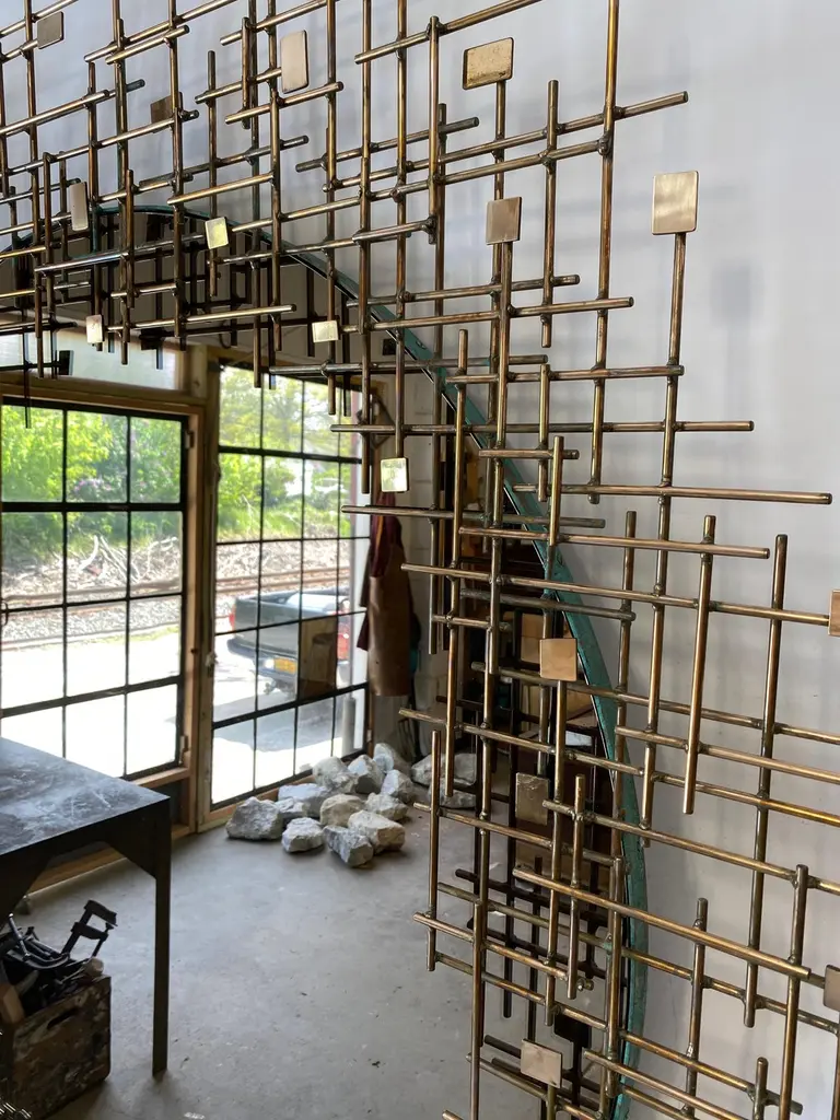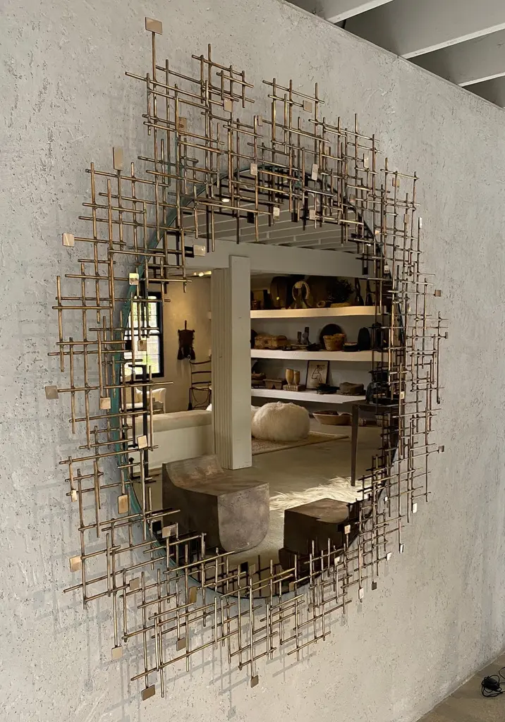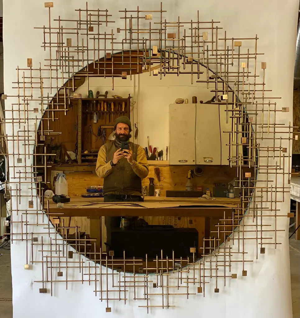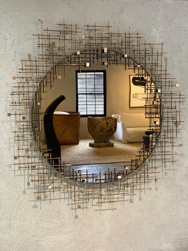 A beautiful bronze tinted mirror with a lattice work of bronze framing. Subtle patina runs throughout the piece.