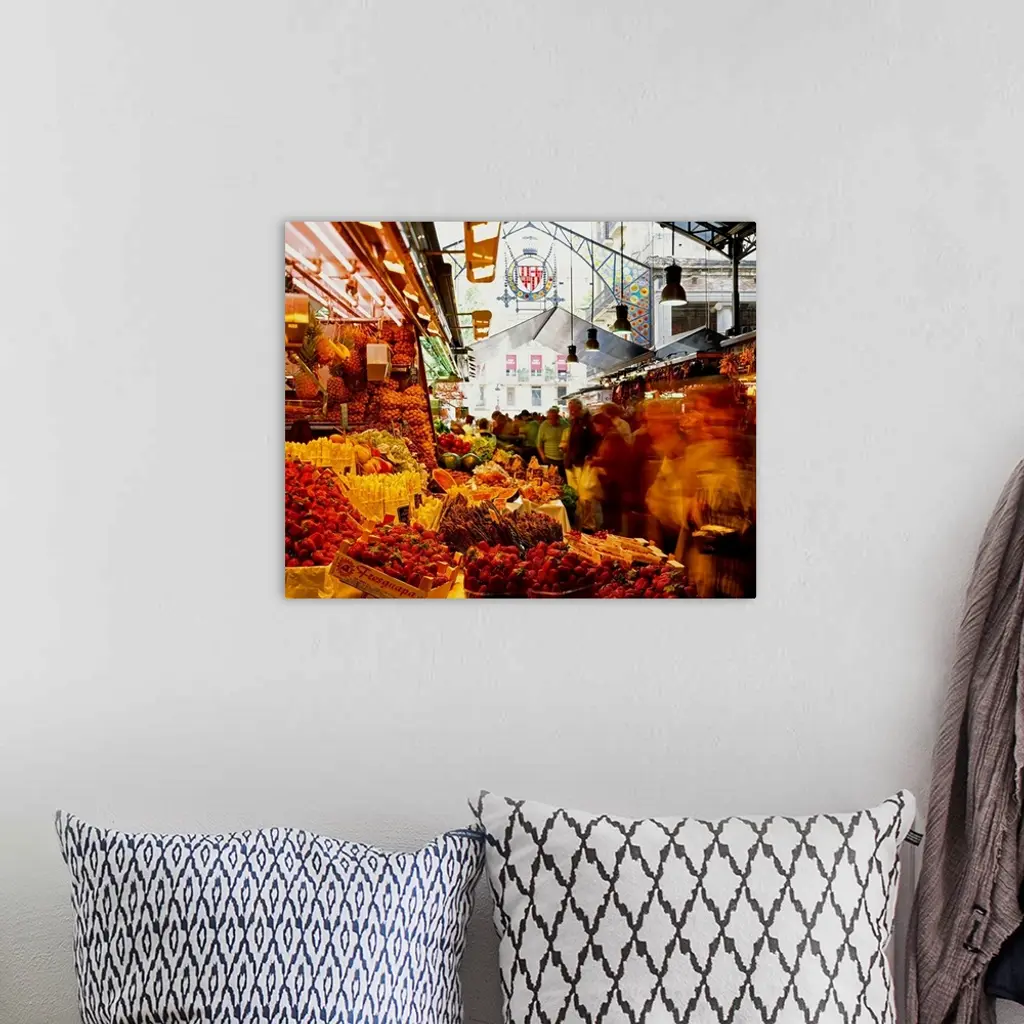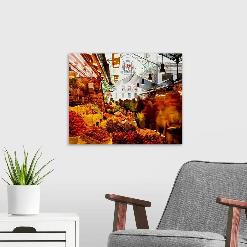 Spain, Catalonia, Barcelona, La Boqueria, a famous market wall art for home and office decor. Discover canvas art prints, photos, mural, big canvas art and framed wall art in GreatBigCanvas.com's varied collections.