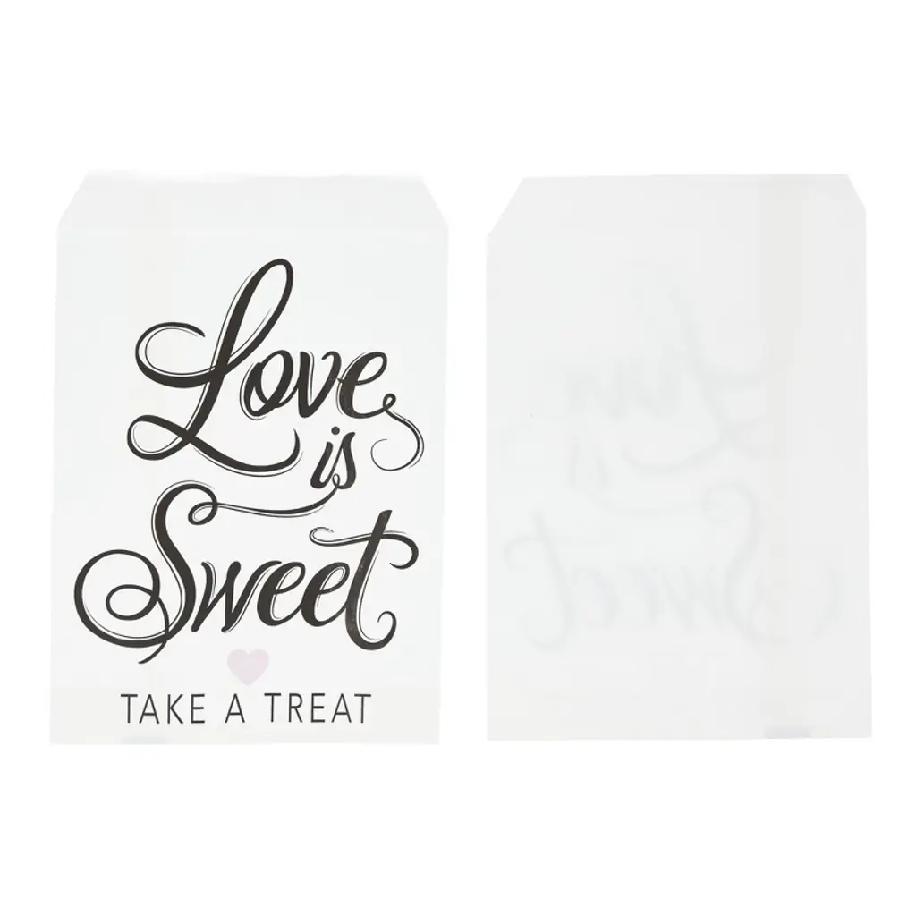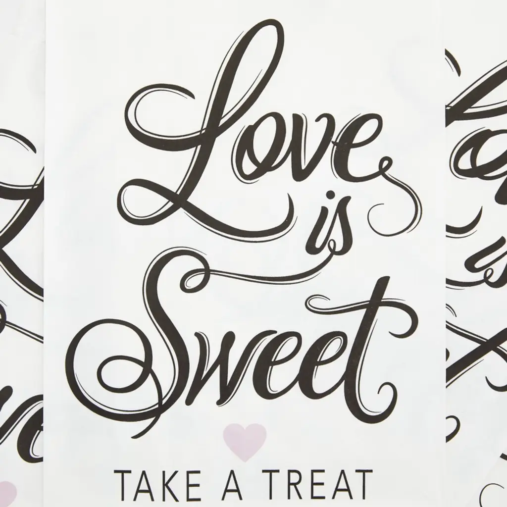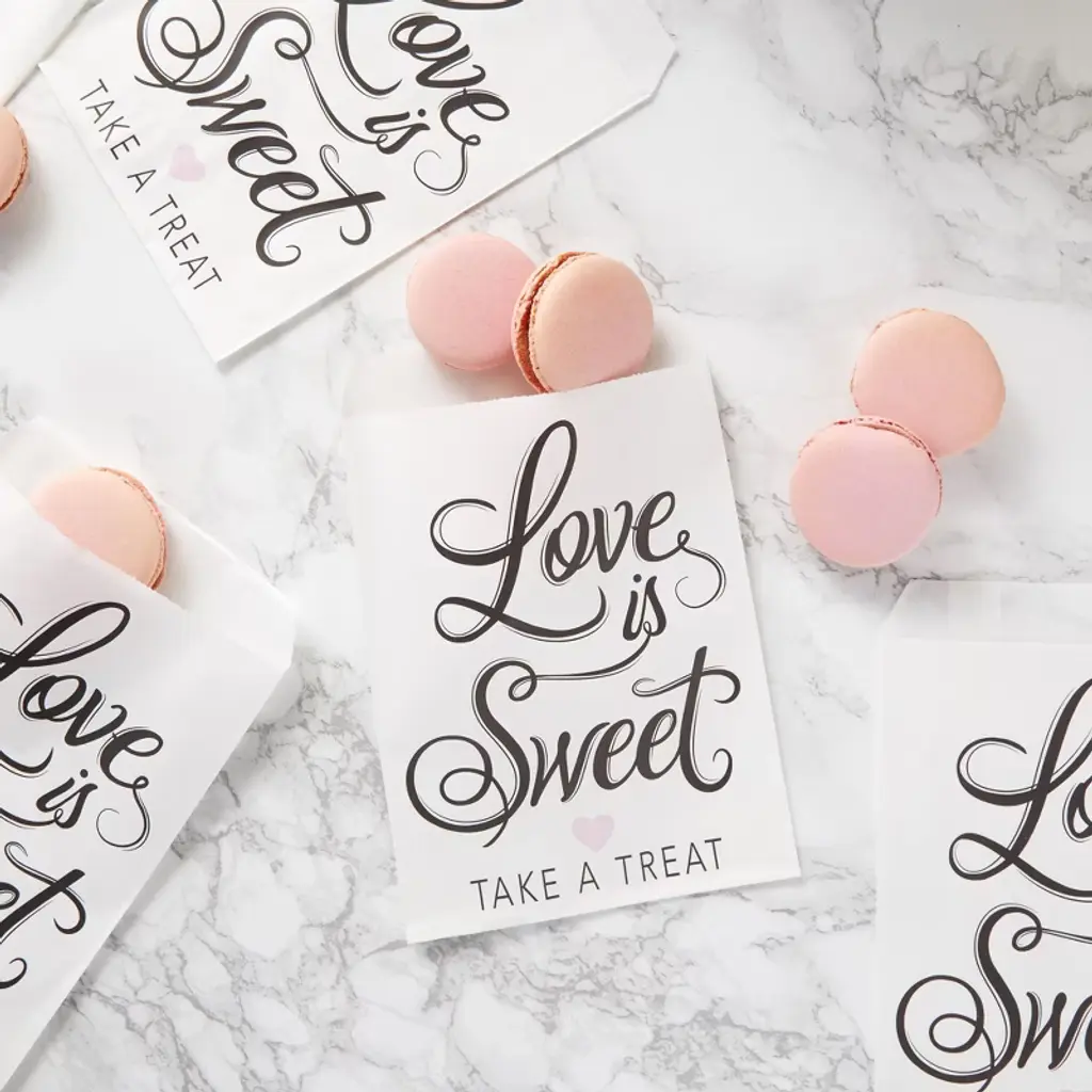 Get these lovely wedding favor bags into the mix for your big day! These white treat bags feature the phrase "Love is Sweet, Take a Treat," in a beautiful black script and a cute pink heart. Fill the 100 bulk bags with cookies, chocolates, macaroons, candy, popcorn or other confectionary delights. Use these treat bags for the bridal shower, engagement party, rehearsal dinner or the wedding itself!