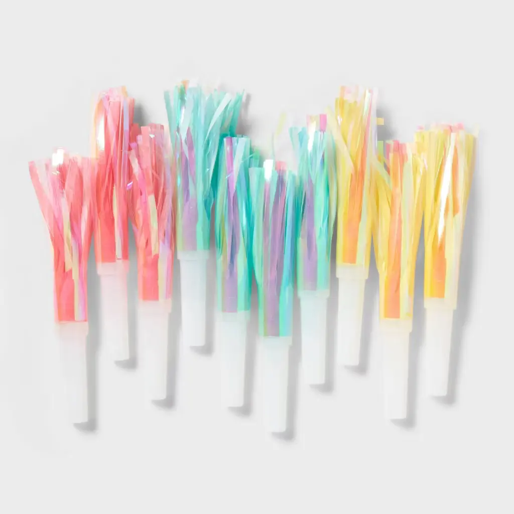 Celebrate your baby's impending arrival with this set of pink and blue gender reveal party confetti wands. Distribute the confetti flutter sticks with the pink or blue confetti to your guests at the start of the party. The silver holographic foil exterior doesn't reveal the color of the confetti inside. Only after your guests remove the caps and fling the tissue paper confetti into the air to create a pink or blue shower will they know that you will be having a boy or girl. These gender-reveal decorations are 0.8 inches in diameter and 13.8 inches long. You will get 12 total confetti wands, 6 with pink confetti and 6 with blue confetti inside.