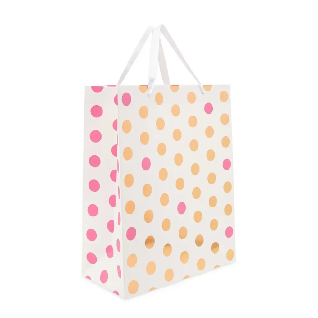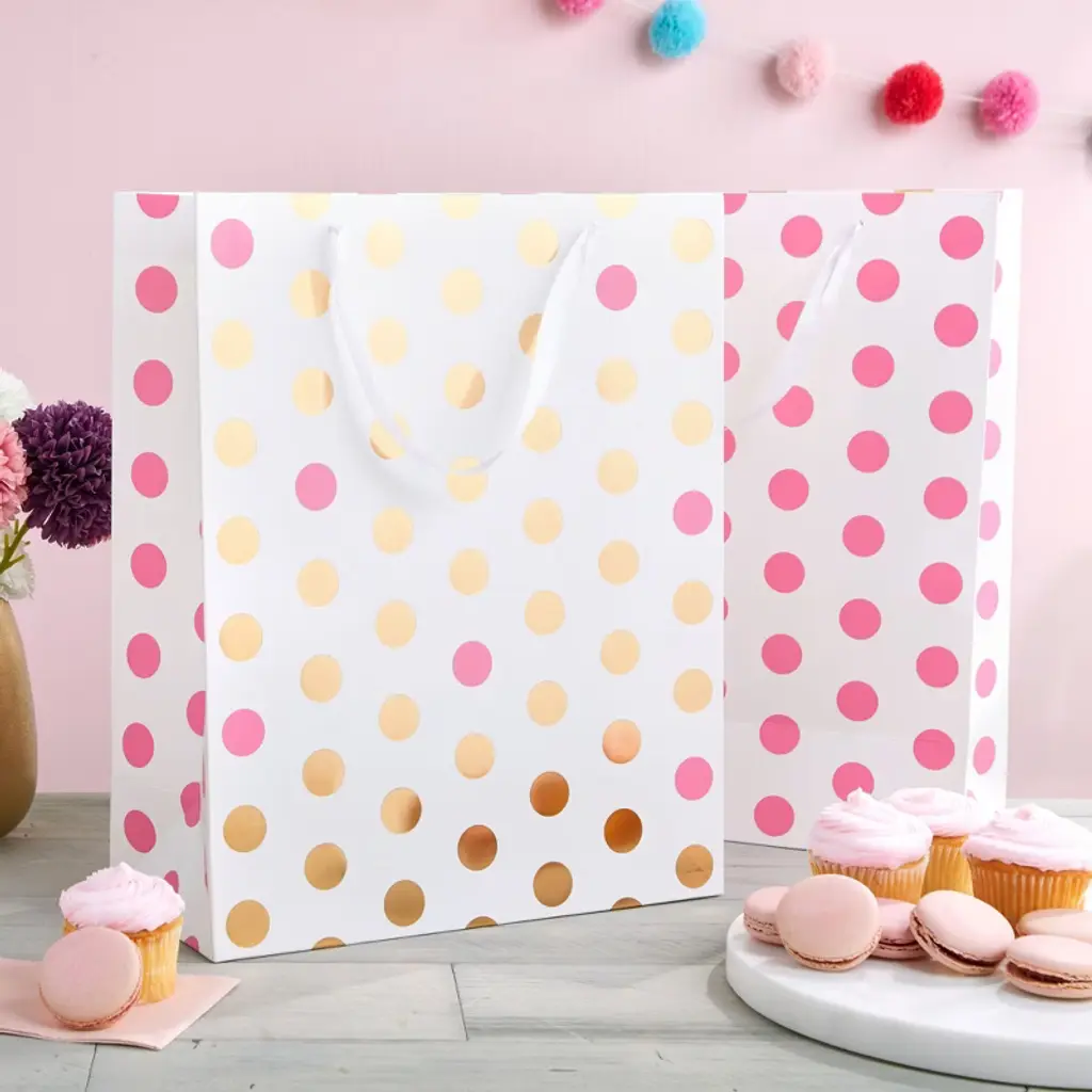 Make any friend or loved one feel special when you give them a gift in this set of 6 large gift bags. These beautifully designed pink polka dot gift bags are quick and easy packaging solutions for any celebratory occasion, trade show, or retail shop. The large birthday gift bags are ideal for creating personalized gifts for an upcoming wedding, bay shower, bridal shower, anniversary, retirement party, or holiday celebration. Each extra large gift bag measures 12.5 x 15.5 inches, perfectly sized to hold clothing, toys, home decor, or treats.