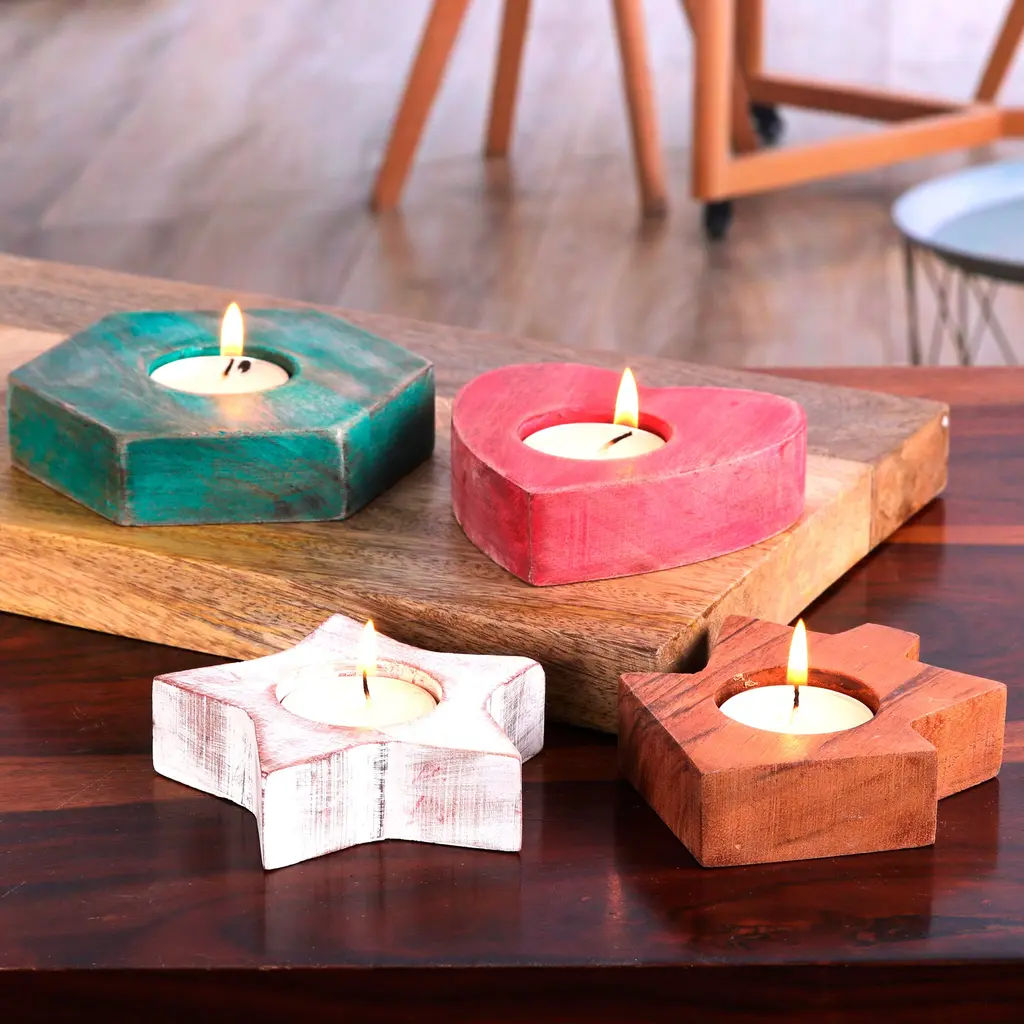 Sparkle and shimmer abound in this set of eight tea lights in assorted colors presented by Arti Sharma of India. Each round tea light candle has an aluminum frame coated in luminous resin embedded with small diamond-shaped glass pieces, glitter and beads.