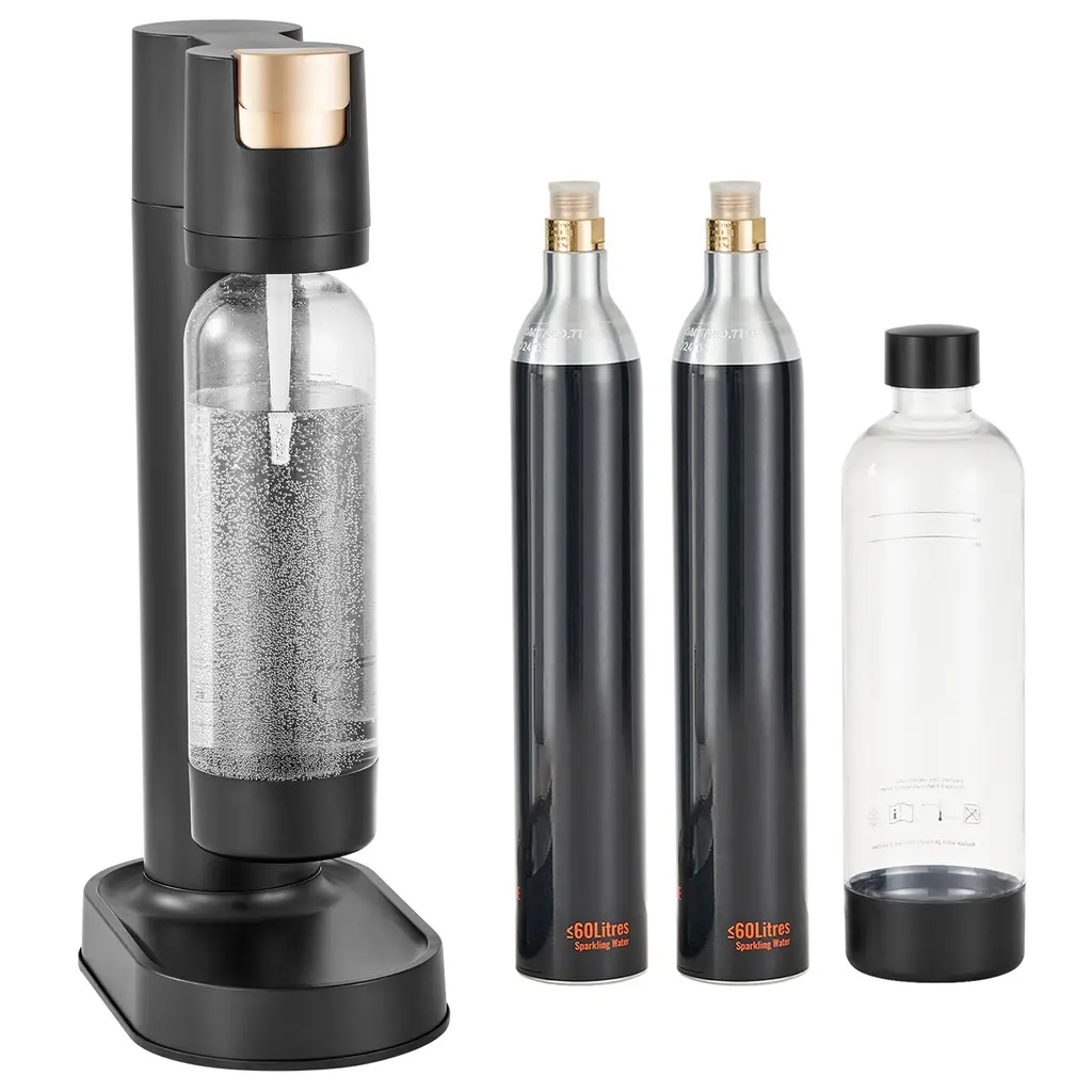 NOTE: The cylinder is empty and does not contain CO2 gas. Cool and Healthy: Our sparkling water maker allows you to craft your own natural soda water, reducing bodily stress while offering a refreshing, healthy, and energizing drink. Enjoy creating a variety of colorful beverages anytime, anywhere, indulging in the joy of making soda water, juice, wine, cocktails, or beer. It also makes a great gift to share happiness with friends. Instant Enjoyment: All you need to do is fill the bottle with clean, cold water, screw in a 60L CO2 cylinder, and press the carbonation button for 2-3 seconds to achieve your desired taste of richly flavored, cool, bubbly water. With a dissolution rate of up to 60%, this soda maker machine provides you with full-bodied bubbles and a cool taste. However, please ensure not to carbonate for more than 5 seconds at a time and use cold water between 4-5°C for richer bubbles and a better taste. Cost-effective and Sustainable: We provide you with 2 1L food-grade PET bottles with caps for convenient storage. This sparkling water and soda maker includes 2 CO2 cylinders (the cylinder is empty and does not contain CO2 gas). With a replaceable cylinder design compatible with mainstream soda brands' 60L CO2 cylinders, one cylinder can make 180 bottles of soda water (330ml per bottle), making it more economical and eco-friendly for repeated use. Secure Safeguarding: The safety valve automatically opens to release excess gas when the bottle reaches a certain pressure, ensuring automatic depressurization for safety and preventing the bottle from exploding. Thanks to the excellent nozzle design, you won't have to worry about clogging or freezing. It's truly reliable! About the CO2 Cylinder valve thread: North America/Europe is Tr21, Australia is G1/2 and CGA320. No Electricity Needed: This sparkling water maker kit doesn't require electricity or batteries, enhancing its flexibility and portability. With an excellent design and sleek profile, it perfectly integrates into your home or office space. You can also find it in coffee & beverage shops, at camping & gatherings, making it suitable for various occasions! Package Content 1 x Sparkling Water Maker 1 x Set of Accessories