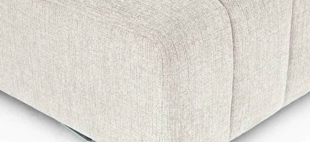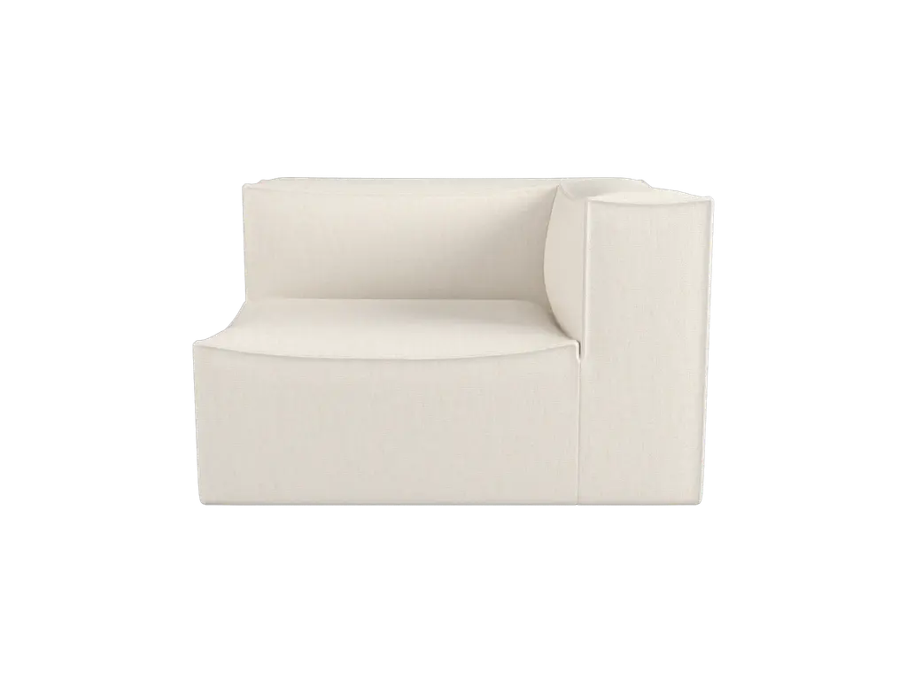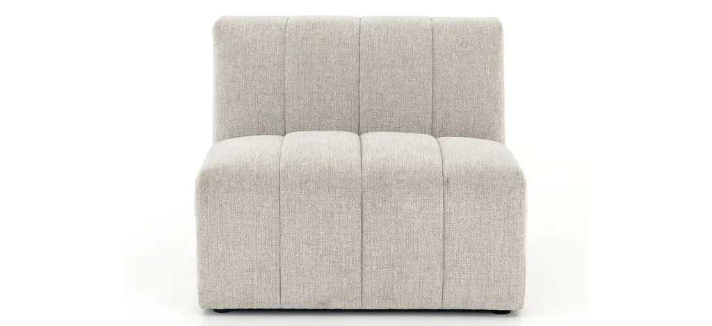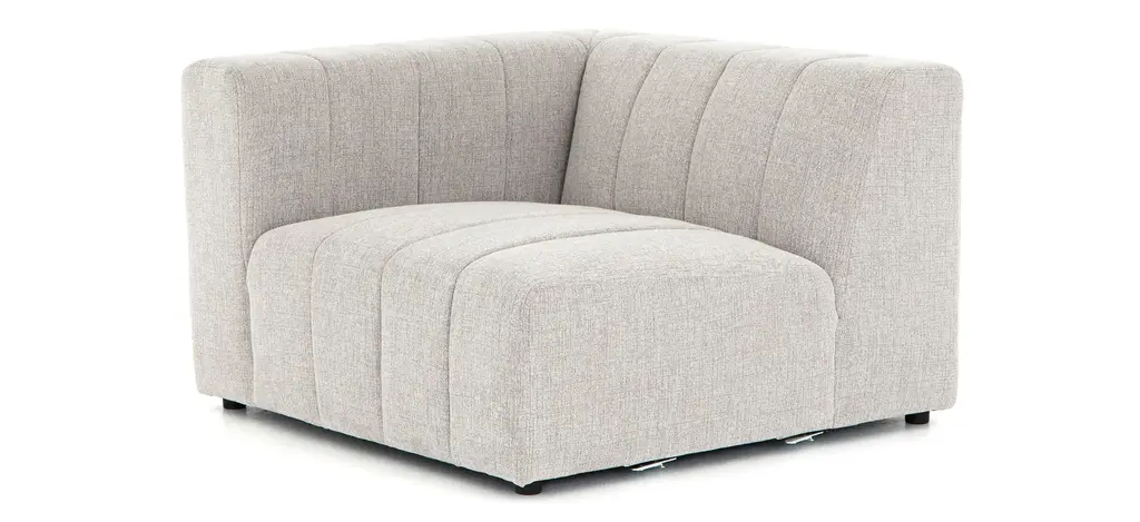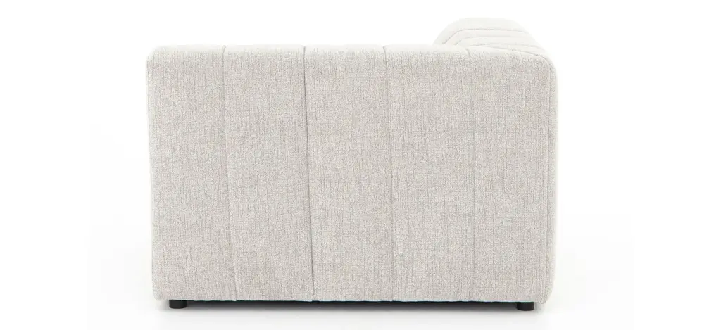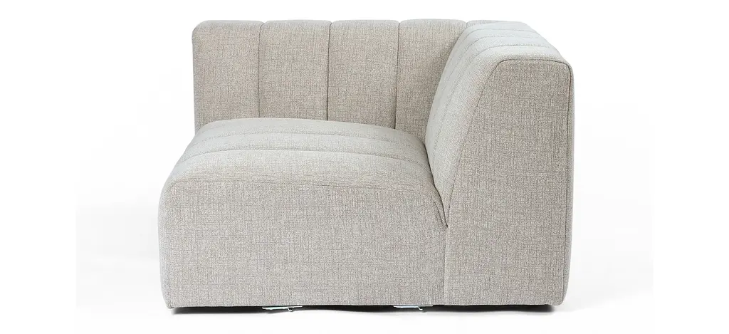 The Sparrow modular left-arm-facing chair features wide, vertical channels and low styling. The chair offers a textural sense to sandstone-colored covering.
