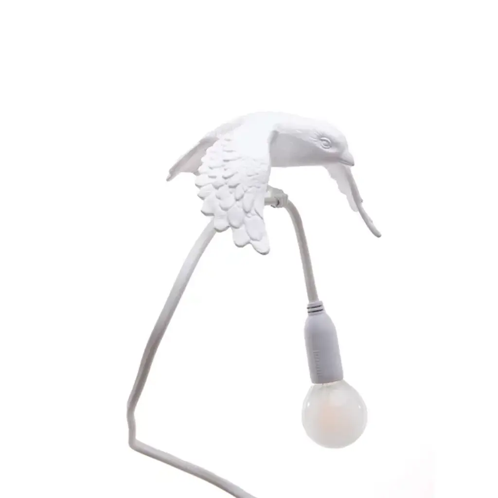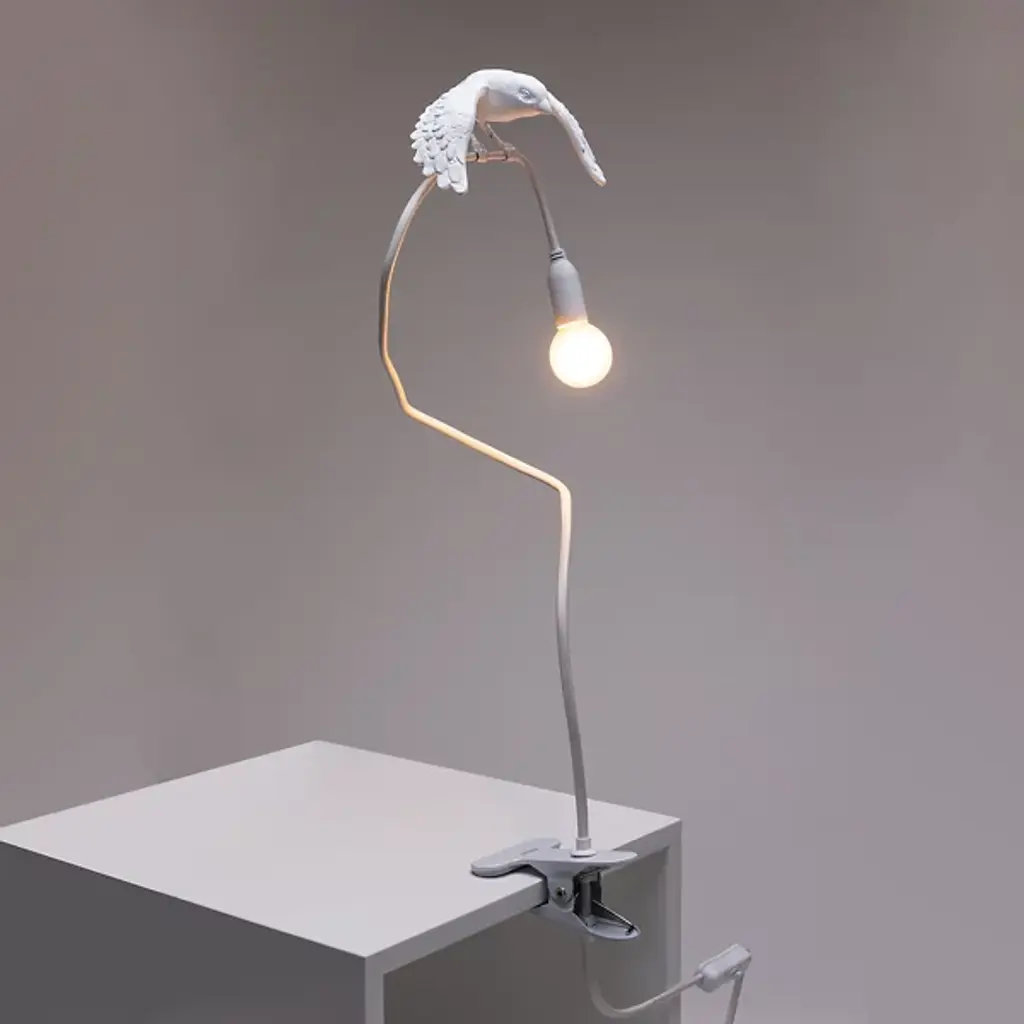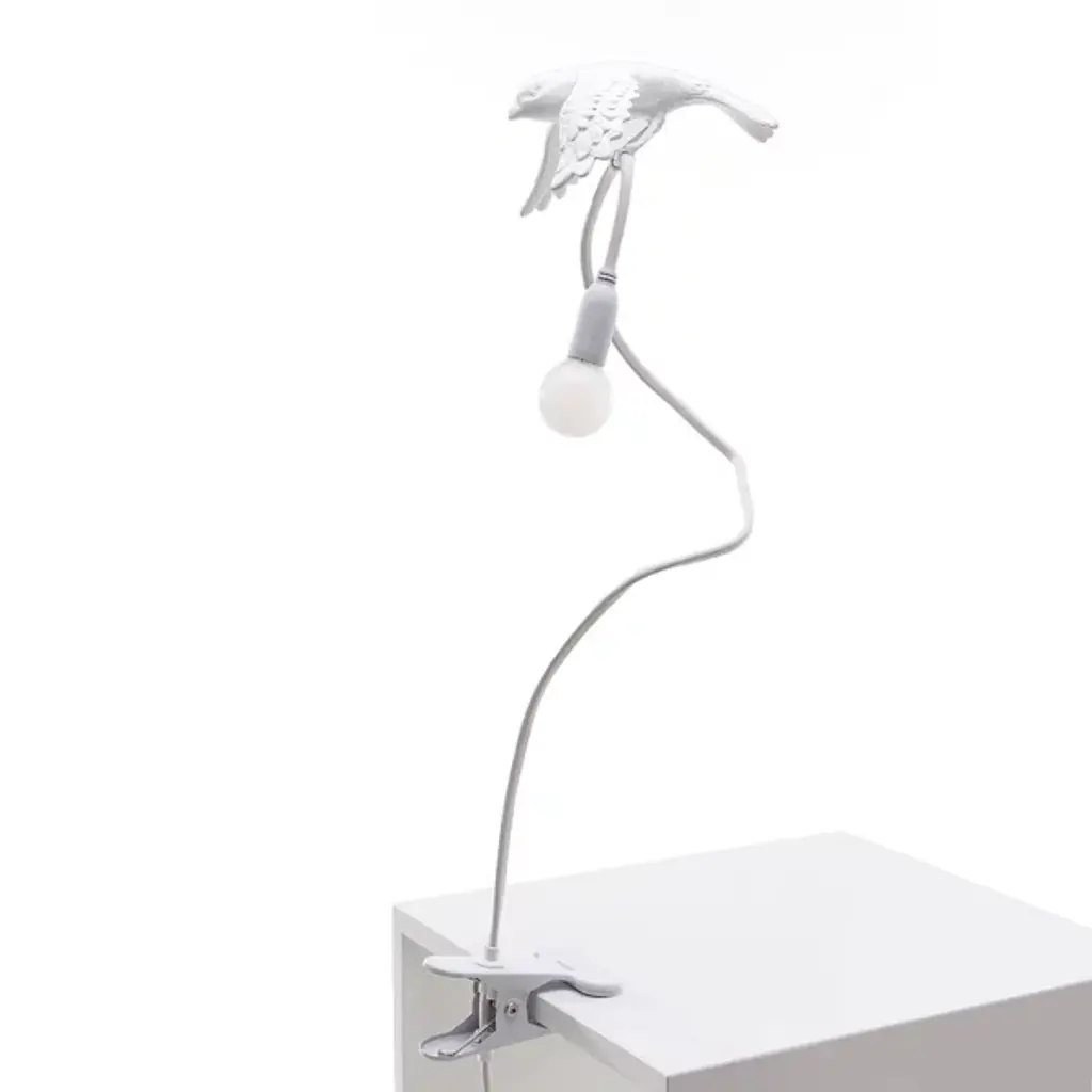 Illuminate your indoor spaces with the playful whimsy of the Sparrow Taking Off Clamp Lamp from Seletti. Crafted by the creative mind of Marcantonio, this playful fixture embodies the energetic movements of birds through its vibrant sculpture. Constructed with precision from resin and steel, it showcases an extending cord ingeniously secured by the legs of a sculpted sparrow. The design depicts a bird in a memorable rising action; the lamp's versatile base allows for easy clamping onto any compatible surface, infusing the environment with a lively, natural presence that uplifts the ambiance of any room.