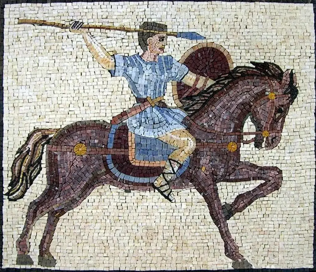 This mosaic illustrates a Spartan warrior wearing blue riding his brown horse. The warrior is carrying a spear in one hand and an armor in the other hand he looks ready to attack. It is composed of 100% natural stones and art tiles and can be placed on any wall in the home or the office.