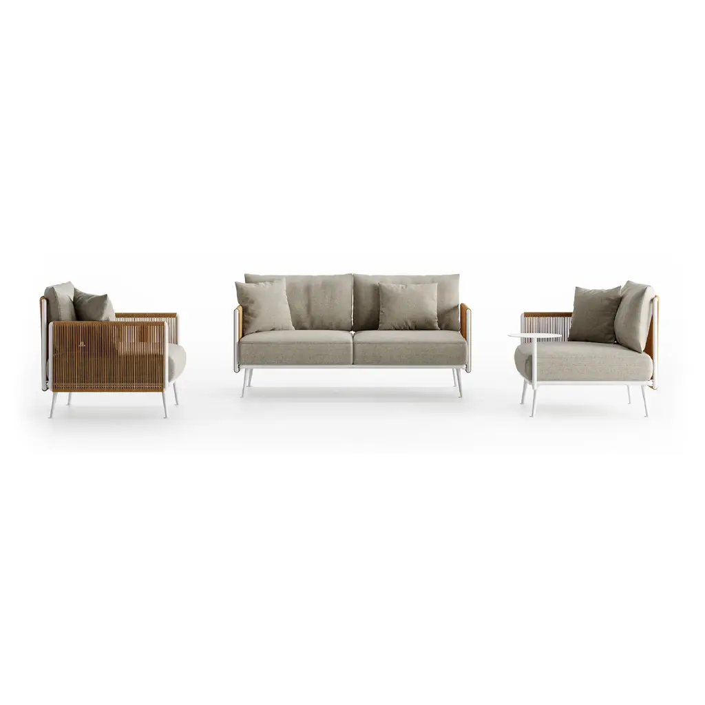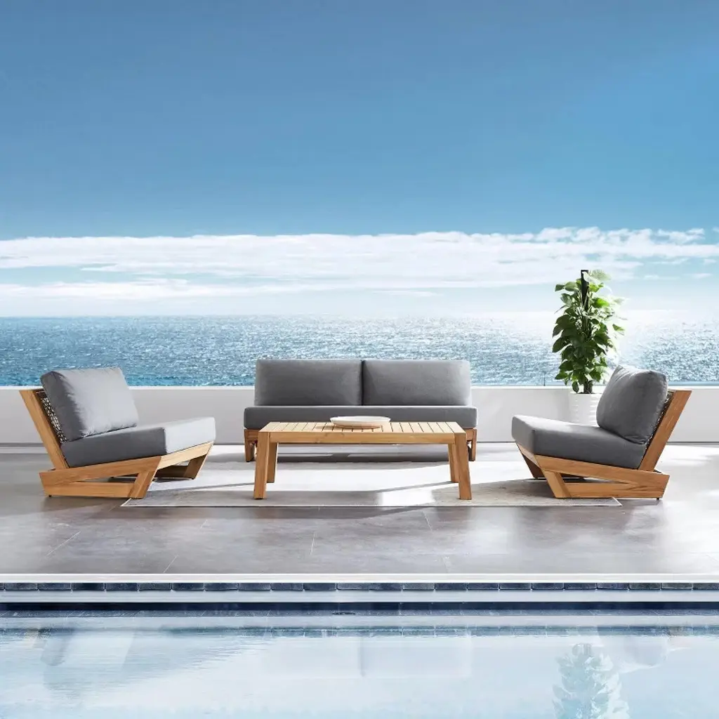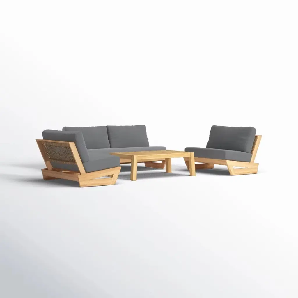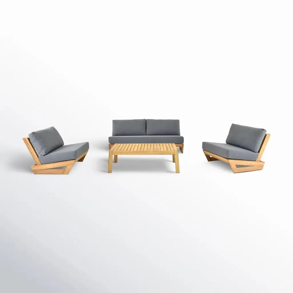 Experience refined relaxation with this 4piece symmetrical patio set featuring two individual loungers, a sofa unit, and rectangular coffee table. Sustainably sourced timber frames support engineered performanceknit cushions for advanced breathability and allweather endurance. Precisioncrafted joinery ensures stability across lawn, patio, or balcony surfaces while geometric table architecture complements the cleanline design. Vertically slated armrests provide airflow and tactile sophistication.