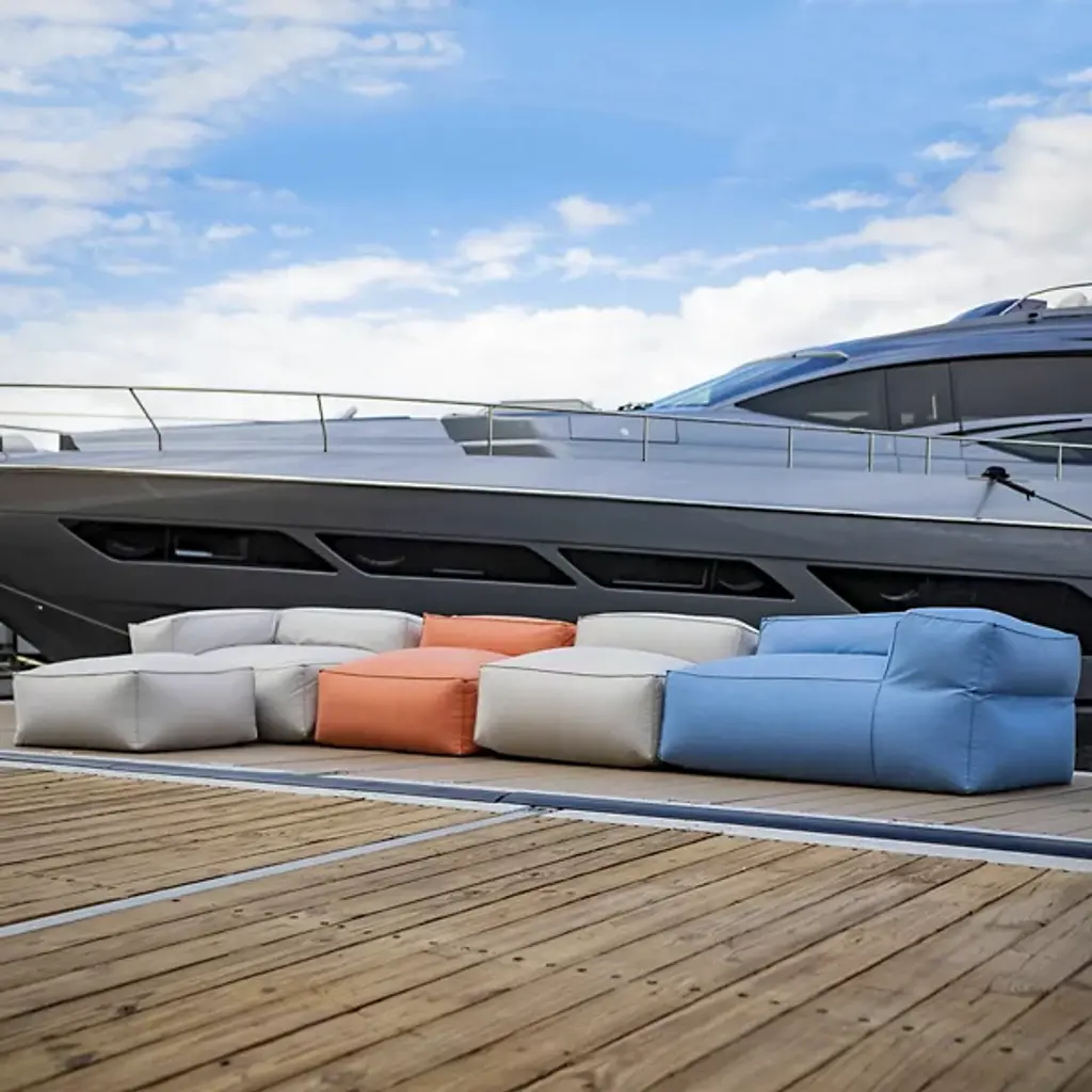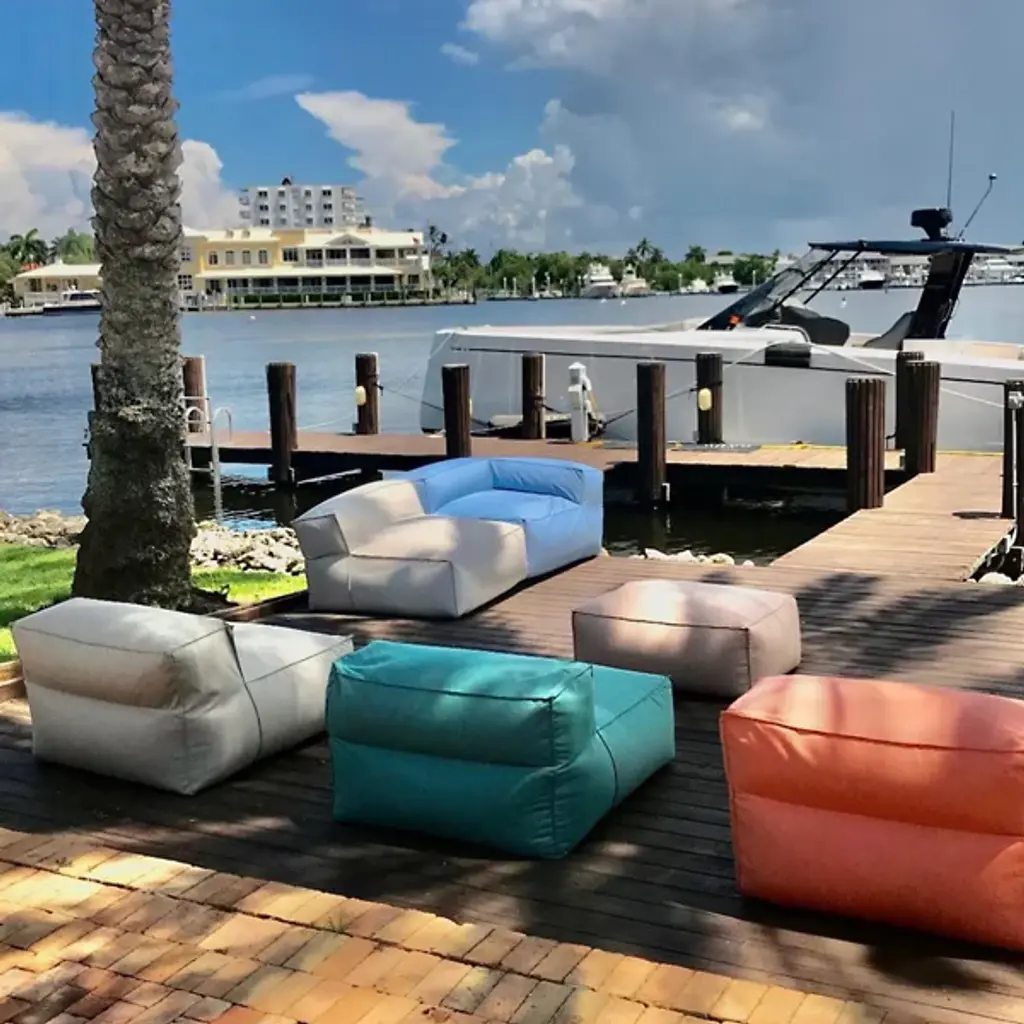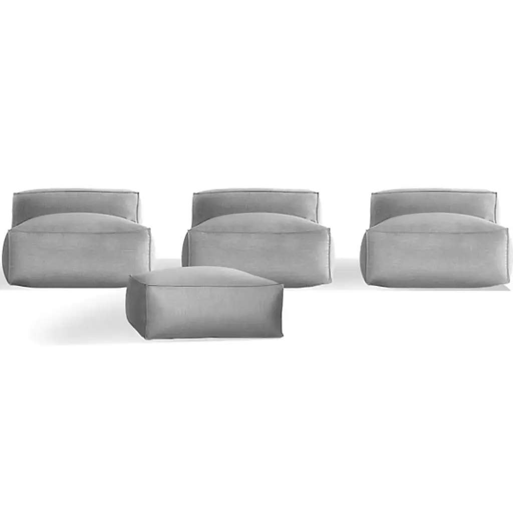 The Spazio Outdoor Chair Set of 3 with Ottoman from Spazio is a gathering of plump comfort styled with European finesse. The low-profile geometric shapes at play make the set a great pairing with the modern or contemporary home style. The chairs stand out in an L-shaped silhouette defined by fabric upholstery. The sunbrella fabric stays strong across all seasons outdoors. A bevy of beads fills in the fabric to give it a plump look. When laying on top of the chairs and ottoman, the beads follow one’s natural curvature for a restful experience.