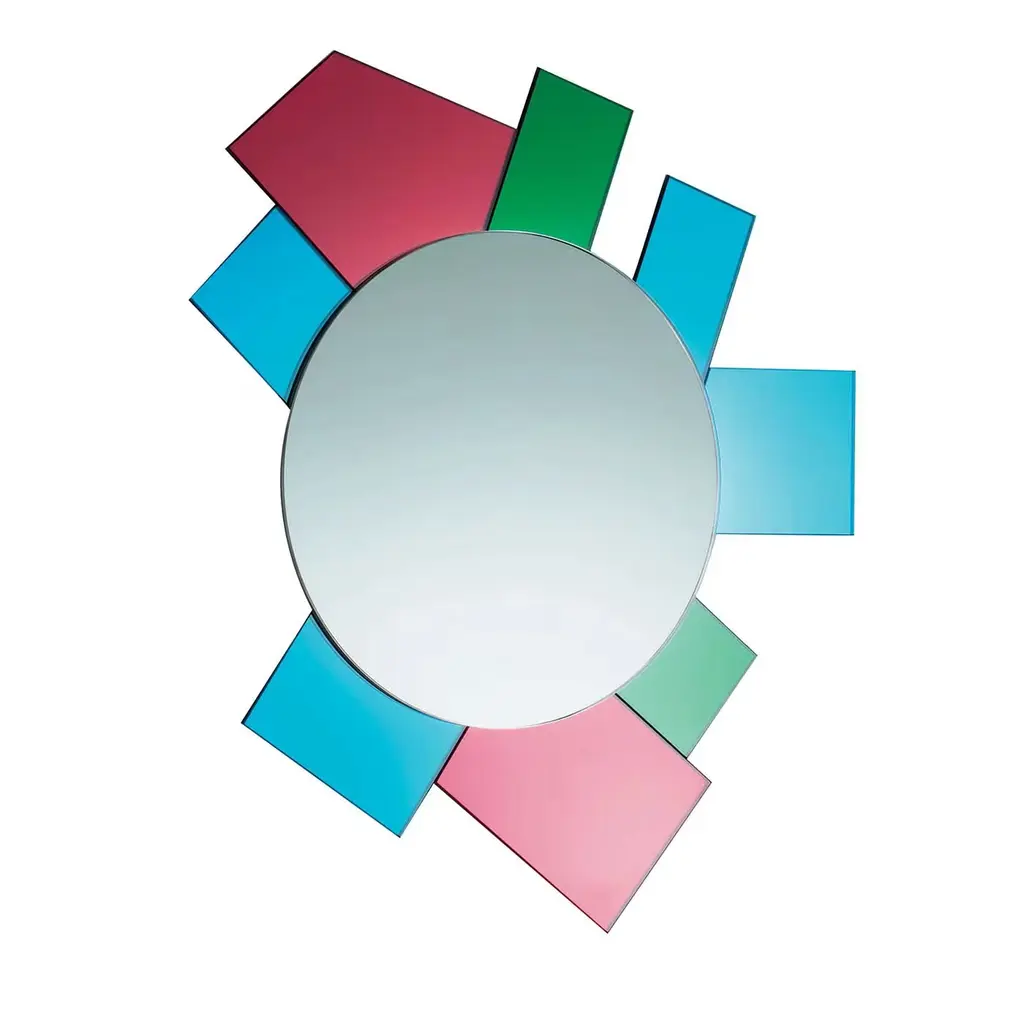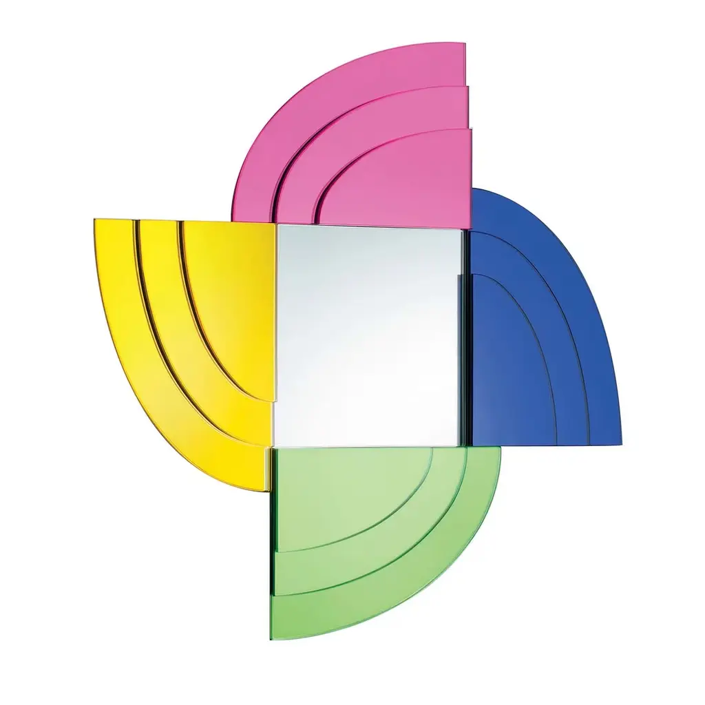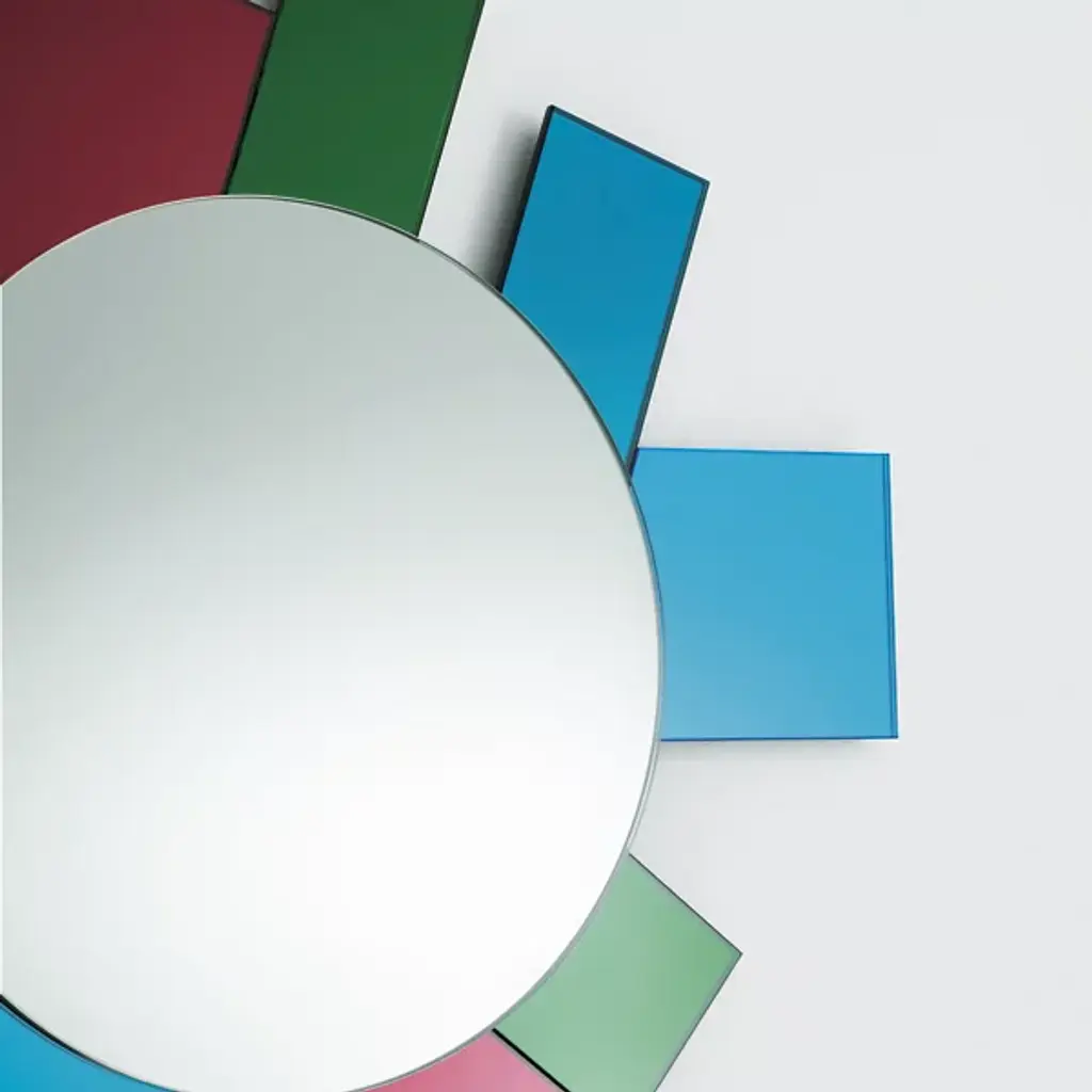 The Specchio di Dioniso 6 from Glas Italia offers a signature artistic accompaniment to indoor walls. An award-winning Ettore Sottsass design accompanied by an array of abstractly angled multichromatic wall plates, Specchio centers a circular reflector that contrasts well with the colorful panes set around it. The laminated and lacquered plates draw the eye inward with rich, contrasting colors and textures, creating an abstract, modern frame for a conventionally shaped mirror.